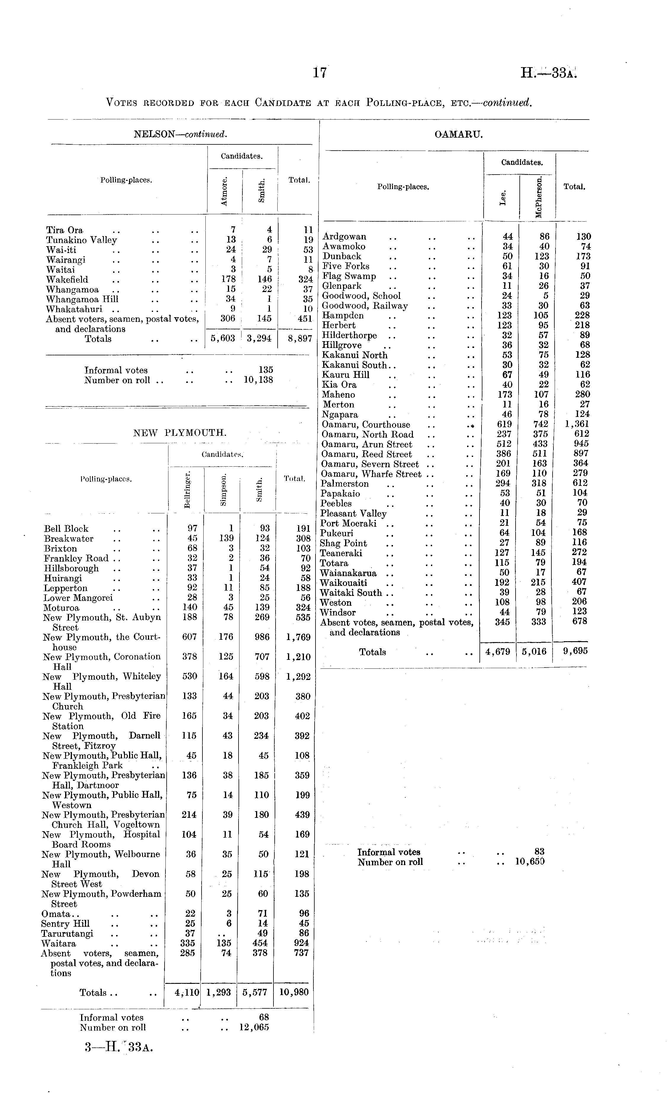 NELSON —continued. OAMARU. Candidates. Candidates. Polling-places. 6 Total. p 0 ,-g Polling-places. & Total. 1 « s I I : Tira Ora .. .. .. 7 4 11 x Tunakino Valley .. .. 13 6 19 Ardgowan 44 86 130 Woi.i+i 24 29 53 Awamoko .. .. .. 34 40 74 Wairangi " " !! 4 7 11 Dunback 50 123 173 Waitai .. .. .. 3 5 8 !]ij ve Forks .. .. .. 61 30 91 Wakefield 178 146 324 J ag Swamp 34 16 50 Whangamoa .. .. .. 15 22 37 Glenpark ... .. .. 11 26 37 Whangamoa Hill .. .. 34 1 35 Goodwood, School .. .. 24 5 29 Whakatahuri 9 1 10 Goodwood, Railway .. .. 33 30 63 Absent voters, seamen, postal votes, 306 145 451 ftampden .. .. .. 123 105 228 and declarations — Herbert 123 95 218 Totals .. .. 5,603 3,294 8,897 Hilderthorpe .. .. .. 32 57 89 Hillgrove .. .. .. 36 32 68 : : Kakanui North .. .. 53 75 128 T p -I , Kakanui South.. .. .. 30 32 62 Informal votes .. .. 135 Kauri. Hill 67 49 116 Number on roll 10,138 Kia Qra 40 22 62 Maheno .. .. .. 173 107 280 - ' -— Merton .. .. .. 11 16 27 Ngapara .. .. .. 46 78 124 Oamaru, Courthouse .. .« 619 742 1,361 NEW PLYMOUTH. Oamaru, North Road .. .. 237 375 612 — — . Oamaru, Arun Street .. .. 512 433 945 Candidates. Oamaru, Reed Street .. .. 386 511 897 Oamaru, Severn Street .. .. 201 163 364 _ , ted t t i Oamaru, Wharfe Street .. .. 169 110 279 Polling-places. | | Total. p almerston 294 g 18 612 S g § Papakaio .. .. .. 53 51 104 pj '<% m Peebles .. .. .. 40 30 70 Pleasant Valley .. .. 11 IB 29 x> ii x>i i an i no , m Port Moeraki .. .. .. 21 54 75 Bell Block .. .. 97 1 93 191 Pukeuri 64 104 168 Breakwater .. .. 45 139 124 308 ghag Point 27 89 116 ? tT w " " oo , H Teaneraki 127 145 272 Frankley Road .. .. 32 2 36 70 Totara 115 79 194 Hillsborough .. .. 37 54 92 Waianakarua 50 17 67 Huirangi .. .. 33 24 58 Waikouaiti 192 2 15 407 Lepperton .. .. 9- .11 85 188 Waitaki South .. .. .. 39 2 8 67 Lower Mangorei .. 28 3 25 56 Weston 108 9g 206 Moturoa .. .. 140 45 139 324 ™ 7q New Plymouth, St. Aubyn 188 78 269 535 ? , *" •* t *; qqq ant Street Absent votes, seamen, postal votes, 345 333 o7» New'piymouth, the Court- 607 176 986 1,769 and declarations New Plymouth, Coronation 378 125 707 1,210 rI ' otals " " 4 ' 679 5 ' 016 9 ' 695 Hall . — — New Plymouth, Whiteley 530 164 598 1,292 Hall New Plymouth, Presbyterian 133 44 203 380 Church New Plymouth, Old Fire 165 34 203 402 Station New Plymouth, Darnell 115 43 234 392 Street, Fitzroy New Plymouth, Public Hall, 45 18 45 108 Frankleigh Park New Plymouth, Presbyterian 136 38 185 I 359 Hall, Dartmoor New Plymouth, Public Hall, 75 14 110 199 Westown New Plymouth, Presbyterian 214 39 180 439 Church Hall, Vogeltown New Plymouth, Hospital 104 11 54 169 Board Rooms New Plymouth, Welbourne 36 35 50 121 Informal votes - • .. 83 |l a [| Number on roll .. .. 10,650 New Plymouth, Devon 58 25 115 198 Street West New Plymouth, Powderham 50 25 60 135 Street Omata.. .. .. 22 3 71 96 Sentry Hill .... 25 6 14 45 Tarurutangi .. .. 37 .. 49 86 Waitara .. .. 335 135 454 924 Absent voters, seamen, 285 74 378 737 postal votes, and declarations Totals.. .. 4,110 1,293 5,577 10,980 Informal votes .... 68 Number on roll .. .. 12,065