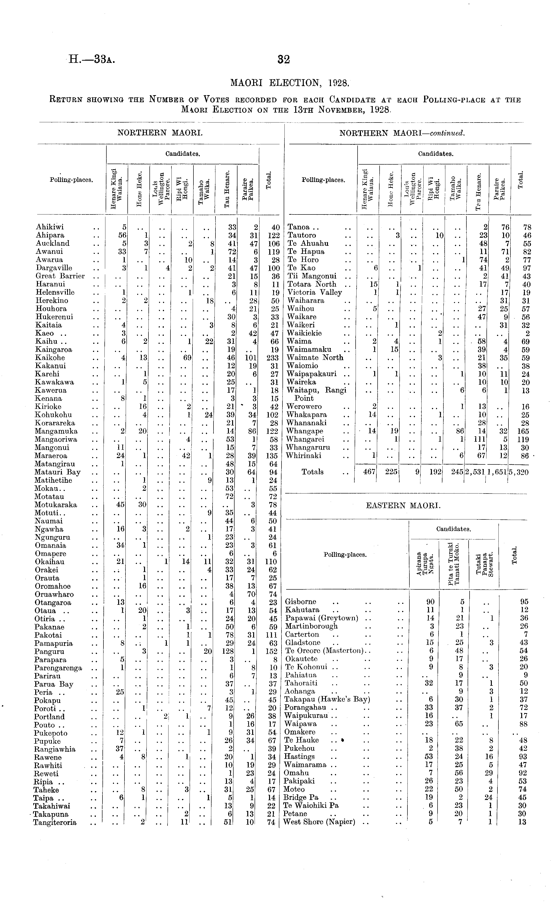 MAORI ELECTION, 1928. Return showing the Number of Votes recorded for each Candidate at each Polling-place at the Maori Election on the 13th November, 1928.