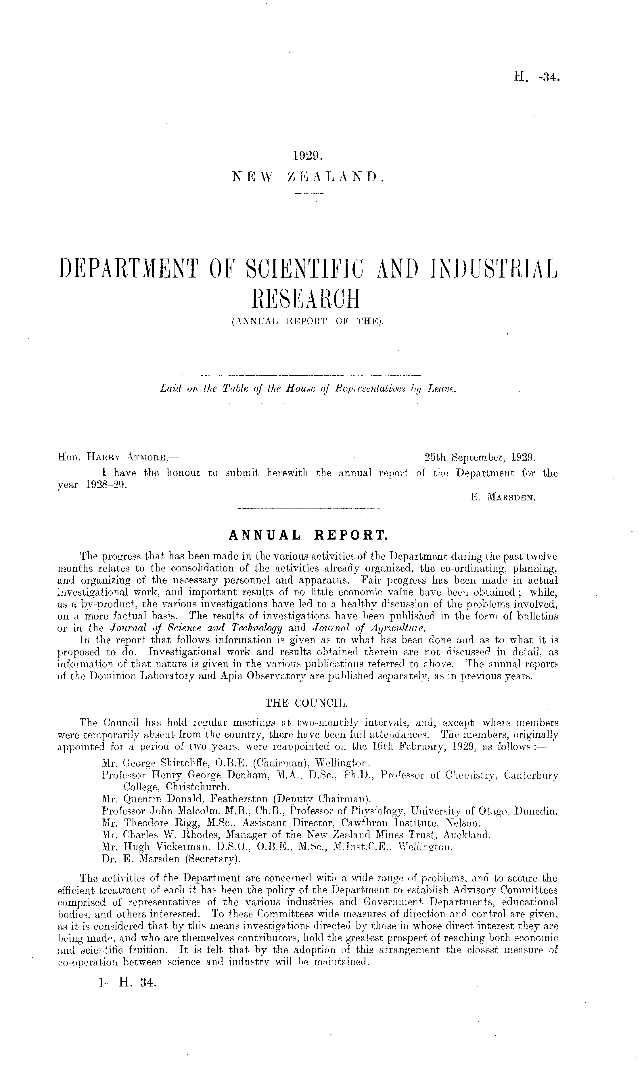 ANNUAL REPORT. The progress that has been made in the various activities of the Department during the past twelve months relates to the consolidation of the activities already organized, the co-ordinating, planning, and organizing of the necessary personnel and apparatus. Fair progress has been made in actual investigational work, and important results of no little economic value have been obtained ; while, as a by-product, the various investigations have led to a healthy discussion of the problems involved, on a more factual basis. The results of investigations have been published in the form of bulletins or in the Journal of Science and Technology and Journal of Agriculture. In the report that follows information is given as to what has been done and as to what it is proposed to do. Investigational work and results obtained therein are not discussed in detail, as information of that nature is given in the various publications referred to above. The annual reports of the Dominion Laboratory and Apia Observatory are published separately, as in previous years. THE COUNCIL. The Council has held regular meetings at two-monthly intervals, and, except where members were temporarily absent from the country, there have been full attendances. The members, originally appointed for a period of two years, were reappointed on the 15th February, 1929, as follows : — Mr. George Shirtcliffe, 0.8. E. (Chairman), Wellington. Professor Henry George Denham, M.A V D.Sc., Ph.D., Professor of Chemistry, Canterbury College, Christchurch. Mr. Quentin Donald, Featherston (Deputy Chairman). Professor John Malcolm, M.8., Ch.B., Professor of Physiology, University of Otago, Dunedin. Mr. Theodore Rigg, M.Sc., Assistant Director, Cawthron Institute, Nelson. Mr. Charles W. Rhodes, Manager of the New Zealand Mines Trust, Auckland. Mr. Hugh Vickerman, D.5.0., 0.8. E., M.Sc., M.lnst.C.E., Wellington. Dr. E. Marsden (Secretary). The activities of the Department are concerned with a wide range of problems, and to secure the efficient treatment of each it has been the policy of the Department to establish Advisory Committees comprised of representatives of the various industries and Government Departments, educational bodies, and others interested. To these Committees wide measures of direction and control are given, as it is considered that by this means investigations directed by those in whose direct interest they are being made, and who are themselves contributors, hold the greatest prospect of reaching both economic and scientific fruition. It is felt that by the adoption of this arrangement the closest measure of co-operation between science and industry will be maintained.