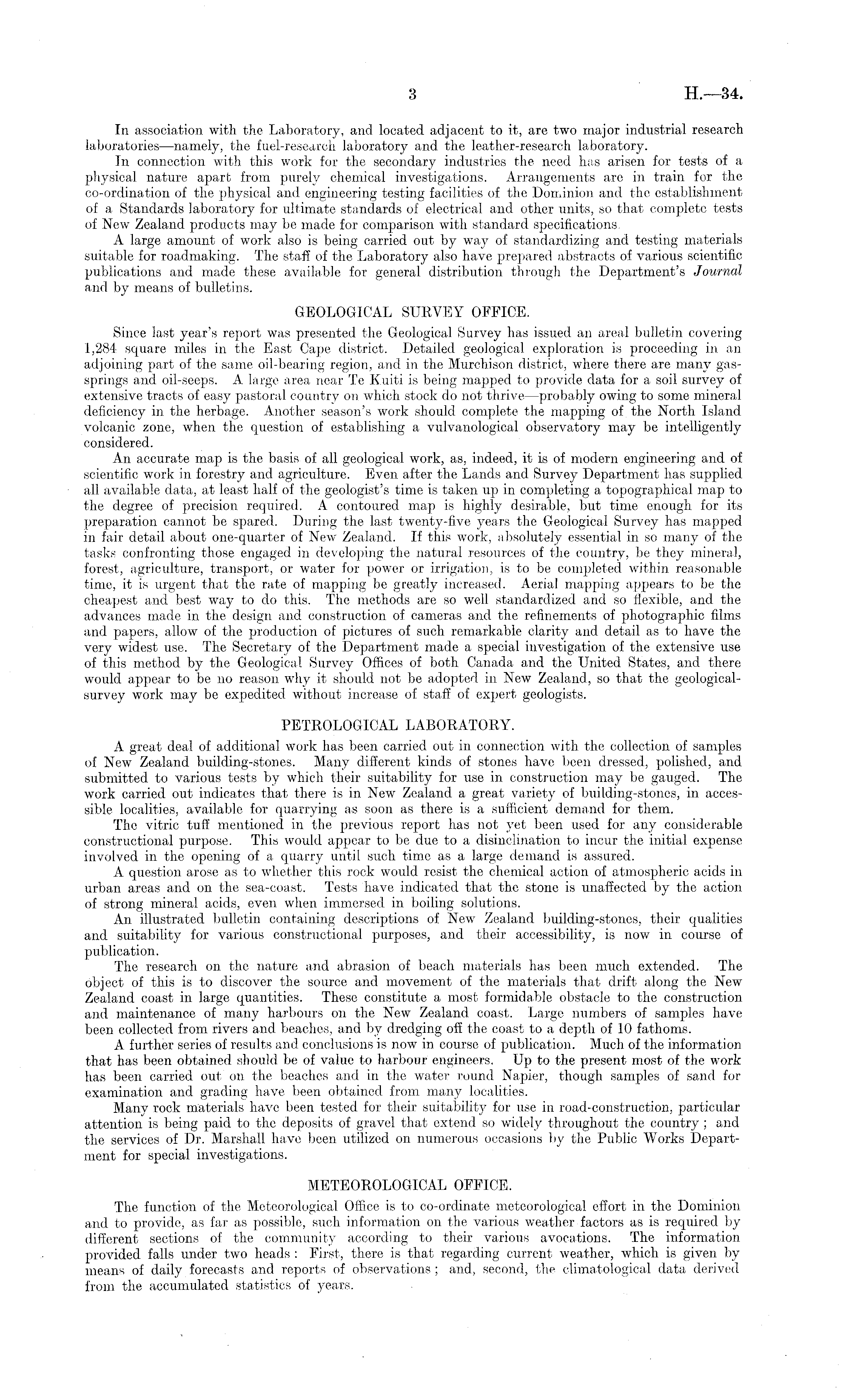 In association with the Laboratory, and located adjacent to it, are two major industrial research laboratories —namely, the fuel-research laboratory and the leather-research laboratory. In connection with this work for the secondary industries the need has arisen for tests of a physical nature apart from purely chemical investigations. Arrangements are in train for the co-ordination of the physical and engineering testing facilities of the Dominion and the establishment of a Standards laboratory for ultimate standards of electrical and other units, so that complete tests of New Zealand products may be made for comparison with standard specifications, A large amount of work also is being carried out by way of standardizing and testing materials suitable for roadmaking. The staff of the Laboratory also have prepared abstracts of various scientific publications and made these available for general distribution through the Department's Journal and by means of bulletins. GEOLOGICAL SURVEY OFFICE. Since last year's report was presented the Geological Survey has issued an areal bulletin covering 1,284 square miles in the East Cape district. Detailed geological exploration is proceeding in an adjoining part of the same oil-bearing region, and in the Murchison district, where there are many gassprings and oil-seeps. A large area near Te Kuiti is being mapped to provide data for a soil survey of extensive tracts of easy pastoral country on which stock do not thrive —probably owing to some mineral deficiency in the herbage. Another season's work should complete the mapping of the North Island volcanic zone, when the question of establishing a vulvanological observatory may be intelligently considered. An accurate map is the basis of all geological work, as, indeed, it is of modern engineering and of scientific work in forestry and agriculture. Even after the Lands and Survey Department has supplied all available data, at least half of the geologist's time is taken up in completing a topographical map to the degree of precision required. A contoured map is highly desirable, but time enough for its preparation cannot be spared. During the last twenty-five years the Geological Survey has mapped in fair detail about one-quarter of New Zealand. If this work, absolutely essential in so many of the tasks confronting those engaged in developing the natural resources of the country, be they mineral, forest, agriculture, transport, or water for power or irrigation, is to be completed within reasonable time, it is urgent that the rate of mapping be greatly increased. Aerial mapping appears to be the cheapest and best way to do this. The methods are so well standardized and so flexible, and the advances made in the design and construction of cameras and the refinements of photographic films and papers, allow of the production of pictures of such remarkable clarity and detail as to have the very widest use. The Secretary of the Department made a special investigation of the extensive use of this method by the Geological Survey Offices of both Canada and the United States, and there would appear to be no reason why it should not be adopted in New Zealand, so that the geologicalsurvey work may be expedited without increase of staff of expert geologists. PETROLOGICAL LABORATORY. A great deal of additional work has been carried out in connection with the collection of samples of New Zealand building-stones. Many different kinds of stones have been dressed, polished, and submitted to various tests by which their suitability for use in construction may be gauged. The work carried out indicates that there is in New Zealand a great variety of building-stones, in accessible localities, available for quarrying as soon as there is a sufficient demand for them. The vitric tuff mentioned in the previous report has not yet been used for any considerable constructional purpose. This would appear to be due to a disinclination to incur the initial expense involved in the opening of a quarry until such time as a large demand is assured. A question arose as to whether this rock would resist the chemical action of atmospheric acids in urban areas and on the sea-coast. Tests have indicated that the stone is unaffected by the action of strong mineral acids, even when immersed in boiling solutions. An illustrated bulletin containing descriptions of New Zealand building-stones, their qualities and suitability for various constructional purposes, and their accessibility, is now in course of publication. The research on the nature and abrasion of beach materials has been much extended. The object of this is to discover the source and movement of the materials that drift along the New Zealand coast in large quantities. These constitute a most formidable obstacle to the construction and maintenance of many harbours on the New Zealand coast. Large numbers of samples have been collected from rivers and beaches, and by dredging off the coast to a depth of 10 fathoms. A further series of results and conclusions is now in course of publication. Much of the information that has been obtained should be of value to harbour engineers. Up to the present most of the work has been carried out on the beaches and in the water round Napier, though samples of sand for examination and grading have been obtained from many localities. Many rock materials have been tested for their suitability for use in road-construction, particular attention is being paid to the deposits of gravel that extend so widely throughout the country ; and the services of Dr. Marshall have been utilized on numerous occasions by the Public Works Department for special investigations. METEOROLOGICAL OFFICE. The function of the Meteorological Office is to co-ordinate meteorological effort in the Dominion and to provide, as far as possible, such information on the various weather factors as is required by different sections of the community according to their various avocations. Th