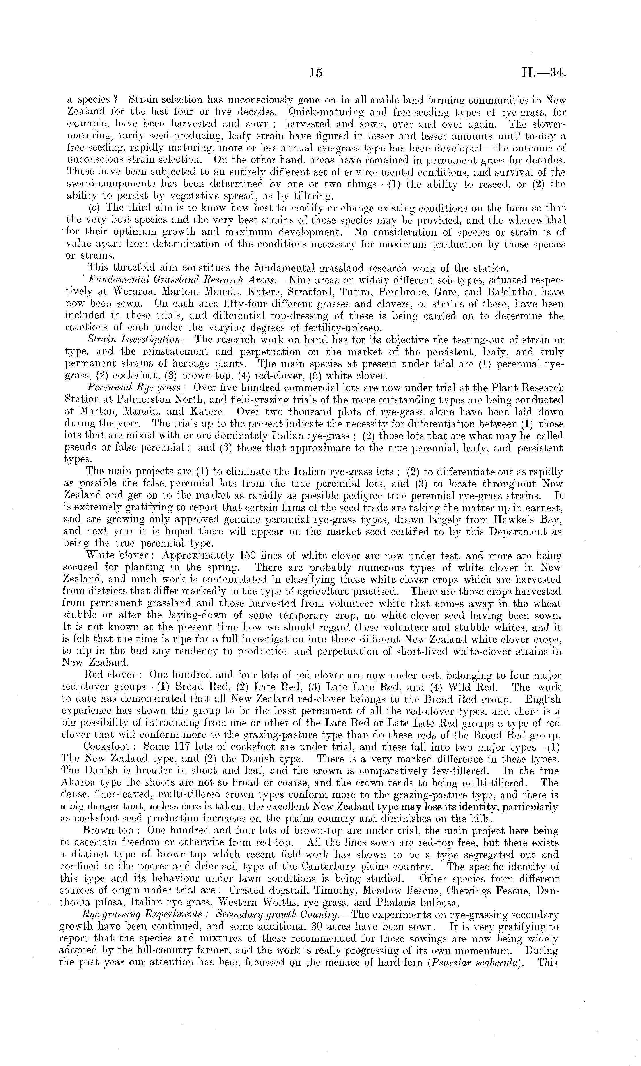 a species ? Strain-selection has unconsciously gone on in all arable-land farming communities in New Zealand for the last four or five decades. Quick-maturing and free-seeding types of rye-grass, for example, have been harvested and sown ; harvested and sown, over and over again. The slowermaturing, tardy seed-producing, leafy strain have figured in lesser and lesser amounts until to-day a free-seeding, rapidly maturing, more or less annual rye-grass type has been developed —the outcome of unconscious strain-selection. On the other hand, areas have remained in permanent grass for decades. These have been subjected to an entirely different set of environmental conditions, and survival of the sward-components has been determined by one or two things —(1) the ability to reseed, or (2) the ability to persist by vegetative spread, as by tillering. (c) The third aim is to know how best to modify or change existing conditions on the farm so that the very best species and the very best strains of those species may be provided, and the wherewithal for their optimum growth and maximum development. No consideration of species or strain is of value apart from determination of the conditions necessary for maximum production by those species or strains. This threefold aim constitues the fundamental grassland research work of the station. Fundamental Grassland Research Areas. —Nine areas on widely different soil-types, situated respectively at Weraroa, Marton, Manaia, Katere, Stratford, Tutira, Pembroke, Gore, and Balclutha, have now been sown. On each area fifty-four different grasses and clovers, or strains of these, have been included in these trials, and differential top-dressing of these is being carried on to determine the reactions of each under the varying degrees of fertility-upkeep. Strain Investigation.—The research work on hand has for its objective the testing-out of strain or type, and the reinstatement and perpetuation on the market of the persistent, leafy, and truly permanent strains of herbage plants. TJie main species at present under trial are (1) perennial ryegrass, (2) cocksfoot, (3) brown-top, (4) red-clover, (5) white clover. Perennial Rye-grass : Over five hundred commercial lots are now under trial at the Plant Research Station at Palmerston North, and field-grazing trials of the more outstanding types are being conducted at Marton, Manaia, and Katere. Over two thousand plots of rye-grass alone have been laid down during the year. The trials up to the present indicate the necessity for differentiation between (1) those lots that are mixed with or are dominately Italian rye-grass ; (2) those lots that are what may be called pseudo or false perennial; and (3) those that approximate to the true perennial, leafy, and persistent types. The main projects are (1) to eliminate the Italian rye-grass lots ; (2) to differentiate out as rapidly as possible the false perennial lots from the true perennial lots, and (3) to locate throughout New Zealand and get on to the market as rapidly as possible pedigree true perennial rye-grass strains. It is extremely gratifying to report that certain firms of the seed trade are taking the matter up in earnest, and are growing only approved genuine perennial rye-grass types, drawn largely from Hawke's Bay, and next year it is hoped there will appear on the market seed certified to by this Department as being the true perennial type. White clover : Approximately 150 lines of white clover are now under test, and more are being secured for planting in the spring. There are probably numerous types of white clover in New Zealand, and much work is contemplated in classifying those white-clover crops which are harvested from districts that differ markedly in the type of agriculture practised. There are those crops harvested from permanent grassland and those harvested from volunteer white that comes away in the wheat stubble or after the laying-down of some temporary crop, no white-clover seed having been sown. It is not known at the present time how we should regard these volunteer and stubble whites, and it is felt that the time is ripe for a full investigation into those different New Zealand white-clover crops, to nip in the bud any tendency to production and perpetuation of short-lived white-clover strains in New Zealand. Red clover : One hundred and four lots of red clover are now under test, belonging to four major red-clover groups —(1) Broad Red, (2) Late Red, (3) Late Late' Red, and (4) Wild Red. The work to date has demonstrated, that all New Zealand red-clover belongs to the Broad Red group. English experience has shown this group to be the least permanent of all the red-clover types, and there is a big possibility of introducing from one or other of the Late Red or Late Late Red groups a type of red clover that will conform more to the grazing-pasture type than do these reds of the Broad Red group. Cocksfoot: Some 117 lots of cocksfoot are under trial, and these fall into two major types —(1) The New Zealand type, and (2) the Danish type. There is a very marked difference in these types. The Danish is broader in shoot and leaf, and the crown is comparatively few-tillered. In the true Akaroa type the shoots are not so broad or coarse, and the crown tends to being multi-tillered. The dense, finer-leaved, multi-tillered crown types conform more to the grazing-pasture type, and there is a big danger that, unless care is taken, the excellent New Zealand type may lose its identity, particularly as cocksfoot-seed production increases on the plains country and diminishes on the hills. Brown-top : One hundred and four lots of brown-top are under trial, the main project here being to ascertain freedom or otherwise from red-top. All the lines sown are red-top free, but there exists a distinct type of brown-top which recent field-work has shown to be a type segregated out and confined to the poorer and drier soil type of the Canterbury plains, c
