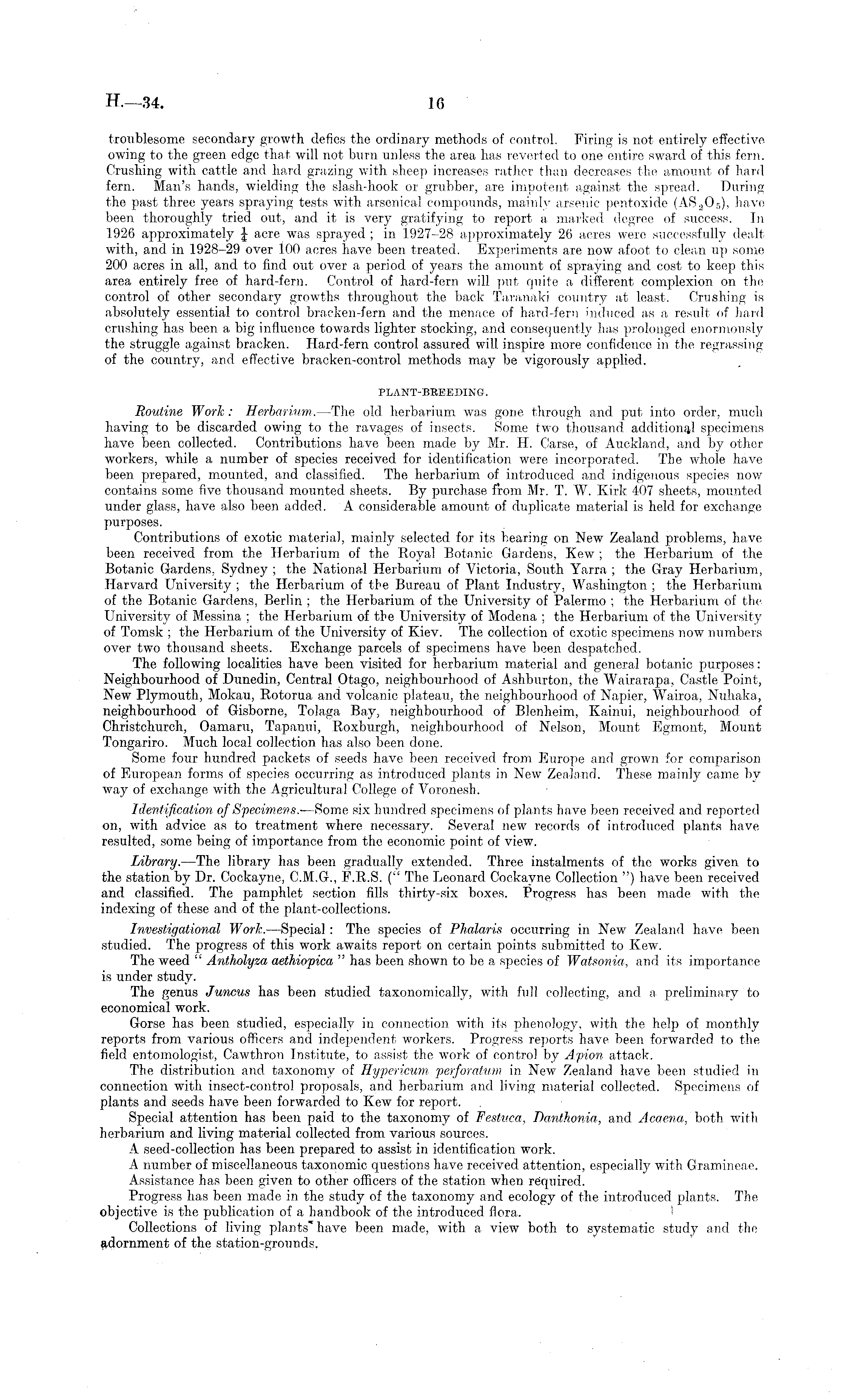 troublesome secondary growth defies the ordinary methods of control. Firing is not entirely effective owing to the green edge that, will not burn unless the area has reverted to one entire sward of this fern. Crushing with cattle and hard grazing with sheep increases rather than decreases the amount of hard fern. Man's hands, wielding the slash-hook or grubber, are impotent against the spread. During the past three years spraying tests with arsenical compounds, mainly arsenic pentoxide (AS 2 O S ), have been thoroughly tried out, and it is very gratifying to report a marked degree of success. In 1926 approximately \ acre was sprayed ; in 1927-28 approximately 26 acres were successfully dealt with, and in 1928-29 over 1.00 acres have been treated. Experiments are now afoot to clean up some 200 acres in all, and to find out over a period of years the amount of spraying and cost to keep this area entirely free of hard-fern. Control of hard-fern will put quite a different complexion on the control of other secondary growths throughout the back Taranaki country at least. Crushing is absolutely essential to control bracken-fern and the menace of hard-fern induced as a result of hard crushing has been a big influence towards lighter stocking, and consequently has prolonged enormously the struggle against bracken. Hard-fern control assured will inspire more confidence in the regrassing of the country, and effective bracken-control methods may be vigorously applied. PLANT-BREEDING. Routine Work : Herbarium.—The old herbarium was gone through and put into order, much having to be discarded owing to the ravages of insects. Some two thousand additional specimens have been collected. Contributions have been made by Mr. H. Carse, of Auckland, and by other workers, while a number of species received for identification were incorporated. The whole have been prepared, mounted, and classified. The herbarium of introduced and indigenous species now contains some five thousand mounted sheets. By purchase from Mr. T. W. Kirk 407 sheets, mounted under glass, have also been added. A considerable amount of duplicate material is held for exchange purposes. Contributions of exotic material, mainly selected for its bearing on New Zealand problems, have been received from the Herbarium of the Royal Botanic Gardens, Kew ; the Herbarium of the Botanic Gardens, Sydney ; the National Herbarium of Victoria, South Yarra ; the Gray Herbarium, Harvard University ; the Herbarium of the Bureau of Plant Industry, Washington ; the Herbarium of the Botanic Gardens, Berlin ; the Herbarium of the University of Palermo ; the Herbarium of the University of Messina ; the Herbarium of the University of Modena ; the Herbarium of the University of Tomsk ; the Herbarium of the University of Kiev. The collection of exotic specimens now numbers over two thousand sheets. Exchange parcels of specimens have been despatched. The following localities have been visited for herbarium material and general botanic purposes: Neighbourhood of Dunedin, Central Otago, neighbourhood of Ashburton, the Wairarapa, Castle Point, New Plymouth, Mokau, Rotorua and volcanic plateau, the neighbourhood of Napier, Wairoa, Nuhaka, neighbourhood of Gisborne, Tolaga Bay, neighbourhood of Blenheim, Kainui, neighbourhood of Christchurch, Oamaru, Tapanui, Roxburgh, neighbourhood of Nelson, Mount Egmont, Mount Tongariro. Much local collection has also been done. Some four hundred packets of seeds have been received from Europe and grown for comparison of European forms of species occurring as introduced plants in New Zealand. These mainly came by way of exchange with the Agricultural College of Voronesh. Identification of Specimens.—Some six hundred specimens of plants have been received and reported on, with advice as to treatment where necessary. Several new records of introduced plants have resulted, some being of importance from the economic point of view. Library.-—The library has been gradually extended. Three instalments of the works given to the station by Dr. Cockayne, C.M.G., F.R.S. (" The Leonard Cockayne Collection ") have been received and classified. The pamphlet section fills thirty-six boxes. Progress has been made with the indexing of these and of the plant-collections. Investigational Work.—Special: The species of Phalaris occurring in New Zealand have been studied. The progress of this work awaits report on certain points submitted to Kew. The weed " Antholyza aethiopica " has been shown to be a species of Watsonia, and its importance is under study. The genus Juncus has been studied taxonomically, with full collecting, and a preliminary to economical work. Gorse has been studied, especially in connection with its phenology, with the help of monthly reports from various officers and independent workers. Progress reports have been forwarded to the field entomologist, Cawthron Institute, to assist the work of control by Apion attack. The distribution and taxonomy of Hypericum perforatum in New Zealand have been studied in connection with insect-control proposals, and herbarium and living material collected. Specimens of plants and seeds have been forwarded to Kew for report. Special attention has been paid to the taxonomy of Festuca, Danthonia, and Acaena, both with herbarium and living material collected from various sources. A seed-collection has been prepared to assist in identification work. A number of miscellaneous taxonomic questions have received attention, especially with Gramineae. Assistance has been given to other officers of the station when required. Progress has been made in the study of the taxonomy and ecology of the introduced plants. The objective is the publication of a handbook of the introduced flora. I Collections of living plants'* have been made, with a view both to systematic study and the adornment of the station-grounds,