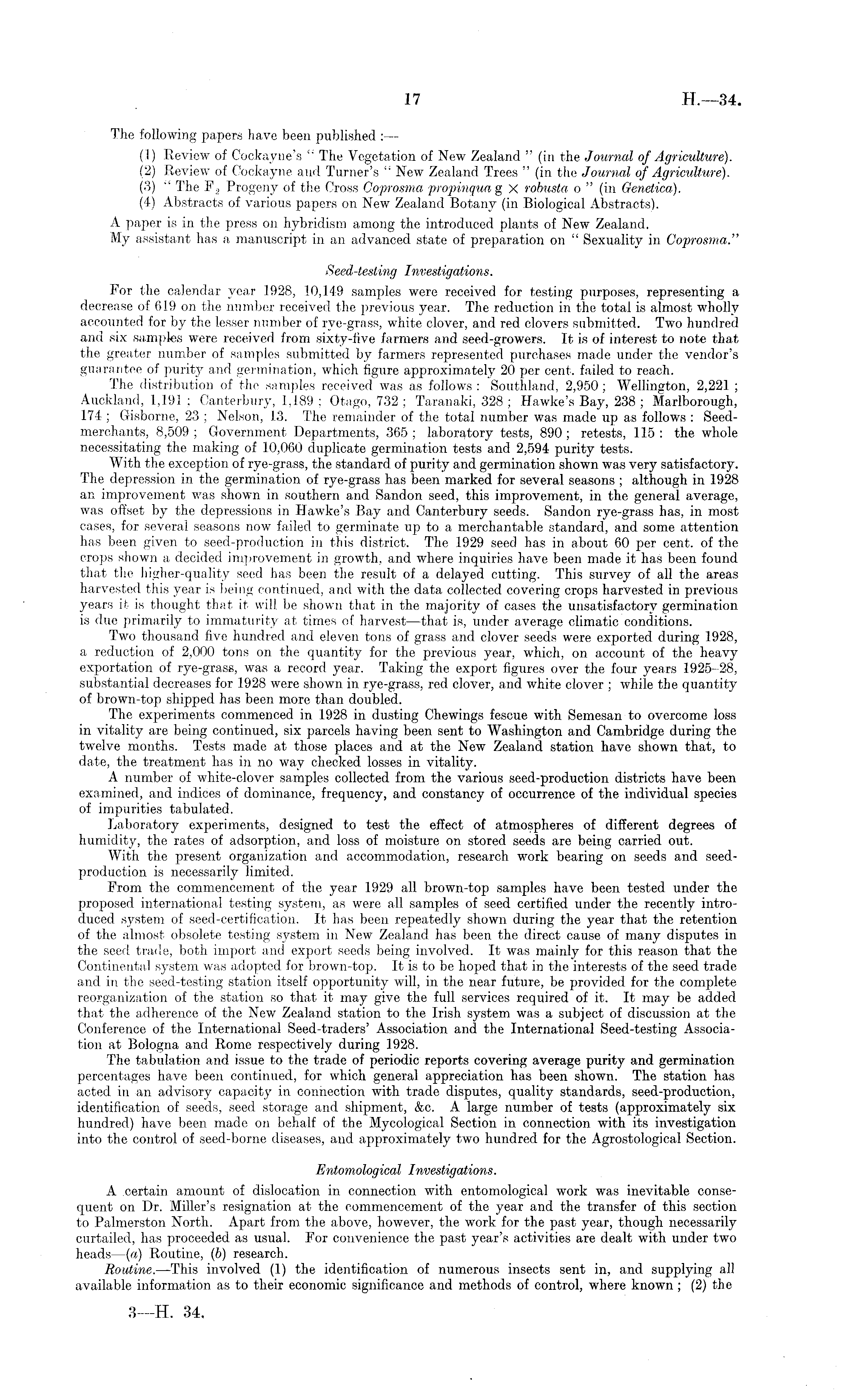The following papers have been published : — (1) Review of Cockayne's " The Vegetation of New Zealand " (in the Journal of Agriculture). (2) Review of Cockayne and Turner's " New Zealand Trees " (in the Journal of Agriculture). (3) " The F 2 Progeny of the Cross Co-prosma propinqua g x robusta o " (in Genetica). (4) Abstracts of various papers on New Zealand Botany (in Biological Abstracts). A paper is in the press on hybridism among the introduced plants of New Zealand. My assistant has a manuscript in an advanced state of preparation on " Sexuality in Coprosma." Seed-testing Investigations. For the calendar year 1928, 10,149 samples were received for testing purposes, representing a decrease of 619 on the number received the previous year. The reduction in the total is almost wholly accounted for by the lesser number of rve-grass, white clover, and red clovers submitted. Two hundred and six samples were received from sixty-five farmers and seed-growers. It is of interest to note that the greater number of samples submitted by farmers represented purchases made under the vendor's guarantee of purity and germination, which figure approximately 20 per cent, failed to reach. The distribution of the samples received was as follows : Southland, 2,950 ; Wellington, 2,221 ; Auckland, 1,191 ; Canterbury, 1,189 ; Otago, 732 ; Taranaki, 328 ; Hawke's Bay, 238 ; Marlborough, 174 ; Gisborne, 23 ; Nelson, 13. The remainder of the total number was made up as follows : Seedmerchants, 8,509 ; Government Departments, 365 ; laboratory tests, 890 ; retests, 115 : the whole necessitating the making of 10,060 duplicate germination tests and 2,594 purity tests. With the exception of rye-grass, the standard of purity and germination shown was very satisfactory. The depression in the germination of rye-grass has been marked for several seasons ; although in 1928 an improvement was shown in southern and Sandon seed, this improvement, in the general average, was offset by the depressions in Hawke's Bay and Canterbury seeds. Sandon rye-grass has, in most cases, for several seasons now failed to germinate up to a merchantable standard, and some attention has been given to seed-production in this district. The 1929 seed has in about 60 per cent, of the crops shown a decided improvement in growth, and where inquiries have been made it has been found that the higher-quality seed has been the result of a delayed cutting. This survey of all the areas harvested this year is being continued, and with the data collected covering crops harvested in previous years it is thought that it will be shown that in the majority of cases the unsatisfactory germination is due primarily to immaturity at times of harvest —that is, under average climatic conditions. Two thousand five hundred and eleven tons of grass and clover seeds were exported during 1928, a reduction of 2,000 tons on the quantity for the previous year, which, on account of the heavy exportation of rye-grass, was a record year. Taking the export figures over the four years 1925-28, substantial decreases for 1928 were shown in rye-grass, red clover, and white clover ; while the quantity of brown-top shipped has been more than doubled. The experiments commenced in 1928 in dusting Che wings fescue with Semesan to overcome loss in vitality are being continued, six parcels having been sent to Washington and Cambridge during the twelve months. Tests made at those places and at the New Zealand station have shown that, to date, the treatment has in no way checked losses in vitality. A number of white-clover samples collected from the various seed-production districts have been examined, and indices of dominance, frequency, and constancy of occurrence of the individual species of impurities tabulated. Laboratory experiments, designed to test the effect of atmospheres of different degrees of humidity, the rates of adsorption, and loss of moisture on stored seeds are being carried out. With the present organization and accommodation, research work bearing on seeds and seedproduction is necessarily limited. From the commencement of the year 1929 all brown-top samples have been tested under the proposed international testing system, as were all samples of seed certified under the recently introduced system of seed-certification. It has been repeatedly shown during the year that the retention of the almost obsolete testing system in New Zealand has been the direct cause of many disputes in the seed trade, both import and export seeds being involved. It was mainly for this reason that the Continental system was adopted for brown-top. It is to be hoped that in the interests of the seed trade and in the seed-testing station itself opportunity will, in the near future, be provided for the complete reorganization of the station so that it may give the full services required of it. It may be added that the adherence of the New Zealand station to the Irish system was a subject of discussion at the Conference of the International Seed-traders' Association and the International Seed-testing Association at Bologna and Rome respectively during 1928. The tabulation and issue to the trade of periodic reports covering average purity and germination percentages have been continued, for which general appreciation has been shown. The station has acted in an advisory capacity in connection with trade disputes, quality standards, seed-production, identification of seeds, seed storage and shipment, &c. A large number of tests (approximately six hundred) have been made on behalf of the Mycological Section in connection with its investigation into the control of seed-borne diseases, and approximately two hundred for the Agrostological Section. Entomological Investigations. A certain amount of dislocation in connection with entomological work was inevitable consequent on Dr. Miller's resignation at the commencement of the year and the transfer of this section to Palmerston North. Apart from the abov