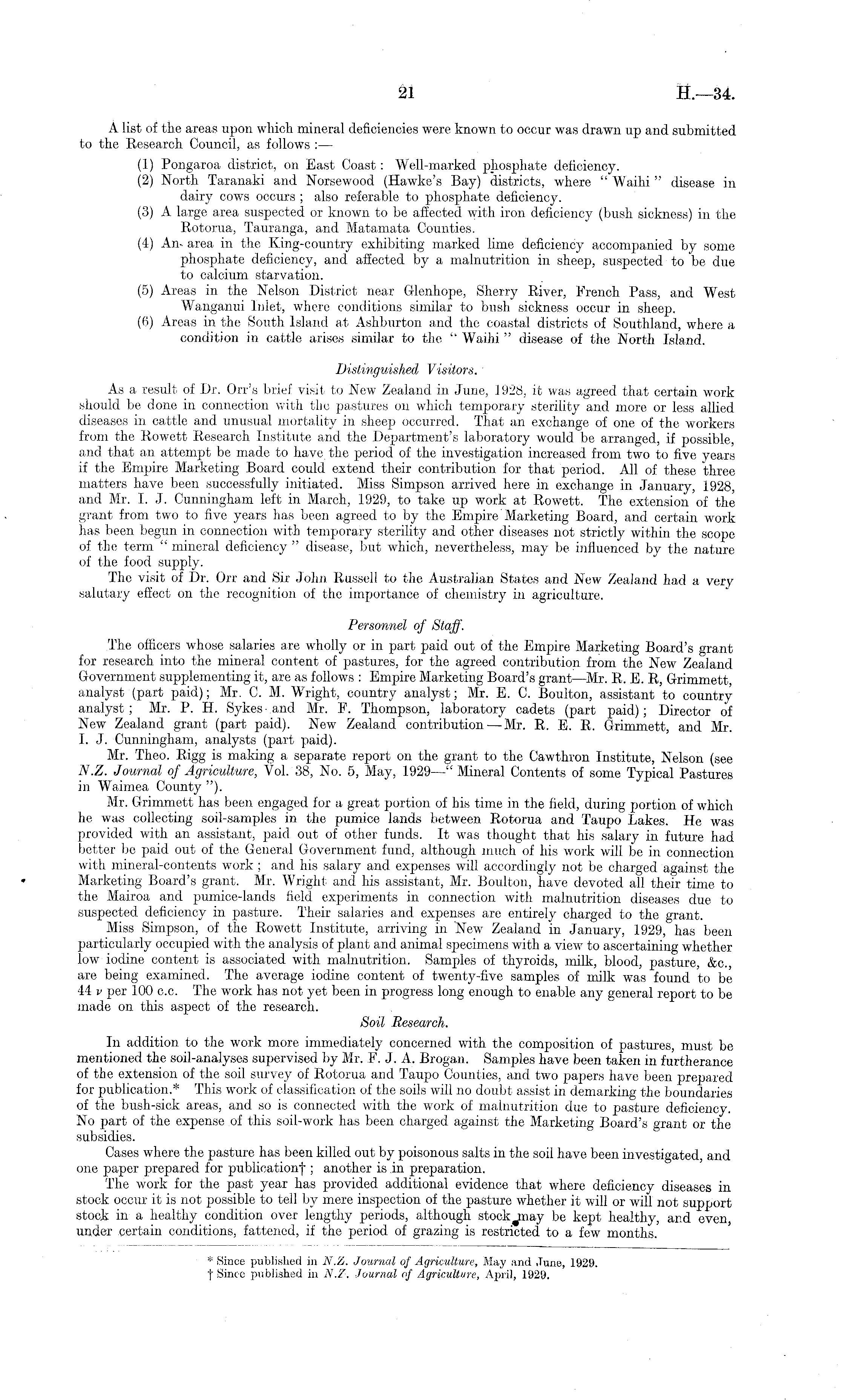 A list of the areas upon which mineral deficiencies were known to occur was drawn up and submitted to the Research Council, as follows :— (1) Pongaroa district, on East Coast: Well-marked phosphate deficiency. (2) North Taranaki and Norsewood (Hawke's Bay) districts, where " Waihi " disease in dairy cows occurs ; also referable to phosphate deficiency. (3) A large area suspected or known to be affected with iron deficiency (bush sickness) in the Rotorua, Tauranga, and Matamata Counties. (4) An- area in the King-country exhibiting marked lime deficiency accompanied by some phosphate deficiency, and affected by a malnutrition in sheep, suspected to be due to calcium starvation. (5) Areas in the Nelson District near Glenhope, Sherry River, French Pass, and West Wanganui Inlet, where conditions similar to bush sickness occur in sheep. (6) Areas in the South Island at Ashburton and the coastal districts of Southland, where a condition in cattle arises similar to the " Waihi " disease of the North Island. Distinguished Visitors. As a result of Dr. Orr's brief visit to New Zealand in June, 1928, it was agreed that certain work should be done in connection with the pastures on which temporary sterility and more or less allied diseases in cattle and unusual mortality in sheep occurred. That an exchange of one of the workers from the Rowett Research Institute and the Department's laboratory would be arranged, if possible, and that an attempt be made to have, the period of the investigation increased from two to five years if the Empire Marketing Board could extend their contribution for that period. All of these "three matters have been successfully initiated. Miss Simpson arrived here in exchange in January, 1928, and Mr. I. J. Cunningham left in March, 1929, to take up work at Rowett. The extension of the grant from two to five years has been agreed to by the Empire Marketing Board, and certain work has been begun in connection with temporary sterility and other diseases not strictly within the scope of the term " mineral deficiency " disease, but which, nevertheless, may be influenced by the nature of the food supply. The visit of Dr. Orr and Sir John Russell to the Australian States and New Zealand had a very salutary effect on the recognition of the importance of chemistry in agriculture. Personnel of Staff. The officers whose salaries are wholly or in part paid out of the Empire Marketing Board's grant for research into the mineral content of pastures, for the agreed contribution from the New Zealand Government supplementing it, are as follows : Empire Marketing Board's grant —Mr. R. E. R, Grimmett, analyst (part paid); Mr. C. M. Wright, country analyst; Mr. E. C. Boulton, assistant to country analyst ; Mr. P. H. Sykes • and Mr. E. Thompson, laboratory cadets (part paid); Director of New Zealand grant (part paid). New Zealand contribution — Mr. R. E. R. Grimmett, and Mr. I. J. Cunningham, analysts (part paid). Mr. Theo. Rigg is making a separate report on the grant to the Cawthron Institute, Nelson (see N.Z. Journal of Agriculture, Vol. 38, No. 5, May, 1929 —" Mineral Contents of some Typical Pastures in Waimea County "). Mr. Grimmett has been engaged for a great portion of his time in the field, during portion of which he was collecting soil-samples in the pumice lands between Rotorua and Taupo Lakes. He was provided with an assistant, paid out of other funds. It was thought that his salary in future had better be paid out of the General Government fund, although much of his work will be in connection with mineral-contents work ; and his salary and expenses will accordingly not be charged against the Marketing Board's grant. Mr. Wright and his assistant, Mr. Boulton, have devoted all their time to the Mairoa and pumice-lands field experiments in connection with malnutrition diseases due to suspected deficiency in pasture. Their salaries and expenses are entirely charged to the grant. Miss Simpson, of the Rowett Institute, arriving in "New Zealand in January, 1929, has been particularly occupied with the analysis of plant and animal specimens with a view to ascertaining whether low iodine content is associated with malnutrition. Samples of thyroids, milk, blood, pasture, &c., are being examined. The average iodine content of twenty-five samples of milk was found to be 44- v per 100 c.c. The work has not yet been in progress long enough to enable any general report to be made on this aspect of the research. Soil Research. In addition to the work more immediately concerned with the composition of pastures, must be mentioned the soil-analyses supervised by Mr. F. J. A. Brogan. Samples have been taken in furtherance of the extension of the soil survey of Rotorua and Taupo Counties, and two papers have been prepared for publication.* This work of classification of the soils will no doubt assist in demarking the boundaries of the bush-sick areas, and so is connected with the work of malnutrition due to pasture deficiency. No part of the expense of this soil-work has been charged against the Marketing Board's grant or the subsidies. Cases where the pasture has been killed out by poisonous salts in the soil have been investigated, and one paper prepared for publication! ; another is in preparation. The work for the past year has provided additional evidence that where deficiency diseases in stock occur it is not possible to tell by mere inspection of the pasture whether it will or will not support stock in a healthy condition over lengthy periods, although stock may be kept healthy, and even, under certain conditions, fattened, if the period of grazing is restricted to a few months.