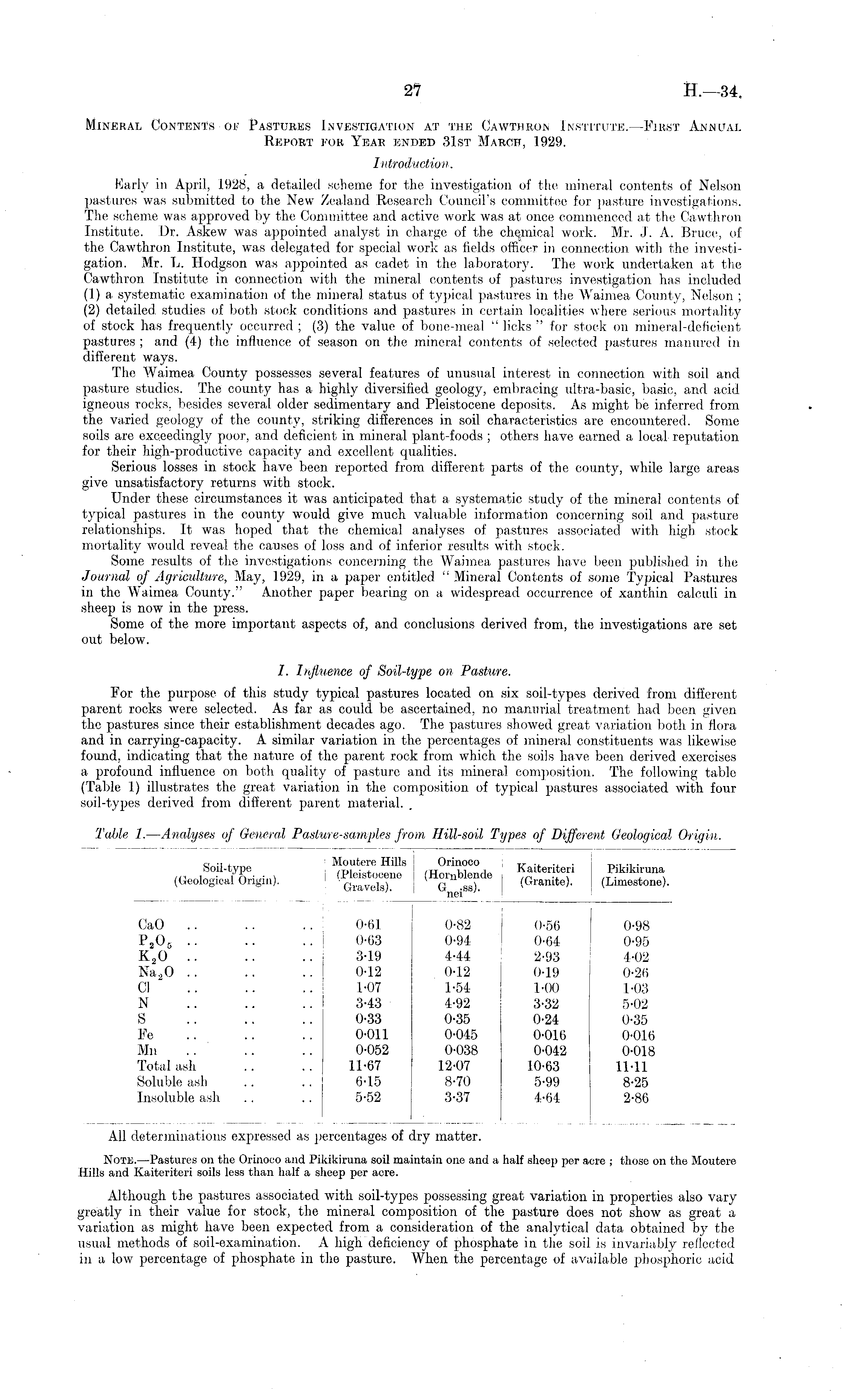 Mineral Contents of Pastures Investigation at the Cawthron Institute.—First Annual Report for Year ended 31st March, 1929. Introduction. Early in April, 1928, a detailed scheme for the investigation of the mineral contents of Nelson pastures was submitted to the New Zealand Research Council's committee for pasture investigations. The scheme was approved by the Committee and active work was at once commenced at the Cawthron Institute. Dr. Askew was appointed analyst in charge of the chemical work. Mr. J. A. Bruce, of the Cawthron Institute, was delegated for special work as fields officer in connection with the investigation. Mr. L. Hodgson was appointed as cadet in the laboratory. The work undertaken at the Cawthron Institute in connection with the mineral contents of pastures investigation has included (1) a systematic examination of the mineral status of typical pastures in the Waimea County, Nelson ; (2) detailed studies of both stock conditions and pastures in certain localities where serious mortality of stock has frequently occurred ; (3) the value of bone-meal " licks " for stock on mineral-deficient pastures ; and (4) the influence of season on the mineral contents of selected pastures manured in different ways. The Waimea County possesses several features of unusual interest in connection with soil and pasture studies. The county has a highly diversified geology, embracing ultra-basic, basic, and acid igneous rocks, besides several older sedimentary and Pleistocene deposits. As might be inferred from the varied geology of the county, striking differences in soil characteristics are encountered. Some soils are exceedingly poor, and deficient in mineral plant-foods ; others have earned a local reputation for their high-productive capacity and excellent qualities. Serious losses in stock have been reported from different parts of the county, while large areas give unsatisfactory returns with stock. Under these circumstances it was anticipated that a systematic study of the mineral contents of typical pastures in the county would give much valuable information concerning soil and pasture relationships. It was hoped that the chemical analyses of pastures associated with high stock mortality would reveal the causes of loss and of inferior results with stock. Some results of the investigations concerning the Waimea pastures have been published in the Journal of Agriculture, May, 1929, in a paper entitled "Mineral Contents of some Typical Pastures in the Waimea County." Another paper bearing on a widespread occurrence of xanthin calculi in sheep is now in the press. Some of the more important aspects of, and conclusions derived from, the investigations are set out below. I. Influence of Soil-type on Pasture. For the purpose of this study typical pastures located on six soil-types derived from different parent rocks were selected. As far as could be ascertained, no manurial treatment had been given the pastures since their establishment decades ago. The pastures showed great variation both in flora and in carrying-capacity. A similar variation in the percentages of mineral constituents was likewise found, indicating that the nature of the parent rock from which the soils have been derived exercises a profound influence on both quality of pasture and its mineral composition. The following table (Table 1) illustrates the great variation in the composition of typical pastures associated with four soil-types derived from different parent material.
