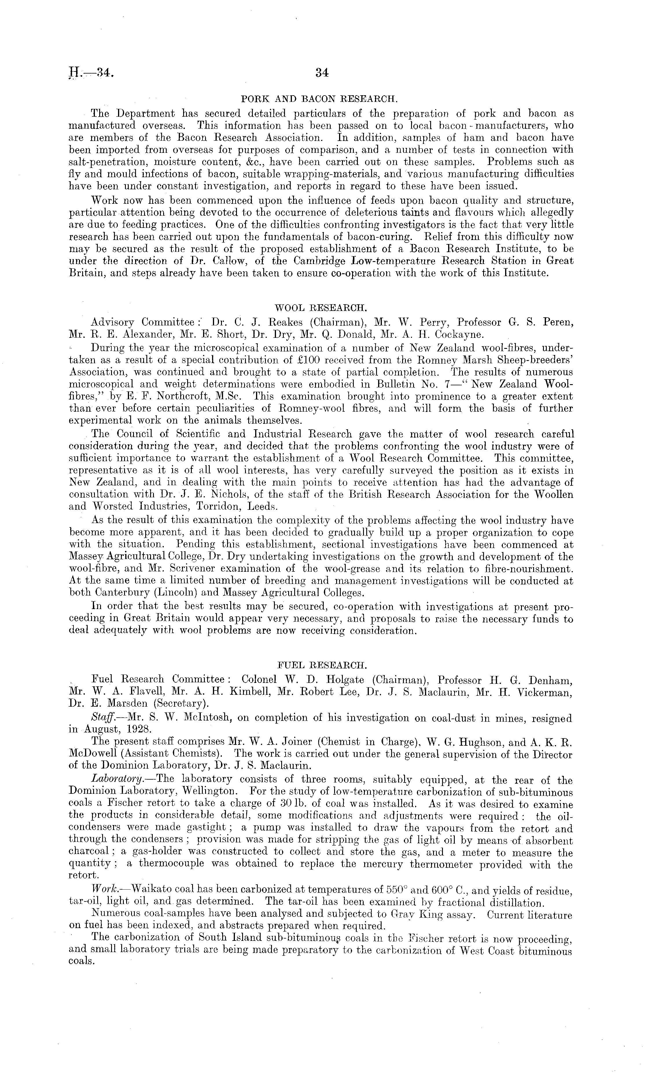 PORK AND BACON RESEARCH. The Department has secured detailed particulars of the preparation of pork and bacon as manufactured overseas. This information has been passed on to local bacon - manufacturers, who are members of the Bacon Research Association. In addition, samples of ham and bacon have been imported from overseas for purposes of comparison, and a number of tests in connection with salt-penetration, moisture content, &c., have been carried out on these samples. Problems such as fly and mould infections of bacon, suitable wrapping-materials, and various manufacturing difficulties have been under constant investigation, and reports in regard to these have been issued. Work now has been commenced upon the influence of feeds upon bacon quality and structure, particular attention being devoted to the occurrence of deleterious taints and flavours which allegedly are due to feeding practices. One of the difficulties confronting investigators is the fact that very little research has been carried out upon the fundamentals of bacon-curing. Relief from this difficulty now may be secured as the result of the proposed establishment of a Bacon Research Institute, to be under the direction of Dr. Callow, of the Cambridge Low-temperature Research Station in Great Britain, and steps already have been taken to ensure co-operation with the work of this Institute. WOOL RESEARCH. Advisory Committee Dr. C. J. Reakes (Chairman), Mr. W. Perry, Professor G. S. Peren, Mr. R. E. Alexander, Mr. E. Short, Dr. Dry, Mr. Q. Donald, Mr. A. H. Cockayne. During the year the microscopical examination of a number of New Zealand wool-fibres, undertaken as a result of a special contribution of £100 received from the Romney Marsh Sheep-breeders' Association, was continued and brought to a state of partial completion. The results of numerous microscopical and weight determinations were embodied in Bulletin No. 7 —" New Zealand Woolfibres," by E. F. Northcroft, M.Sc. This examination brought into prominence to a greater extent than ever before certain peculiarities of Romney-wool fibres, and will form the basis of further experimental work on the animals themselves. The Council of Scientific and Industrial Research gave the matter of wool research careful consideration during the j'ear, and decided that the problems confronting the wool industry were of sufficient importance to warrant the establishment of a Wool Research Committee. This committee, representative as it is of all wool interests, has very carefully surveyed the position as it exists in New Zealand, and in dealing with the main points to receive attention has had the advantage of consultation with Dr. J. E. Nichols, of the staff of the British Research Association for the Woollen and Worsted Industries, Torridon, Leeds. As the result of this examination the complexity of the problems affecting the wool industry have become more apparent, and it has been decided to gradually build up a proper organization to cope with the situation. Pending this establishment, sectional investigations have been commenced at Massey Agricultural College, Dr. Dry undertaking investigations on the growth and development of the wool-fibre, and Mr. Scrivener examination of the wool-grease and its relation to fibre-nourishment. At the same time a limited number of breeding and management investigations will be conducted at both Canterbury (Lincoln) and Massey Agricultural Colleges. In order that the best results may be secured, co-operation with investigations at present proceeding in Great Britain would appear very necessary, and proposals to raise the necessary funds to deal adequately with wool problems are now receiving consideration. FUEL RESEARCH. Fuel Research Committee : Colonel W. D. Holgate (Chairman), Professor 11. G. Denham, Mr. W. A. Flavell, Mr. A. H. Kimbell, Mr. Robert Lee, Dr. J. S. Maclaurin, Mr. H. Vickerman, Dr. E. Marsden (Secretary). Staff. —Mr. S. W. Mcintosh, on completion of his investigation on coal-dust in mines, resigned in August, 1928. The present staff comprises Mr. W. A. Joiner (Chemist in Charge), W. G. Hughson, and A. K. R. McDowell (Assistant Chemists). The work is carried out under the general supervision of the Director of the Dominion Laboratory, Dr. J. S. Maclaurin. Laboratory. —The laboratory consists of three rooms, suitably equipped, at the rear of the Dominion Laboratory, Wellington. For the study of low-temperature carbonization of sub-bituminous coals a Fischer retort to take a charge of 30 lb. of coal was installed. As it was desired to examine the products in considerable detail, some modifications and adjustments were required : the oilcondensers were made gastight; a pump was installed to draw the vapours from the retort and through the condensers ; provision was made for stripping the gas of light oil by means of absorbent charcoal; a gas-holder was constructed to collect and store the gas, and a meter to measure the quantity ; a thermocouple was obtained to replace the mercury thermometer provided with the retort. Work. —Waikato coal has been carbonized at temperatures of 550° and 600° C., and yields of residue, tar-oil, light oil, and. gas determined. The tar-oil has been examined by fractional distillation. Numerous coal-samples have been analysed and subjected to Gray King assay. Current literature on fuel has been indexed, and abstracts prepared when required. The carbonization of South Island sub-bituminoug coals in the Fischer retort is now proceeding, and small laboratory trials are being made preparatory to the carbonization of West Coast bituminous coals.