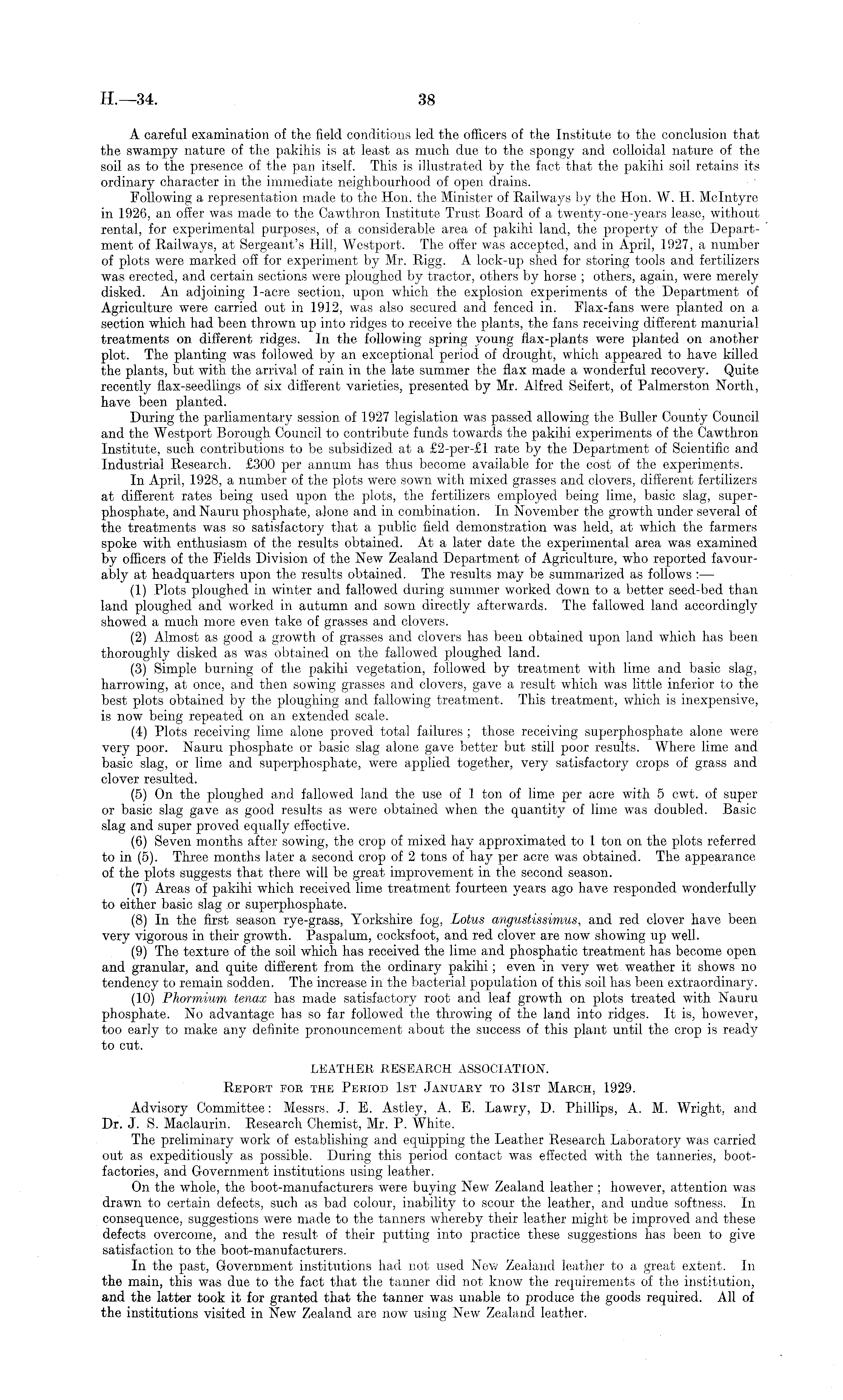 A careful examination of the field conditions led the officers of the Institute to the conclusion that the swampy nature of the pakihis is at least as much due to the spongy and colloidal nature of the soil as to the presence of the pan itself. This is illustrated by the fact that the pakihi soil retains its ordinary character in the immediate neighbourhood of open drains. Following a representation made to the Hon. the Minister of Railways by the Hon. W. H. Mclntyre in 1926, an offer was made to the Cawthron Institute Trust Board of a twenty-one-years lease, without rental, for experimental purposes, of a considerable area of pakihi land, the property of the Department of Railways, at Sergeant's Hill, Westport. The offer was accepted, and in April, 1927, a number of plots were marked off for experiment by Mr. Rigg. A lock-up shed for storing tools and fertilizers was erected, and certain sections were ploughed by tractor, others by horse ; others, again, were merely disked. An adjoining 1-acre section, upon which the explosion experiments of the Department of Agriculture were carried out in 1912, was also secured and fenced in. Flax-fans were planted on a section which had been thrown up into ridges to receive the plants, the fans receiving different manurial treatments on different ridges. In the following spring young flax-plants were planted ,on another plot. The planting was followed by an exceptional period of drought, which appeared to have killed the plants, but with the arrival of rain in the late summer the flax made a wonderful recovery. Quite recently flax-seedlings of six different varieties, presented by Mr. Alfred Seifert, of Palmerston North, have been planted. During the parliamentary session of 1927 legislation was passed allowing the Buller County Council and the Westport Borough Council to contribute funds towards the pakihi experiments of the Cawthron Institute, such contributions to be subsidized at a £2-per-£l rate by the Department of Scientific and Industrial Research. £300 per annum has thus become available for the cost of the experiments. In April, 1928, a number of the plots were sown with mixed grasses and clovers, different fertilizers at different rates being used upon the plots, the fertilizers employed being lime, basic slag, superphosphate, and Nauru phosphate, alone and in combination. In November the growth under several of the treatments was so satisfactory that a public field demonstration was held, at which the farmers spoke with enthusiasm of the results obtained. At a later date the experimental area was examined by officers of the Fields Division of the New Zealand Department of Agriculture, who reported favourably at headquarters upon the results obtained. The results may be summarized as follows : — (1) Plots ploughed in winter and fallowed during summer worked down to a better seed-bed than land ploughed and worked in autumn and sown directly afterwards. The fallowed land accordingly showed a much more even take of grasses and clovers. (2) Almost as good a growth of grasses and clovers has been obtained upon land which has been thoroughly disked as was obtained on the fallowed ploughed land. (3) Simple burning of the pakihi vegetation, followed by treatment with lime and basic slag, harrowing, at once, and then sowing grasses and clovers, gave a result which was little inferior to the best plots obtained by the ploughing and fallowing treatment. This treatment, which is inexpensive, is now being repeated on an extended scale. (4) Plots receiving lime alone proved total failures ; those receiving superphosphate alone were very poor. Nauru phosphate or basic slag alone gave better but still poor results. Where lime and basic slag, or lime and superphosphate, were applied together, very satisfactory crops of grass and clover resulted. (5) On the ploughed and fallowed land the use of 1 ton of lime per acre with 5 cwt. of super or basic slag gave as good results as were obtained when the quantity of lime was doubled. Basic slag and super proved equally effective. (6) Seven months after sowing, the crop of mixed hay approximated to 1 ton on the plots referred to in (5). Three months later a second crop of 2 tons of hay per acre was obtained. The appearance of the plots suggests that there will be great improvement in the second season. (7) Areas of pakihi which received lime treatment fourteen years ago have responded wonderfully to either basic slag .or superphosphate. (8) In the first season rye-grass, Yorkshire fog, Lotus angustissimus, and red clover have been very vigorous in their growth. Paspalum, cocksfoot, and red clover are now showing up well. (9) The texture of the soil which has received the lime and phosphatic treatment has become open and granular, and quite different from the ordinary pakihi; even in very wet weather it shows no tendency to remain sodden. The increase in the bacterial population of this soil has been extraordinary. (10) Phormium tenax has made satisfactory root and leaf growth on plots treated with Nauru phosphate. No advantage has so far followed the throwing of the land into ridges. It is, however, too early to make any definite pronouncement about the success of this plant until the crop is ready to cut. LEATHER RESEARCH ASSOCIATION. Report for the Period Ist January to 31st March, 1929. Advisory Committee: Messrs. J. E. Astley, A. E. Lawry, D. Phillips, A. M. Wright, and Dr. J. S. Maclaurin. Research Chemist, Mr. P. White. The preliminary work of establishing and equipping the Leather Research Laboratory was carried out as expeditiously as possible. During this period contact was effected with the tanneries, bootfactories, and Government institutions using leather. On the whole, the boot-manufacturers were buying New Zealand leather ; however, attention was drawn to certain defects, such as bad colour, inability to scour the leather, and undue softness. In consequence, suggestions were made to the tanners w