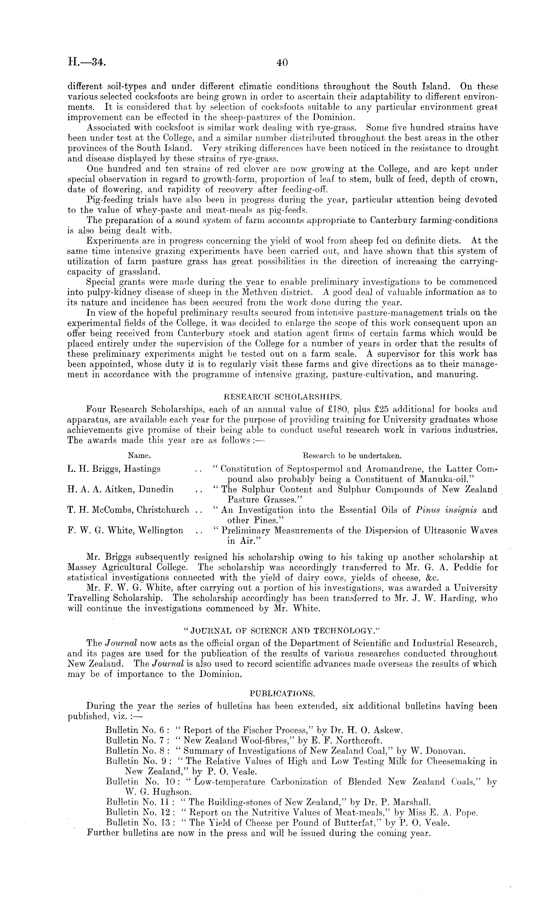 different soil-types and under different climatic conditions throughout the South Island. On these various selected cocksfoots are being grown in order to ascertain their adaptability to different environments. It is considered that by selection of cocksfoots suitable to any particular environment great improvement can be effected in the sheep-pastures of the Dominion. Associated with cocksfoot is similar work dealing with rye-grass. Some five hundred strains have been under test at the College, and a similar number distributed throughout the best areas in the other provinces of the South Island. Very striking differences have been noticed in the resistance to drought and disease displayed by these strains of rye-grass. One hundred and ten strains of red clover are now growing at the College, and are kept under special observation in regard to growth-form, proportion of leaf to stem, bulk of feed, depth of crown, date of flowering, and rapidity of recovery after feeding-off. Pig-feeding trials have also been in progress during the year, particular attention being devoted to the value of whey-paste and meat-meals as pig-feeds. The preparation of a sound system of farm accounts appropriate to Canterbury farming-conditions is also being dealt with. Experiments are in progress concerning the yield of wool from sheep fed on definite diets. At the same time intensive grazing experiments have been carried out, and have shown that this system of utilization of farm pasture grass has great possibilities in the direction of increasing the carryingcapacity of grassland. Special grants were made during the year to enable preliminary investigations to be commenced into pulpy-kidney disease of sheep in the Methven district. A good deal of valuable information as to its nature and incidence has been secured from the work done during the year. In view of the hopeful preliminary results secured from intensive pasture-management trials on the experimental fields of the College, it was decided to enlarge the scope of this work consequent upon an offer being received from Canterbury stock and station agent firms of certain farms which would be placed entirely under the supervision of the College for a number of years in order that the results of these preliminary experiments might be tested out on a farm scale. A supervisor for this work has been appointed, whose duty it is to regularly visit these farms and give directions as to their management in accordance with the programme of intensive grazing, pasture-cultivation, and manuring. RESEARCH SCHOLARSHIPS. Four Research Scholarships, each of an annual value of £180, plus £25 additional for books and apparatus, are available each year for the purpose of providing training for University graduates whose achievements give promise of their being able to conduct useful research work in various industries. The awards made this year are as follows : — Name. Research to be undertaken. L. H. Briggs, Hastings .. " Constitution of Septospermol and Aromandrene, the Latter Compound also probably being a Constituent of Manuka-oil." H. A. A. Aitken, Dunedin .. " The Sulphur Content and Sulphur Compounds of New Zealand Pasture Grasses." T. H. McCombs, Christchurch .. "An Investigation into the Essential Oils of Pinus insignis and other Pines." F. W. G. White, Wellington .. " Preliminary Measurements of the Dispersion of Ultrasonic Waves in Air." Mr. Briggs subsequently resigned his scholarship owing to his taking up another scholarship at Massey Agricultural College. The scholarship was accordingly transferred to Mr. G. A. Peddie for statistical investigations connected with the yield of dairy cows, yields of cheese, &c. Mr. F. W. G. White, after carrying out a portion of his investigations, was awarded a University Travelling Scholarship. The scholarship accordingly has been transferred to Mr. J. W. Harding, who will continue the investigations commenced by Mr. White. " JOURNAL OF SCIENCE ANT) TECHNOLOGY." The Journal now acts as the official organ of the Department of Scientific and Industrial Research, and its pages are used for the publication of the results of various researches conducted throughout New Zealand. The Journal is also used to record scientific advances made overseas the results of which may be of importance to the Dominion. PUBLICATIONS. During the year the series of bulletins has been extended, six additional bulletins having been published, viz. : — Bulletin No. 6 : " Report of the Fischer Process," by Dr. H. 0. Askew. Bulletin No. 7 : " New Zealand Wool-fibres," by E. F. Northcroft. Bulletin No. 8 : " Summary of Investigations of New Zealand Coal," by W. Donovan. Bulletin No. 9 : " The Relative Values of High and Low Testing Milk for Cheesemaking in New Zealand," by P. 0. Veale. Bulletin No. 10 : " Low-temperature Carbonization of Blended New Zealand Coals," by W. G. Hughson. Bulletin No. 11 : " The Building-stones of New Zealand," by Dr. P. Marshall. Bulletin No. 12 : " Report on the Nutritive Values of Meat-meals," by Miss E. A. Pope. Bulletin No. 13 : " The Yield of Cheese per Pound of Butterfat," by P. 0. Veale. Further bulletins are now in the press and will be issued during the coming year.
