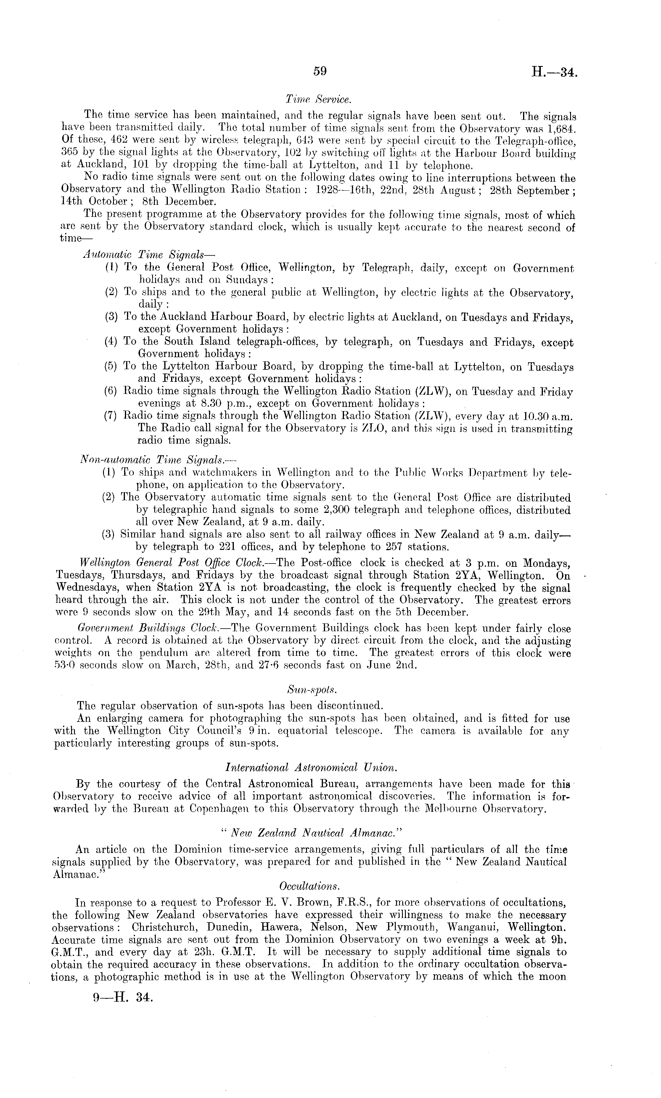 Time Service. The time service has been maintained, and the regular signals have been sent out. The signals have been transmitted daily. The total number of time signals sent from the Observatory was 1,684. Of these, 462 were sent by wireless telegraph, 643 were sent by special circuit to the Telegraph-office, 365 by the signal lights at the Observatory, 102 by switching off lights at the Harbour Board building at Auckland, 101 by dropping the time-ball at Lyttelton, and 11 by telephone. No radio time signals were sent out on the following dates owing to line interruptions between the Observatory and the Wellington Radio Station : 1928—16 th, 22nd, 28th August; 28th September ; 14th October ; Bth December. The present programme at the Observatory provides for the following time signals, most of which are sent by the Observatory standard clock, which is usually kept accurate to the nearest second of time— Automatic Time Signals— (1) To the General Post Office, Wellington, by Telegraph, daily, except on Government holidays and on Sundays : (2) To ships and to the general public at Wellington, by electric lights at the Observatory, daily : (3) To the Auckland Harbour Board, by electric lights at Auckland, on Tuesdays and Fridays, except Government holidays : (4) To the South Island telegraph-offices, by telegraph, on Tuesdays and Fridays, except Government holidays : (5) To "the Lyttelton Harbour Board, by dropping the time-ball at Lyttelton, on Tuesdays and Fridays, except Government holidays : (6) Radio time signals through the Wellington Radio Station (ZLW), on Tuesday and Friday evenings at 8.30 p.m., except on Government holidays : (7) Radio time signals through the Wellington Radio Station (ZLW), every day at 10.30 a.m. The Radio call signal for the Observatory is ZLO, and this sign is used in transmitting radio time signals. Non-automatic Time Signals.— (1) To ships and watchmakers in Wellington and to the Public Works Department by telephone, on application to the Observatory. (2) The Observatory automatic time signals sent to the General Post Office are distributed by telegraphic hand signals to some 2,300 telegraph and telephone offices, distributed all over New Zealand, at 9 a.m. daily. (3) Similar hand signals are also sent to all railway offices in New Zealand at 9 a.m. daily— by telegraph to 221 offices, and by telephone to 257 stations. Wellington General Post Office Clock.—The Post-office clock is checked at 3 p.m. on Mondays, Tuesdays, Thursdays, and Fridays by the broadcast signal through Station 2YA, Wellington. On Wednesdays, when Station 2YA is not broadcasting, the clock is frequently checked by the signal heard through the air. This clock is not under the control of the Observatory. The greatest errors were 9 seconds slow on the 29th May, and 14 seconds fast on the sth December. Government Buildings Clock.—The Government Buildings clock has been kept under fairly close control. A record is obtained at the Observatory by direct circuit from the clock, and the adjusting weights on the pendulum are altered from time to time. The greatest errors of this clock were 53'0 seconds slow on March, 28th, and 27-6 seconds fast on June 2nd. Sun-spots. The regular observation of sun-spots has been discontinued. An enlarging camera for photographing the sun-spots has been obtained, and is fitted for use with the Wellington City Council's 9 in. equatorial telescope. The camera is available for any particularly interesting groups of sun-spots. International Astronomical Union. By the courtesy of the Central Astronomical Bureau, arrangements have been made for this Observatory to receive advice of all important astronomical discoveries. The information is forwarded by the Bureau at Copenhagen to this Observatory through the Melbourne Observatory. " New Zealand Nautical Almanac." An article on the Dominion time-service arrangements, giving full particulars of all the time signals supplied by the Observatory, was prepared for and published in the " New Zealand Nautical Almanac." Occultations. In response to a request to Professor E. V. Brown, F.R.S., for more observations of occultations, the following New Zealand observatories have expressed their willingness to make the necessary observations: Christchurch, Dunedin, Hawera, Nelson, New Plymouth, Wanganui, Wellington. Accurate time signals are sent out from the Dominion Observatory on two evenings a week at 91). G.M.T., and every day at 23h. G.M.T. It will be necessary to supply additional time signals to obtain the required accuracy in these observations. In addition to the ordinary occultation observations, a photographic method is in use at the Wellington Observatory by means of which the moon