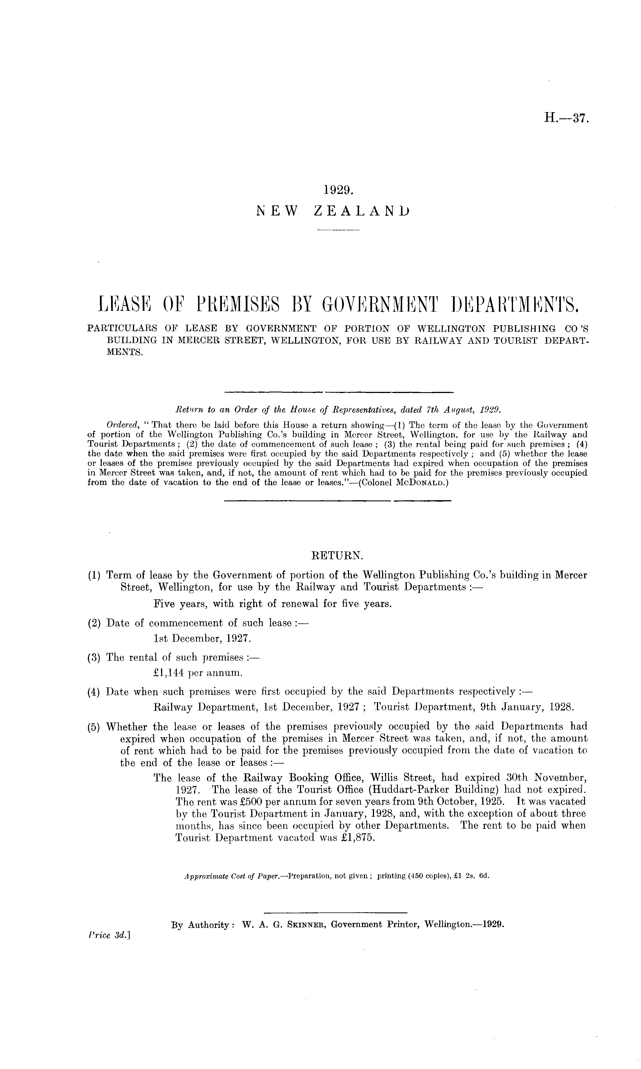 RETURN. (1) Term of lease by the Government of portion of the Wellington Publishing Co.'s building in Mercer Street, Wellington, for use by the Railway and Tourist Departments :— Five years, with right of renewal for five years. (2) Date of commencement of such lease : — Ist December, 1927. (.3) The rental of such premises :— £1,144 per annum. (4) Date when such premises were first occupied by the said Departments respectively : — Railway Department, Ist December, 1927 ; Tourist Department, 9th January, 1928. (5) Whether the lease or leases of the premises previously occupied by the said Departments had expired when occupation of the premises in Mercer Street was taken, and, if not, the amount of rent which had to be paid for the premises previously occupied from the date of vacation to the end of the lease or leases :— The lease of the Railway Booking Office, Willis Street, had expired 30th November, 1927. The lease of the Tourist Office (Huddart-Parker Building) had not expired. The rent was £500 per annum for seven years from 9th October, 1925. It was vacated by the Tourist Department in January, 1928, and, with the exception of about three months, has since been occupied by other Departments. The rent to be paid when Tourist Department vacated was £1,875.
