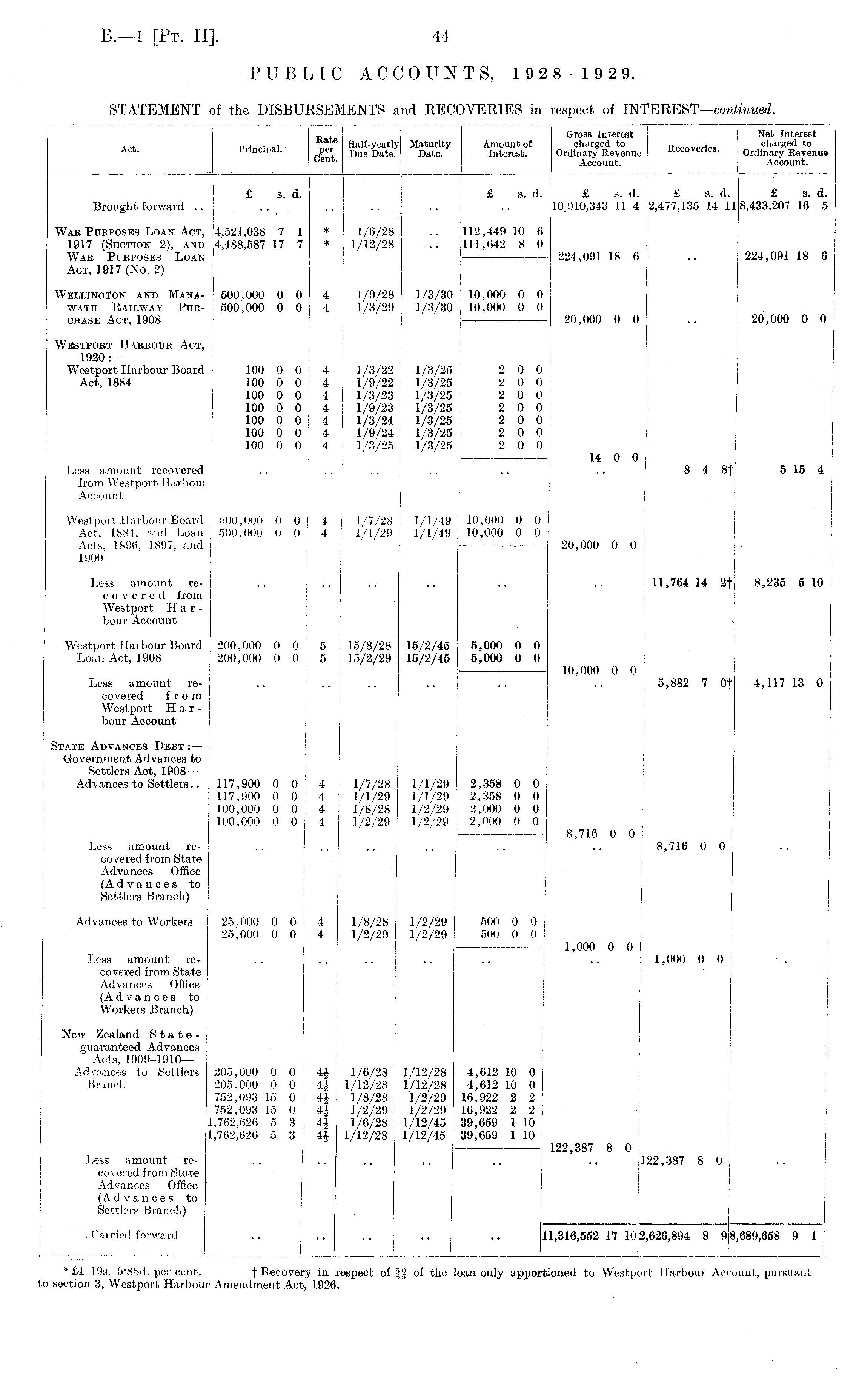 „ . Gross Interest Net Interest Art PrinrinAl npr Half-yearly Maturity Amount of charged to Recoveries charged to Act> Principal. pei I)lie j) a fc e Date. Interest. Ordinary Revenue Recover es. Ordinary Revenu# ent * Account. I Account. £ s. d. 1 £ s. d. £ s. d. £ s. d. £ s. d. Brought forward .. .. .. .. . . .. 10,910,343 11 4 2,477,135 14 11 8,433,207 16 5 Was PURPOSES LOAN Act, 4,521,038 7 1 * 1/6/28 .. 112,449 10 6 1917 (Section 2), AND 4,488,587 17 7 * 1/12/28 .. 111,642 8 0 WAR Purposes LOAN ! 224,091 18 6 .. 224,091 18 6 Act, 1917 (No, 2) Wellington and Mana- 500,000 0 0 4 1/9/28 1/3/30 10,000 0 0 watu Railway Pun- 500,000 0 0 4 1/3/29 1/3/30 10,000 0 0 chase ACT, 1908 — 20,000 0 0 .. 20,000 0 0 Westport Harbour Act, 1920: — Westport Harbour Board 100 0 0 4 1/3/22 1/3/25 2 0 0 Act, 1884 100 0 0 4 1/9/22 1/3/25 2 0 0 100 0 0 4 1/3/23 1/3/25 , 2 0 0 100 0 0 4 1/9/23 1/3/25 1 2 0 0 100 0 0 4 1/3/24 1/3/25 , 2 0 0 100 0 0 4 1/9/24 1/3/25 ; 2 0 0 100 0 0 4 1/3/25 1/3/25 2 0 0 — 14 0 0 Less amount recovered .. . . .. .. .. .. ! 8 4 8f 5 15 4 from Westport Harboui Account Westport Harbour Board 500,000 0 0 14 1/7/28 I 1/1/49 10,000 0 0 Act, 1884, and Loan 500,000 0 0 4 1/1/29 I 1/1/49 10,000 0 0 Acts, 1896, 1897, and ' — 20,000 0 0 1900 ! j Less amount re- .. .. j .. .. .. j .. 11,764 14 2fj 8,235 5 10 covered from I Westport H a r - bour Account Westport Harbour Board 200,000 0 0 5 j 15/8/28 . 15/2/45 5,000 0 0 Loan Act, 1908 [ 200,000 0 0 5! 15/2/29 I 15/2/45 5,000 0 0 [ I 10,000 0 0 Less amount re- I .. .. j .. .. .. .. 5,882 7 Of 4,117 13 0 covered from W estport Harbour Account State Advances Debt : — Government Advances to Settlers Act, 1908 — Advances to Settlers.. 117,900 0 0 4 1/7/28 1/1/29 2,358 0 0 117,900 0 0 4 1/1/29 1/1/29 2,358 0 0 100,000 0 0 4 1/8/28 1/2/29 2,000 0 0 i 100,000 0 0 4 1/2/29 1/2/29 2,000 0 0 8,716 0 0 Less amount re- 1 .. .. .. .. .. .. 8,716 0 0 covered from State Advances Office (Advances to Settlers Branch) Advances to Workers 25,000 0 0 4 1/8/28; 1/2/29 500 0 0 25,000 0 0 4 1/2/29 I 1/2/29 500 0 0 , 1,000 0 0 Less amount re- .. .. .. .. .. ! .. 1,000 0 0 covered from State Advances Office (Advances to Workers Branch) New Zealand Stateguaranteed Advances Acts, 1909-1910— Advances to Settlers 205,000 0 0 4J 1/6/28 1/12/28 4,612 10 0 Branch 205,000 0 0 4} 1/12/28 1/12/28 4,612 10 0 752,093 15 0 4£ 1/8/28 1/2/29 16,922 2 2 752,093 15 0 4J 1/2/29 1/2/29 16,922 2 2 1,762,626 5 3 4J 1/6/28 1/12/45 39,659 1 10 1,762,626 5 3 U 1/12/28 1/12/45 39,659 1 10 122,387 8 0 Less amount re- .. .. .. ,. .. .. .122,387 8 0 covered from State Advances Office (Advances to Settlers Branch) Carried forward .. .. .. .. .. 11,316,552 17 102,626,894 8 98,689,658 9 1 j ' *£4 19s. 5'88d. per cont. f Recovery in respect of ||g of the loan only apportioned to Westport Harbour Account, pursuant to section 3, Westport Harbour Amendment Act, 1926.