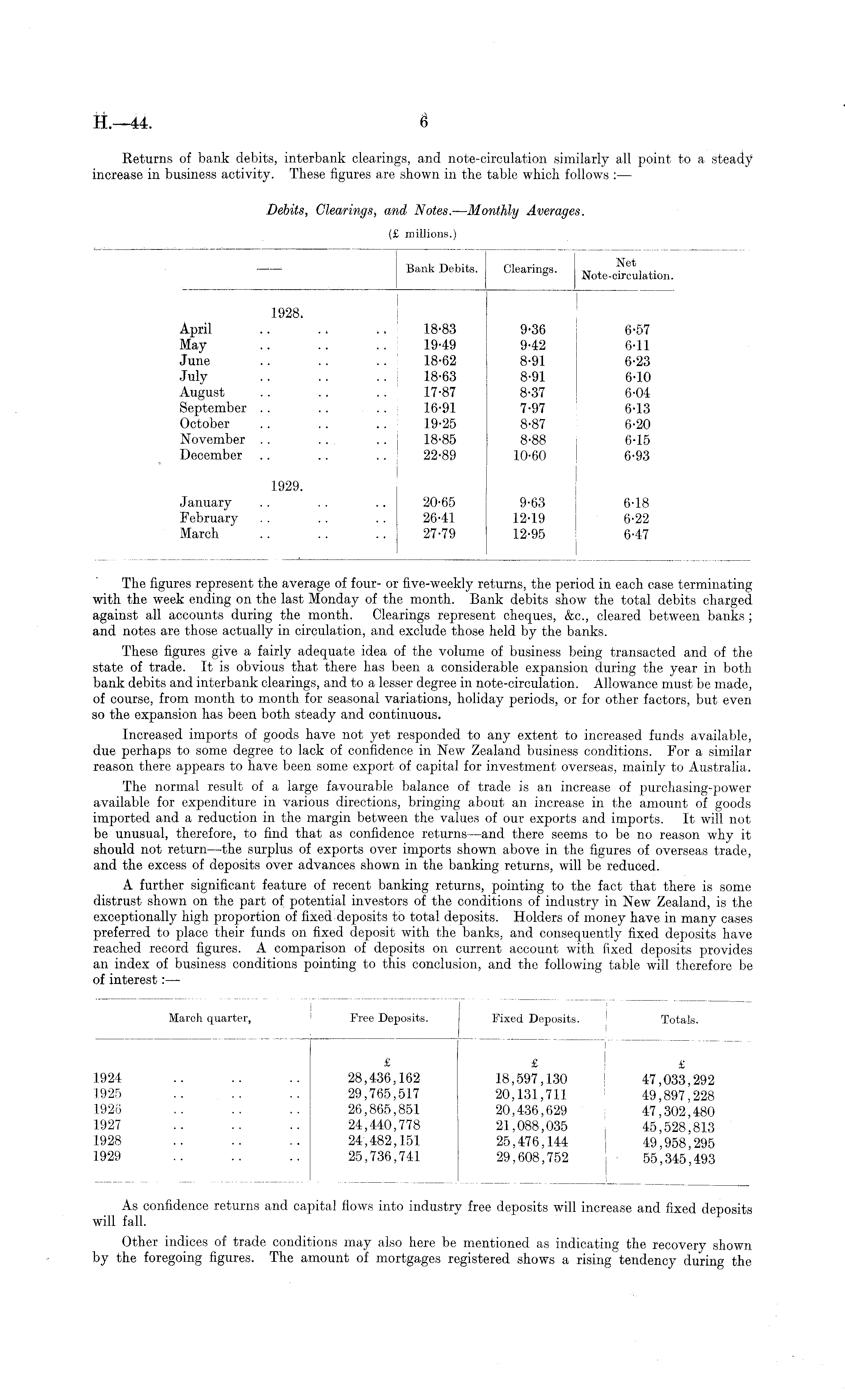 [ March quarter, ! Free Deposits. Fixed Deposits. Totals. £ £ £ 1924 .. .. .. 28,436,162 18,597,130 ! 47,033,292 1925 .. .. .. 29,765,517 20,131,711 49,897,228 1926 .. .. .. 26,865,851 20,436,629 47,302,480 1927 .. .. .. 24,440,778 21,088,035 45,528,813 1928 .. .. .. 24,482,151 25,476,144 49,958,295 1929 .. .. .. 25,736,741 29,608,752 j 55,345,493