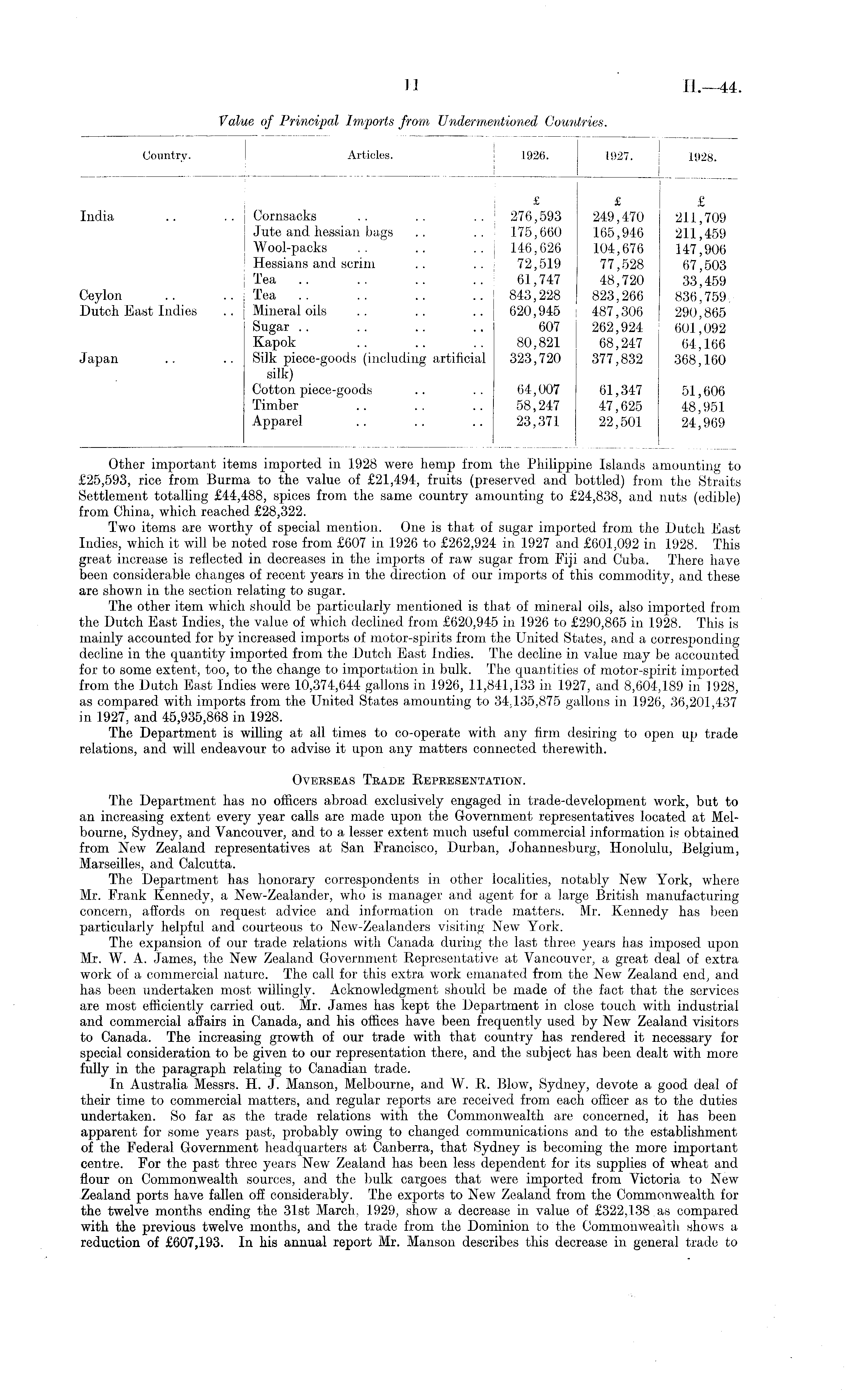 Other important items imported in 1928 were hemp from the Philippine Islands amounting to £25,593, rice from Burma to the value of £21,494, fruits (preserved and bottled) from the Straits Settlement totalling £44,488, spices from the same country amounting to £24,838, and nuts (edible) from China, which reached £28,322. Two items are worthy of special mention. One is that of sugar imported from the Dutch East Indies, which it will be noted rose from £607 in 1926 to £262,924 in 1927 and £601,092 in 1928. This great increase is reflected in decreases in the imports of raw sugar from Fiji and Cuba. There have been considerable changes of recent years in the direction of our imports of this commodity, and these are shown in the section relating to sugar. The other item which should be particularly mentioned is that of mineral oils, also imported from the Dutch East Indies, the value of which declined from £620,945 in 1926 to £290,865 in 1928. This is mainly accounted for by increased imports of motor-spirits from the United States, and a corresponding decline in the quantity imported from the Dutch East Indies. The decline in value may be accounted for to some extent, too, to the change to importation in bulk. The quantities of motor-spirit imported from the Dutch East Indies were 10,374,644 gallons in 1926, 11,841,133 in 1927, and 8,604,189 in 1928, as compared with imports from the United States amounting to 34,135,875 gallons in 1926, 36,201,437 in 1927, and 45,935,868 in 1928. The Department is willing at all times to co-operate with any firm desiring to open up trade relations, and will endeavour to advise it upon any matters connected therewith. Overseas Trade Representation. The Department has no officers abroad exclusively engaged in trade-development work, but to an increasing extent every year calls are made upon the Government representatives located at Melbourne, Sydney, and Vancouver, and to a lesser extent much useful commercial information is obtained from New Zealand representatives at San Francisco, Durban, Johannesburg, Honolulu, Belgium, Marseilles, and Calcutta. The Department has honorary correspondents in other localities, notably New York, where Mr. Frank Kennedy, a New-Zealander, who is manager and agent for a large British manufacturing concern, affords on request advice and information on trade matters. Mr. Kennedy has been particularly helpful and courteous to New-Zealanders visiting New York. The expansion of our trade relations with Canada during the last three years has imposed upon Mr. W. A. James, the New Zealand Government Representative at Vancouver, a great deal of extra work of a commercial nature. The call for this extra work emanated from the New Zealand end, and has been undertaken most willingly. Acknowledgment should be made of the fact that the services are most efficiently carried out. Mr. James has kept the Department in close touch with industrial and commercial affairs in Canada, and his offices have been frequently used by New Zealand visitors to Canada. The increasing growth of our trade with that country has rendered it necessary for special consideration to be given to our representation there, and the subject has been dealt with more fully in the paragraph relating to Canadian trade. In Australia Messrs. H. J. Manson, Melbourne, and W. R. Blow, Sydney, devote a good deal of their time to commercial matters, and regular reports are received from each officer as to the duties undertaken. So far as the trade relations with the Commonwealth are concerned, it has been apparent for some years past, probably owing to changed communications and to the establishment of the Federal Government headquarters at Canberra, that Sydney is becoming the more important centre. For the past three years New Zealand has been less dependent for its supplies of wheat and flour on Commonwealth sources, and the bulk cargoes that were imported from Victoria to New Zealand ports have fallen off considerably. The exports to New Zealand from the Commonwealth for the twelve months ending the 31st March, 1929, show a decrease in value of £322,138 as compared with the previous twelve months, and the trade from the Dominion to the Commonwealth shows a reduction of £607,193. In his annual report Mr. Manson describes this decrease in general trade to