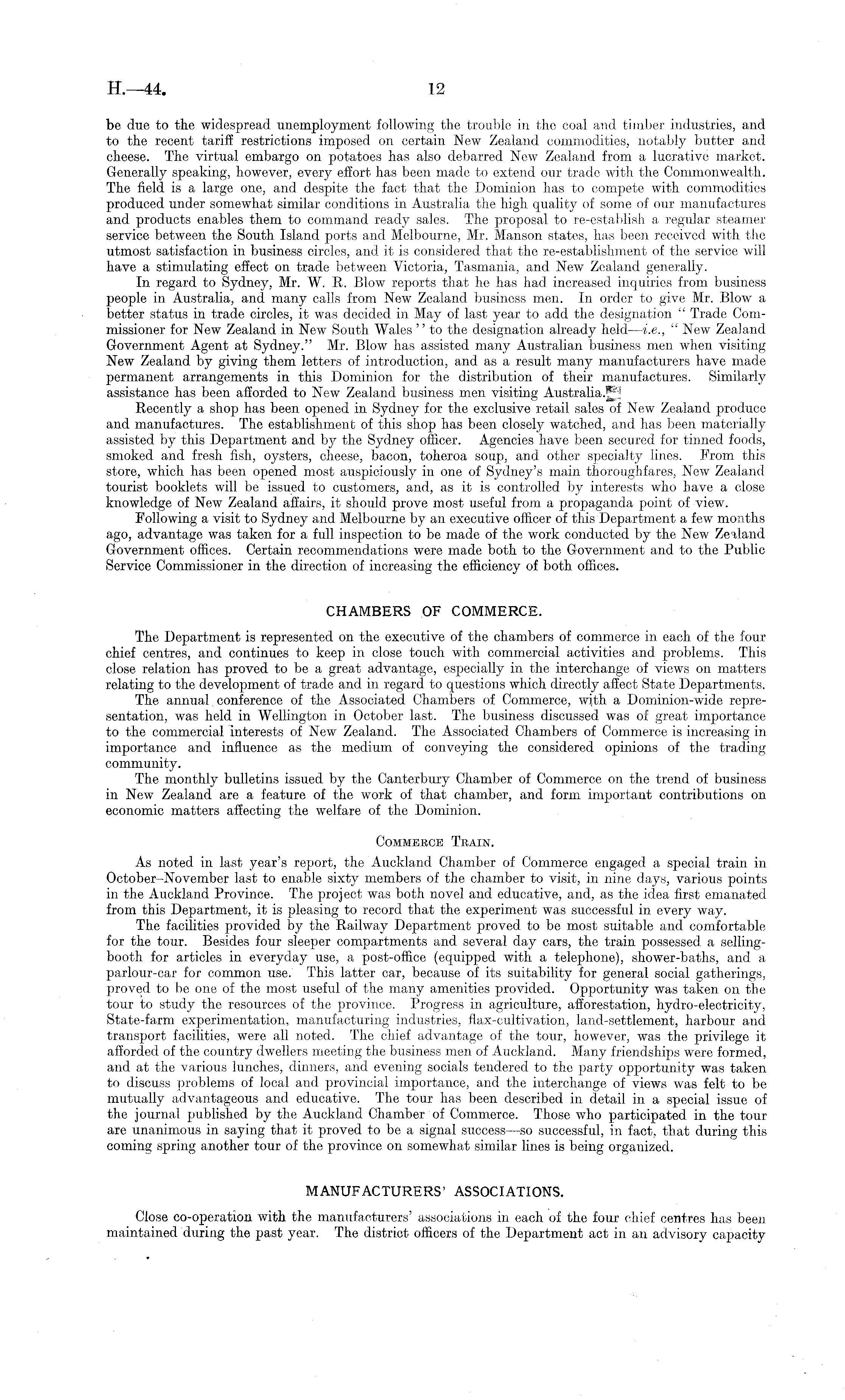 be due to the widespread unemployment following the trouble in the coal and timber industries, and to the recent tariff restrictions imposed on certain New Zealand commodities, notably butter and cheese. The virtual embargo on potatoes has also debarred New Zealand from a lucrative market. Generally speaking, however, every effort has been made to extend our trade with the Commonwealth. The field is a large one, and despite the fact that the Dominion has to compete with commodities produced under somewhat similar conditions in Australia the high quality of some of our manufactures and products enables them to command ready sales. The proposal to re-establish a regular steamer service between the South Island ports and Melbourne, Mr. Manson states, has been received with the utmost satisfaction in business circles, and it is considered that the re-establishment of the service will have a stimulating effect on trade between Victoria, Tasmania, and New Zealand generally. In regard to Sydney, Mr. W. R. Blow reports that he has had increased inquiries from business people in Australia, and many calls from New Zealand business men. In order to give Mr. Blow a better status in trade circles, it was decided in May of last year to add the designation " Trade Commissioner for New Zealand in New South Wales '' to the designation already held —i.e., " New Zealand Government Agent at Sydney." Mr. Blow has assisted many Australian business men when visiting New Zealand by giving them letters of introduction, and as a result many manufacturers have made permanent arrangements in this Dominion for the distribution of their manufactures. Similarly assistance has been afforded to New Zealand business men visiting Australia.^ Recently a shop has been opened in Sydney for the exclusive retail sales of New Zealand produce and manufactures. The establishment of this shop has been closely watched, and has been materially assisted by this Department and by the Sydney officer. Agencies have been secured for tinned foods, smoked and fresh fish, oysters, cheese, bacon, toheroa soup, and other specialty lines. From this store, which has been opened most auspiciously in one of Sydney's main thoroughfares, New Zealand tourist booklets will be issued to customers, and, as it is controlled by interests who have a close knowledge of New Zealand affairs, it should prove most useful from a propaganda point of view. Following a visit to Sydney and Melbourne by an executive officer of this Department a few months ago, advantage was taken for a full inspection to be made of the work conducted by the New Zealand Government offices. Certain recommendations were made both to the Government and to the Public Service Commissioner in the direction of increasing the efficiency of both offices. CHAMBERS OF COMMERCE. The Department is represented on the executive of the chambers of commerce in each of the four chief centres, and continues to keep in close touch with commercial activities and problems. This close relation has proved to be a great advantage, especially in the interchange of views on matters relating to the development of trade and in regard to questions which directly affect State Departments. The annual conference of the Associated Chambers of Commerce, with a Dominion-wide representation, was held in Wellington in October last. The business discussed was of great importance to the commercial interests of New Zealand. The Associated Chambers of Commerce is increasing in importance and influence as the medium of conveying the considered opinions of the trading community. The monthly bulletins issued by the Canterbury Chamber of Commerce on the trend of business in New Zealand are a feature of the work of that chamber, and form important contributions on economic matters affecting the welfare of the Dominion. Commerce Train. As noted in last year's report, the Auckland Chamber of Commerce engaged a special train in October-November last to enable sixty members of the chamber to visit, in nine days, various points in the Auckland Province. The project, was both novel and educative, and, as the idea first emanated from this Department, it is pleasing to record that the experiment was successful in every way. The facilities provided by the Railway Department proved to be most suitable and comfortable for the tour. Besides four sleeper compartments and several day cars, the train possessed a sellingbooth for articles in everyday use, a post-office (equipped with a telephone), shower-baths, and a parlour-car for common use. This latter car, because of its suitability for general social gatherings, proved to be one of the most useful of the many amenities provided. Opportunity was taken 011 the tour to study the resources of the province. Progress in agriculture, afforestation, hydro-electricity, State-farm experimentation, manufacturing industries, flax-cultivation, land-settlement, harbour and transport facilities, were all noted. The chief advantage of the tour, however, was the privilege it afforded of the country dwellers meeting the business men of Auckland. Many friendships were formed, and at the various lunches, dinners, and evening socials tendered to the party opportunity was taken to discuss problems of local and provincial importance, and the interchange of views was felt to be mutually advantageous and educative. The tour has been described in detail in a special issue of the journal published by the Auckland Chamber of Commerce. Those who participated in the tour are unanimous in saying that it proved to be a signal success —so successful, in fact, that during this coming spring another tour of the province on somewhat similar lines is being organized. MANUFACTURERS' ASSOCIATIONS. Close co-operation with the manufacturers' associations in each of the four chief centres has been maintained during the past year. The district officers of the Department act in an advisory capacity