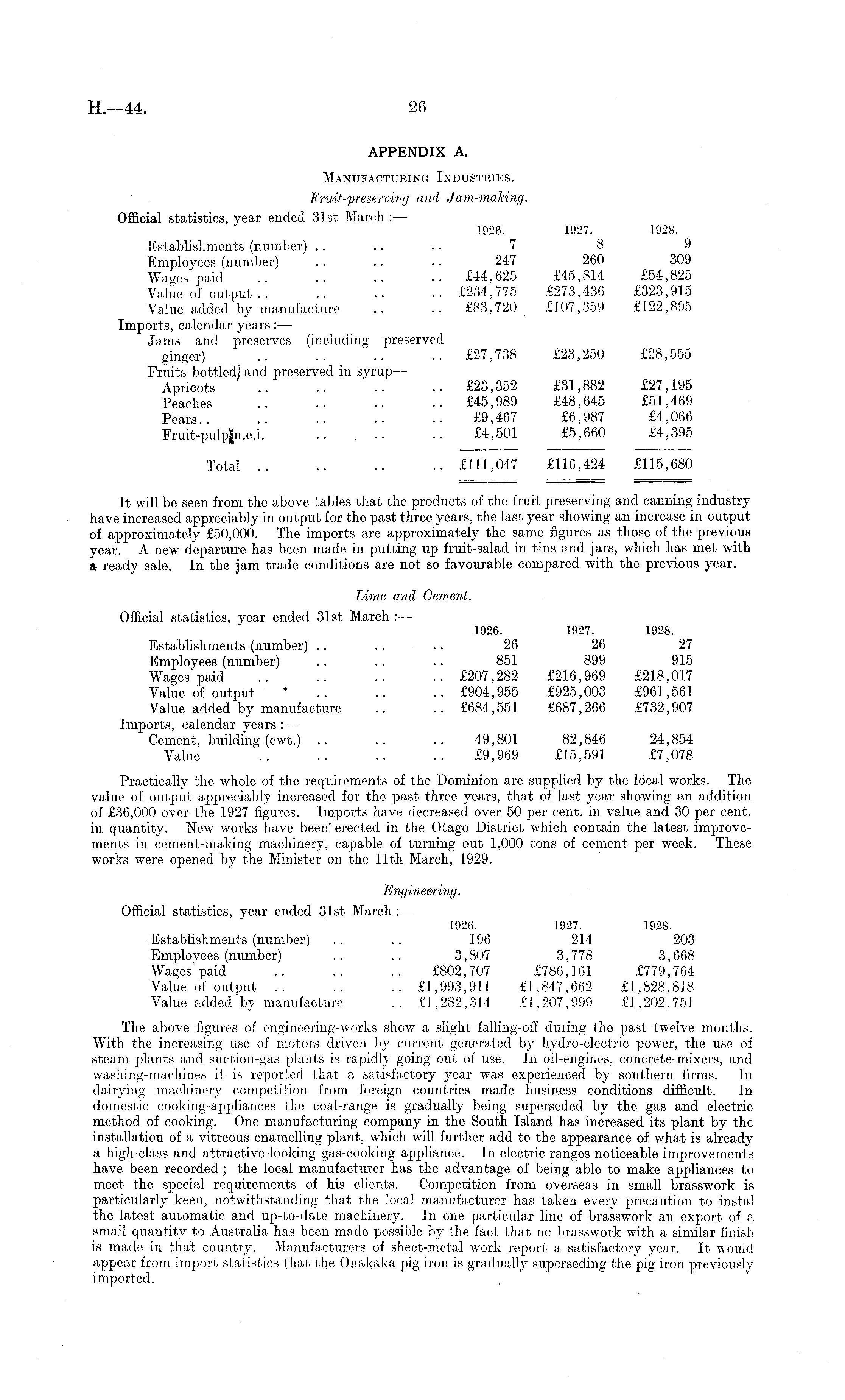 APPENDIX A. Manufacturing Industries. Fruit-preserving and Jam-making. Official statistics, year ended 31st March : — 1926. 1927. 1928. Establishments (number) .. .. .. 7 8 9 Employees (number) .. .. .. 247 260 309 Wages paid .. .. .. .. £44,625 £45,814 £54,825 Value of output £234,775 £273,436 £323,915 Value added by manufacture .. .. £83,720 £107,359 £122,895 Imports, calendar years : —• Jains anrl preserves (including preserved ginger) .. .. .. .. £27,738 £23,250 £28,555 Fruits bottled] and preserved in syrup — Apricots .. .. .. .. £23,352 £31,882 £27,195 Peaches .. .. .. .. £45,989 £48,645 £51,469 Pears.. .. .. .. •• £9,467 £6,987 £4,066 Fruit-pulp|n.e.i. .. .. .. £4,501 £5,660 £4,395 Total .. .. .. .. £111,047 £116,424 £115,680 It will be seen from the above tables that the products of the fruit preserving and canning industry have increased appreciably in output for the past three years, the last year showing an increase in output of approximately £50,000. The imports are approximately the same figures as those of the previous year. A new departure has been made in putting up fruit-salad in tins and jars, which has met with a ready sale. In the jam trade conditions are not so favourable compared with the previous year. Lime and Cement. Official statistics, year ended 31 st March : — 1926. 1927. 1928. Establishments (number) .. .. .. 26 26 27 Employees (number) .. .. .. 851 899 915 Wages paid .. .. .. .. £207,282 £216,969 £218,017 Value of output ' .. .. .. £904,955 £925,003 £961,561 Value added by manufacture .. .. £684,551 £687,266 £732,907 Imports, calendar years : — Cement, building (cwt.) .. .. .. 49,801 82,846 24,854 Value .. .. .. .. £9,969 £15,591 £7,078 Practically the whole of the requirements of the Dominion are supplied by the local works. The value of output appreciably increased for the past three years, that of last year showing an addition of £36,000 over the 1927 figures. Imports have decreased over 50 per cent, in value and 30 per cent, in quantity. New works have been" erected in the Otago District which contain the latest improvements in cement-making machinery, capable of turning out 1,000 tons of cement per week. These works were opened by the Minister on the 11th March, 1929. Engineering. Official statistics, vear ended 31st. March : — 1926. 1927. 1928. Establishments (number) . . . . 196 214 203 Emplovees (number) .. .. 3,807 3,778 3,668 Wages" paid .. .. .. £802,707 £786,161 £779,764 Value of output .. .. .. £1,993,911 £1,847,662 £1,828,818 Value added by manufacture .. £1,282,314 £1,207,999 £1,202,751 The above figures of engineering-works show a slight falling-off during the past twelve months. With the increasing use of motors driven by current generated by hydro-electric power, the use of steam plants and suction-gas plants is rapidly going out of use. In oil-engines, concrete-mixers, and washing-machines it is reported that a satisfactory year was experienced by southern firms. In dairying machinery competition from foreign countries made business conditions difficult. In domestic cooking-appliances the coal-range is gradually being superseded by the gas and electric method of cooking. One manufacturing company in the South Island has increased its plant by the installation of a vitreous enamelling plant, which will further add to the appearance of what is already a high-class and attractive-looking gas-cooking appliance. In electric ranges noticeable improvements have been recorded ; the local manufacturer has the advantage of being able to make appliances to meet the special requirements of his clients. Competition from overseas in small brasswork is particularly keen, notwithstanding that the local manufacturer has taken every precaution to instal the latest automatic and up-to-date machinery. In one particular line of brasswork an export of a small quantity to Australia has been made possible by the fact that no brasswork with a similar finish is made in thai country. Manufacturers of sheet-metal work report a satisfactory year. It would appear from import statistics that the Onakaka pig iron is gradually superseding the pig iron previously imported.