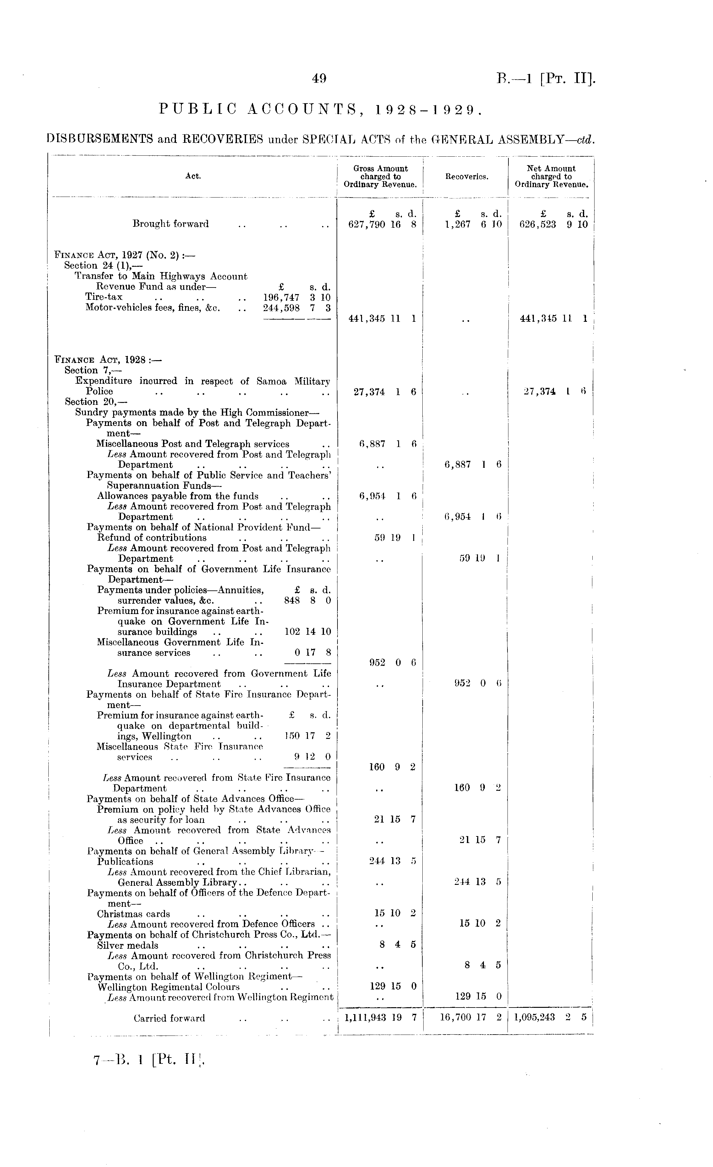 Gross Amount Jfet Amount Act. charged to Recoveries. charged to Ordinary Revenue. Ordinary Revenue. £ s. d. £ s. d. £ s. d. Brought forward .. .. .. 627,790 10 8 1,267 6 10 626,523 9 10 Finance Act, 1927 (No. 2) Section 24 (1), — Transfer to Main Highways Account Revenue Fund as under— £ s. d. Tire-tax .. .. .. 196,747 3 10 Motor-vehicles fees, fines, &c. .. 244,598 7 3 441,345 11 1 .. ! 441,345 11 1 Finance Act, 1928 :— Section 7, —- Expenditure incurred in respect of Samoa Military Police .. .. .. .. .'. 27,374 1 6 .. 27,374 I 6 Section 20, — Sundry payments made by the High Commissioner—Payments on behalf of Post and Telegraph Department— Miscellaneous Post and Telegraph services .. 6,887 1 6 Less Amount recovered from Post and Telegraph j Department .. .. .. .. .. 6,88716 Payments on behalf of Public Service and Teachers' Superannuation Funds— Allowances payable from the funds .. .. 6,954 1 6 Less Amount recovered from Post and Telegraph Department .. .. . . .. .. 6,954 1 6 Payments on behalf of National Provident Fund— Refund of contributions .. . . .. i 59 19 I Less Amount recovered from Post and Telegraph Department .. .. .. . . I .. 59191 Payments on behalf of Government Life Insurance Department— Payments under policies—Annuities, £ s. d. surrender values, &c. .. 848 8 0 Premium for insurance against earthquake on Government Life Insurance buildings .. .. 102 14 10 Miscellaneous Government Life Insurance services .. .. 0 17 8 952 0 6 Less Amount recovered from Government Life Insurance Department .. .. .. .. 952 0 6 Payments on behalf of State Fire Insurance Department— Premium for insurance against earth- £ s. d. quake on departmental buildings, Wellington .. .. 150 17 2 Miscellaneous State Fire Insurance services .. .. . . 9 12 0 160 9 2 Less Amount recovered from State Fire Insurance Department . . .. .. . . .. 160 9 2 Payments on behalf of State Advances Office— Premium on policy held by State Advances Office . as security for loan .. .. .. 21 15 7 Less Amount recovered from State Advances ' Office I .. 21 15 7 Payments on behalf of General Assembly Library— Publications .. .. .. .. j 244 13 5 Less Amount recovered from the Chief Librarian, General Assembly Library.. .. .. j .. 244 13 5 Payments on behalf of Officers of the Defence Department — Christmas cards .. .. .. .. I 15 10 2 Less Amount recovered from Defence Officers .. .. 15 10 2 Payments on behalf of Christchurch Press Co., Ltd. — Silver medals .. .. .. .. 8 4 5 Less Amount recovered from Christchurch Press Co., Ltd. .. .. .. .. .. 845 Payments on behalf of Wellington Regiment— Wellington Regimental Colours .. .. 129 15 0 Less Amount recovered from Wellington Regiment .. 129 15 0 Carried forward .. .. .. 1,111,943 19 7 16,700 17 2 1,095,243 2 5