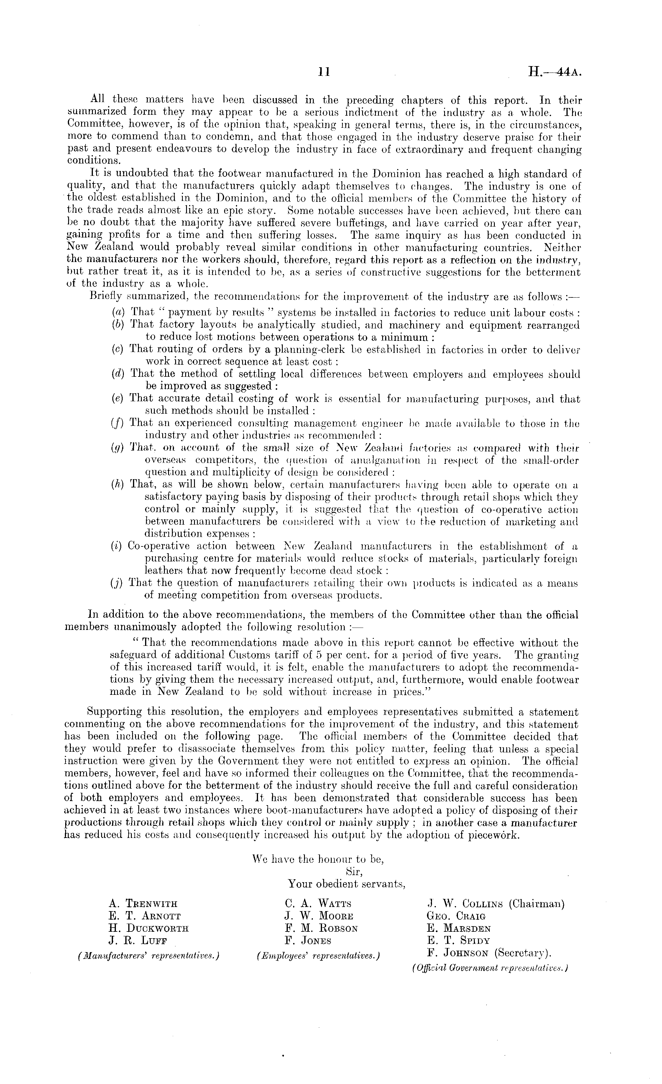 All these matters have been discussed in the preceding chapters of this report. In their summarized form they may appear to be a serious indictment of the industry as a whole. The Committee, however, is of the opinion that, speaking in general terms, there is, in the circumstances, more to commend than to condemn, and that those engaged in the industry deserve praise for their past and present endeavours to develop the industry in face of extraordinary and frequent changing conditions. It is undoubted that the footwear manufactured in the Dominion has reached a high standard of quality, and that the manufacturers quickly adapt themselves to changes. The industry is one of the oldest established in the Dominion, and to the official members of the Committee the history of the trade reads almost like an epic story. Some notable successes have been achieved, but there can be no doubt that the majority have suffered severe bufferings, and have carried on year after year, gaining profits for a time and then suffering losses. The same inquiry as has been conducted in New Zealand would probably reveal similar conditions in other manufacturing countries. Neither the manufacturers nor the workers should, therefore, regard this report as a. reflection on the industry, but rather treat it, as it is intended to be, as a series of constructive suggestions for the betterment of the industry as a whole. Briefly summarized, the recommendations for the improvement of the industry are as follows : — (а) That " payment by results " systems be installed in factories to reduce unit labour costs : (б) That factory layouts be analytically studied, and machinery and equipment rearranged to reduce lost motions between operations to a minimum : (c) That routing of orders by a planning-clerk be established in factories in order to deliver work in correct sequence at least cost: (d) That the method of settling local differences between employers and employees should be improved as suggested : (e) That accurate detail costing of work is essential for manufacturing purposes, and that such methods should be installed : (/) That an experienced consulting management engineer be made available to those in the industry and other industries as recommended : (g) That, on account of the small size of New Zealand factories as compared with their overseas competitors, the question of amalgamation in respect of the small-order question and multiplicity of design be considered : (h) That, as will be shown below, certain manufacturers having been able to operate oil a satisfactory paying basis by disposing of their products through retail shops which they control or mainly supply, it is suggested that the question of co-operative action between manufacturers be considered with a view to the reduction of marketing and distribution expenses : (i) Co-operative action between New Zealand manufacturers in the establishment of a purchasing centre for materials would reduce stocks of materials, particularly foreign leathers that now frequently become dead stock : (j) That the question of manufacturers retailing their own products is indicated as a means of meeting competition from overseas products. In addition to the above recommendations, the members of the Committee other than the official members unanimously adopted the following resolution : — " That the recommendations made above in this report cannot be effective without the safeguard of additional Customs tariff of 5 per cent, for a period of five years. The granting of this increased tariff woidd, it is felt, enable the manufacturers to adopt the recommendations by giving them the necessary increased output, and, furthermore, would enable footwear made in New Zealand to be sold without increase in prices." Supporting this resolution, the employers and employees representatives submitted a statement commenting on the above recommendations for the improvement of the industry, and this statement has been included on the following page. The official members of the Committee decided that they would prefer to disassociate themselves from this policy matter, feeling that unless a special instruction were given by the Government they were not entitled to express an opinion. The official members, however, feel and have so informed their colleagues 011 the Committee, that the recommendations outlined above for the betterment of the industry should receive the full and careful consideration of both employers and employees. It has been demonstrated that considerable success has been achieved in at least two instances where boot-manufacturers have adopted a policy of disposing of their productions through retail shops which they control or mainly supply ; in another case a manufacturer has reduced his costs and consequently increased his output by the adoption of piecework. We have the honour to be, Sir, Your obedient servants, A. Teenwith C. A. Watts J. W. Collins (Chairman) E. T. Arnott J. W. Moore Geo. Craig H. Duckworth F. M. Bobson E. Marsden J. B. Luff F. Jones E. T. Spidy (Manufacturers' representatives.) (Employees' representatives.) 1* • JOHNSON (Secretary). (Official Government representatives.)