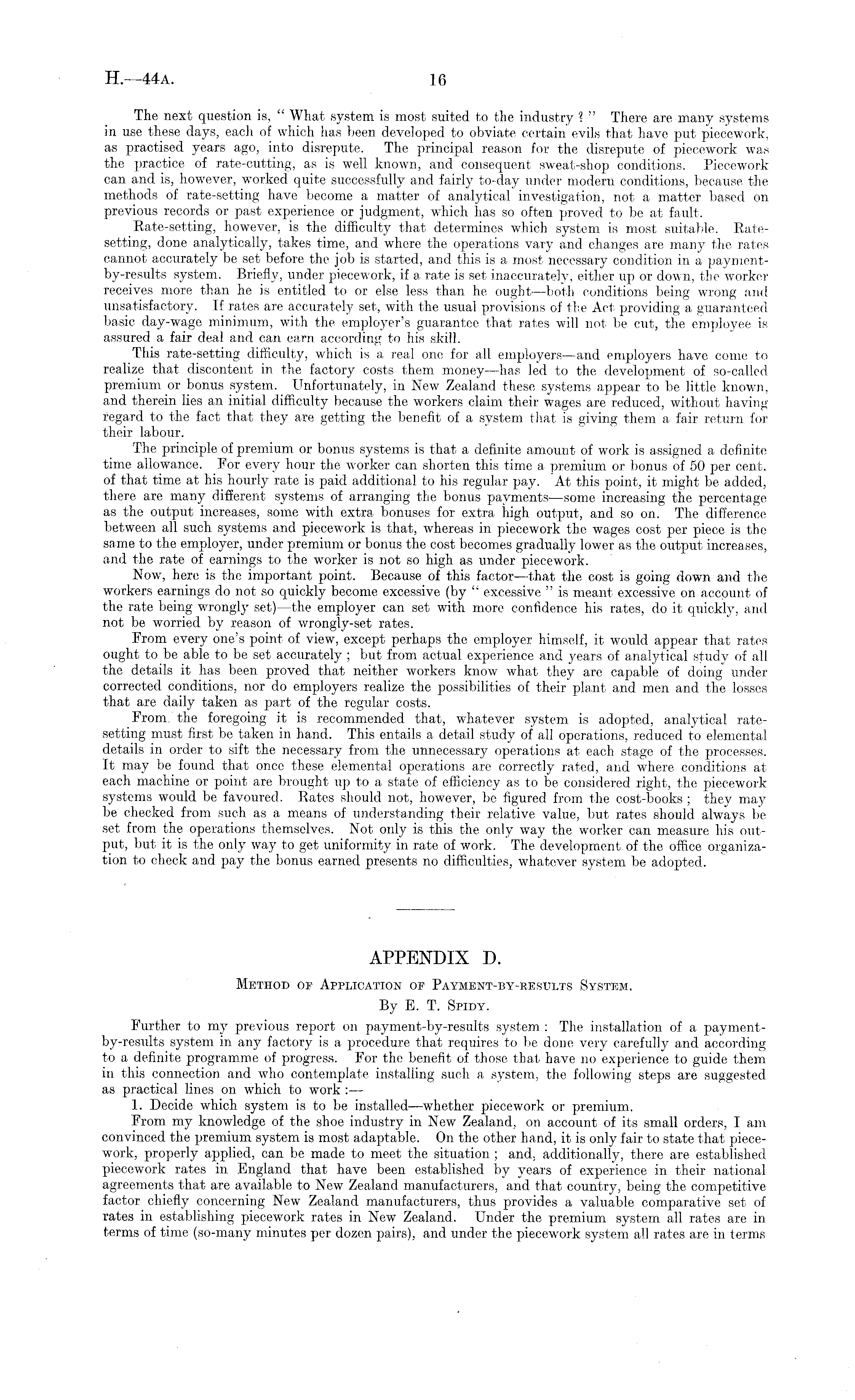 The next question is, " What system is most suited to the industry ? " There are many systems in use these days, each of which lias been developed to obviate certain evils that have put piecework, as practised years ago, into disrepute. The principal reason for the disrepute of piecework was the practice of rate-cutting, as is well known, and consequent sweat-shop conditions. Piecework can and is, however, worked quite successfully and fairly to-day under modern conditions, because the methods of rate-setting have become a matter of analytical investigation, not a matter based on previous records or past experience or judgment, which has so often proved to be at fault. Rate-setting, however, is the difficulty that determines which system is most suitable. Ratesetting, done analytically, takes time, and where the operations vary and changes are many the rates cannot accurately be set before the job is started, and this is a most necessary condition in a payment-by-results system. Briefly, under piecework, if a- rate is set inaccurately, either up or down, the worker receives more than he is entitled to or else less than he ought—both conditions being wrong and unsatisfactory. If rates are accurately set, with the usual provisions of the Act providing a guaranteed basic day-wage minimum, with the employer's guarantee that rates will not be cut, the employee is assured a fair deal and can earn according to his skill. This rate-setting difficulty, which is a real one for all employers—and employers have come to realize that discontent in the factory costs them money —has led to the development of so-called premium or bonus system. Unfortunately, in New Zealand these systems appear to be little known, and therein lies an initial difficulty because the workers claim their wages are reduced, without having regard to the fact that they are getting the benefit of a system that is giving them a fair return for their labour. The principle of premium or bonus systems is that, a definite amount of work is assigned a definite time allowance. For every hour the worker can shorten this time a premium or bonus of 50 per cent, of that time at his hourly rate is paid additional to his regular pay. At this point, it might be added, there are many different systems of arranging the bonus payments—some increasing the percentage as the output increases, some with extra bonuses for extra high output, and so on. The difference between all such systems and piecework is that, whereas in piecework the wages cost per piece is the same to the employer, under premium or bonus the cost becomes gradually lower as the output increases, and the rate of earnings to the worker is not so high as under piecework. Now, here is the important point. Because of this factor—that the cost is going down and the workers earnings do not so quickly become excessive (by " excessive " is meant excessive on account of the rate being wrongly set) —the employer can set with more confidence his rates, do it quickly, and not be worried by reason of wrongly-set rates. From every one's point of view, except perhaps the employer himself, it would appear that rates ought to be able to be set accurately ; but from actual experience and years of analytical study of all the details it has been proved that neither workers know what they are capable of doing under corrected conditions, nor do employers realize the possibilities of their plant and men and the losses that are daily taken as part of the regular costs. From the foregoing it is recommended that, whatever system is adopted, analytical ratesetting must first be taken in hand. This entails a detail study of all operations, reduced to elemental details in order to sift the necessary from the unnecessary operations at each stage of the processes. It may be found that once these elemental operations are correctly rated, and where conditions at each machine or point are brought up to a state of efficiency as to be considered right, the piecework systems would be favoured. Rates should not, however, be figured from the cost-books ; they may be checked from such as a means of understanding their relative value, but rates should always be set from the operations themselves. Not only is this the only way the worker can measure his output, but it is the only way to get uniformity in rate of work. The development of the office organization to check and pay the bonus earned presents no difficulties, whatever system be adopted. APPENDIX D. Method op Application op Payment-by-results System. By E. T. Spidy. Further to my previous report on payment-by-results system : The installation of a payment-by-results system in any factory is a procedure that requires to be done very carefully and according to a definite programme of progress. For the benefit of those that have no experience to guide them in this connection and who contemplate installing such a system, the following steps are suggested as practical lines on which to work : — 1. Decide which system is to be installed—whether piecework or premium. From my knowledge of the shoe industry in New Zealand, on account of its small orders, lam convinced the premium system is most adaptable. On the other hand, it is only fair to state that piecework, properly applied, can be made to meet the situation ; and, additionally, there are established piecework rates in England that have been established by years of experience in their national agreements that are available to New Zealand manufacturers, and that country, being the competitive factor chiefly concerning New Zealand manufacturers, thus provides a valuable comparative set of rates in establishing piecework rates in New Zealand. Under the premium system all rates are in terms of time (so-many minutes per dozen pairs), and under the piecework system all rates are in terms