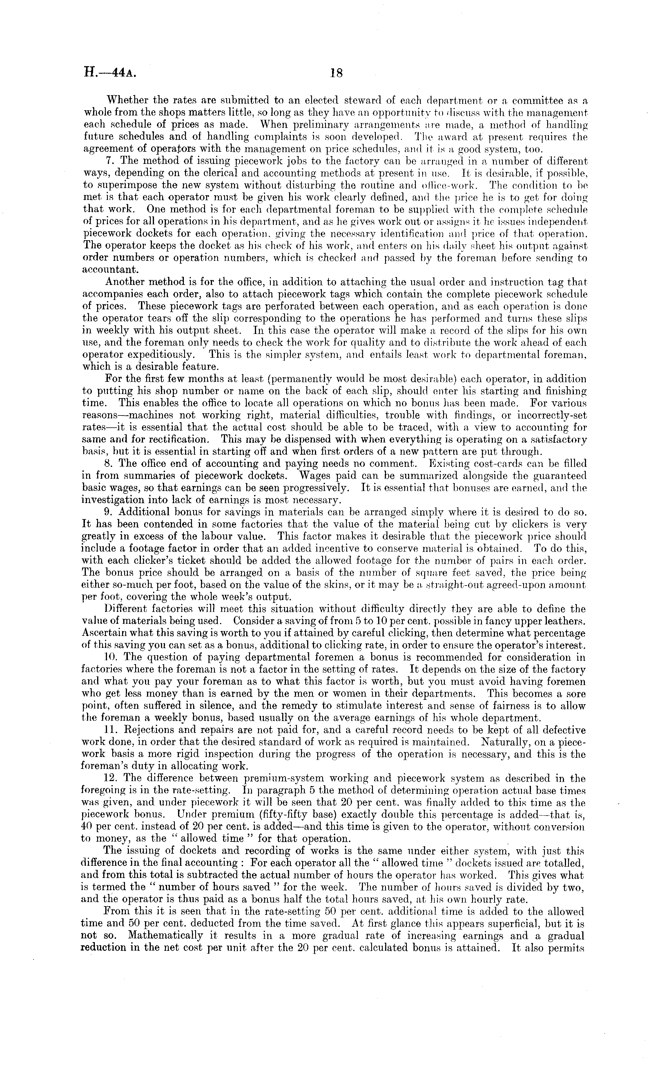 Whether the rates are submitted to an elected steward of each department or a committee as a whole from the shops matters little, so long as they have an opportunity to discuss with the management each schedule of prices as made. When preliminary arrangements are made, a method of handling future schedules and of handling complaints is soon developed. The award at present requires the agreement of operators with the management on price schedules, and it is a good system, too. 7. The method of issuing piecework jobs to the factory can be arranged in a number of different ways, depending on the clerical and accounting methods at present in use. It is desirable, if possible, to superimpose the new system without disturbing the routine and office-work. The condition to be met is that each operator must be given his work clearly defined, and the price he is to get for doing that work. One method is for each departmental foreman to be supplied with the complete schedule of prices for all operations in his department, and as he gives work out or assigns it he issues independent piecework dockets for each operation, giving the necessary identification and price of that operation. The operator keeps the docket as his check of his work, ancl enters on his daily sheet his output against order numbers or operation numbers, which is checked and passed by the foreman before sending to accountant. Another method is for the office, in addition to attaching the usual order and instruction tag that accompanies each order, also to attach piecework tags which contain the complete piecework schedule of prices. These piecework tags are perforated between each operation, and as each operation is done the operator tears off the slip corresponding to the operations he has performed and turns these slips in weekly with his output sheet. In this case the operator will make a record of the slips for his own use, and the foreman only needs to check the work for quality and to distribute the work ahead of each operator expeditiously. This is the simpler system, and entails least work to departmental foreman, which is a desirable feature. For the first few months at least (permanently would be most desirable) each operator, in addition to putting his shop number or name on the back of each slip, should, enter his starting and finishing time. This enables the office to locate all operations on which no bonus has been made. For various reasons—machines not working right, material difficulties, trouble with findings, or incorrectly-set rates —it is essential that the actual cost should be able to be traced, with a view to accounting for same and for rectification. This may be dispensed with when everything is operating on a satisfactory basis, but it is essential in starting off and when first orders of a new pattern are put through. 8. The office end of accounting and paying needs no comment. Existing cost-cards can be filled in from summaries of piecework dockets. Wages paid can be summarized alongside the guaranteed basic wages, so that earnings can be seen progressively. It is essential that bonuses are earned, and the investigation into lack of earnings is most necessary. 9. Additional bonus for savings in materials can be arranged simply where it is desired to do so. It has been contended in some factories that the value of the material being cut by clickers is very greatly in excess of the labour value. This factor makes it desirable that the piecework price should include a footage factor in order that an added incentive to conserve material is obtained. To do this, with each clicker's ticket should be added the allowed footage for the number of pairs in each order. The bonus price should be arranged on a basis of the number of square feet saved, the price being either so-much per foot, based on the value of the skins, or it may be a straight-out agreed-upon amount per foot, covering the whole week's output. Different factories will meet this situation without difficulty directly they are able to define the value of materials being used. Consider a saving of from sto 10 per cent, possible in fancy upper leathers. Ascertain what this saving is worth to you if attained by careful clicking, then determine what percentage of this saving you can set as a bonus, additional to clicking rate, in order to ensure the operator's interest. 10. The question of paying departmental foremen a bonus is recommended for consideration in factories where the foreman is not a factor in the setting of rates. It depends on the size of the factory and what you pay your foreman as to what this factor is worth, but you must avoid having foremen who get less money than is earned by the men or women in their departments. This becomes a sore point, often suffered in silence, and the remedy to stimulate interest and sense of fairness is to allow the foreman a weekly bonus, based usually on the average earnings of his whole department. 11. Rejections and repairs are not paid for, and a careful record needs to be kept of all defective work done, in order that the desired standard of work as required is maintained. Naturally, on a piecework basis a more rigid inspection during the progress of the operation is necessary, and this is the foreman's duty in allocating work. 12. The difference between premium-system working and piecework system as described in the foregoing is in the rate-setting. In paragraph 5 the method of determining operation actual base times was given, and under piecework it will be seen that 20 per cent, was finally added to this time as the piecework bonus. Under premium (fifty-fifty base) exactly double this percentage is added —that is, 40 per cent, instead of 20 per cent, is added —and this time is given to the operator, without conversion to money, as the " allowed time " for that operation. The issuing of dockets and recording of works is the same under either system, with iust this difference in the final accoun