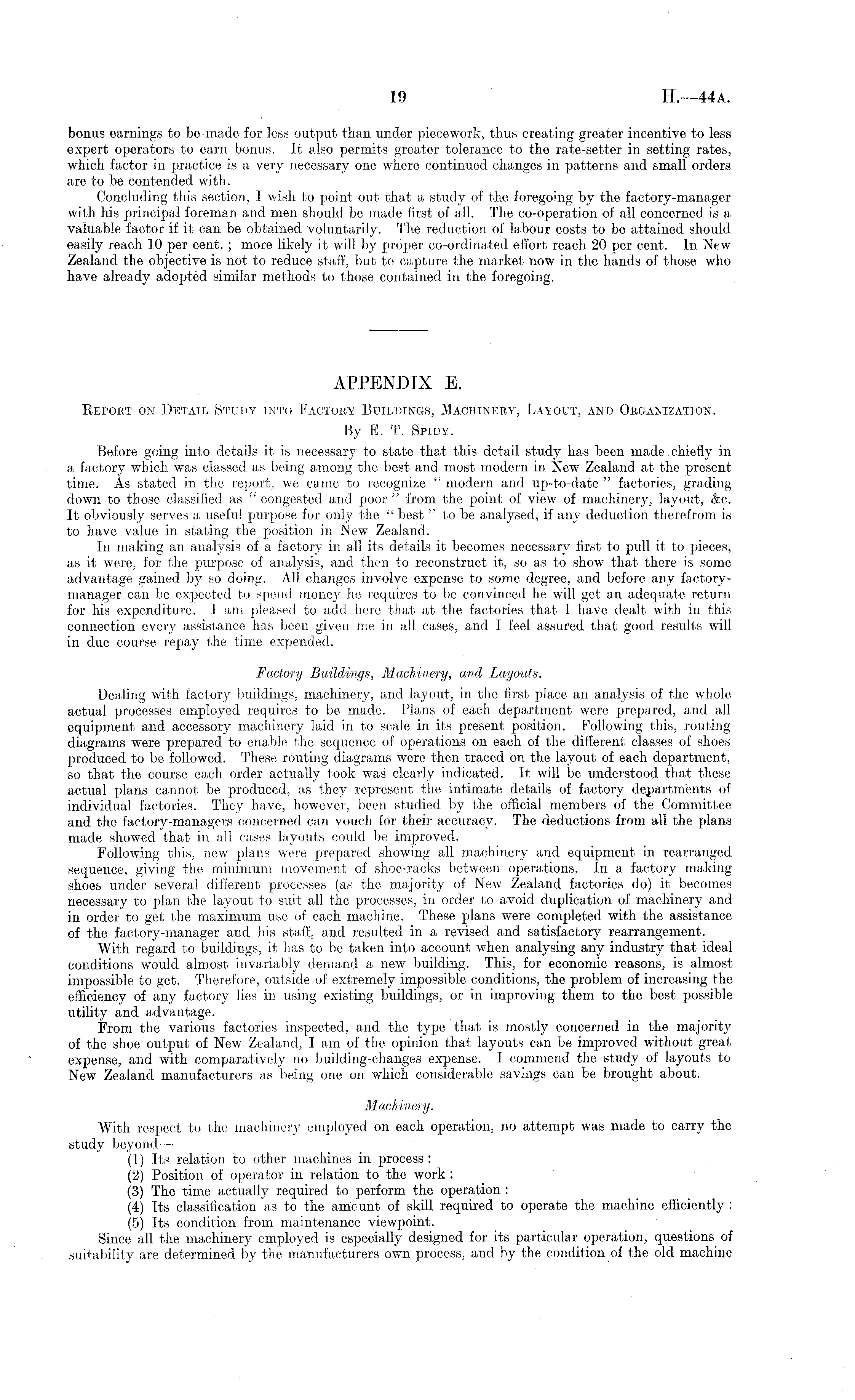 bonus earnings to be made for less output than under piecework, thus creating greater incentive to less expert operators to earn bonus. It also permits greater tolerance to the rate-setter in setting rates, which factor in practice is a very necessary one where continued changes in patterns and small orders are to be contended with. Concluding this section, I wish to point out that a study of the foregoing by the factory-manager with his principal foreman and men should be made first of all. The co-operation of all concerned is a valuable factor if it can be obtained voluntarily. The reduction of labour costs to be attained should easily reach 10 per cent. ; more likely it will by proper co-ordinated effort reach 20 per cent. In New Zealand the objective is not to reduce staff, but to capture the market now in the hands of those who have already adopted similar methods to those contained in the foregoing. APPENDIX E. Report on Detail Study into Factory Buildings, Machinery, Layout, and Organization. By E. T. Spidy. Before going into details it is necessary to state that this detail study has been made chiefly in a factory which was classed as being among the best and most modern in New Zealand at the present time. As stated in the report, we came to recognize " modern and up-to-date " factories, grading down to those classified as " congested and poor " from the point of view of machinery, layout, &c. It obviously serves a useful purpose for only the " best " to be analysed, if any deduction therefrom is to have value in stating the position in New Zealand. In making an analysis of a factory in all its details it becomes necessary first to pull it to pieces, as it were, for the purpose of analysis, and then to reconstruct it, so as to show that there is some advantage gained by so doing. All changes involve expense to some degree, and before any factorymanager can be expected to spend money he requires to be convinced he will get an adequate return for his expenditure. I am pleased to add here that at the factories that 1 have dealt with in this connection every assistance has been given me in all cases, and 1 feel assured that good results will in due course repay the time expended. Factory Buildings, Machinery, and Layouts. Dealing with factory buildings, machinery, and layout, in the first place an analysis of the whole actual processes employed requires to be made. Plans of each department were prepared, and all equipment and accessory machinery laid in to scale in its present position. Following this, routing diagrams were prepared to enable the sequence of operations on each of the different classes of shoes produced to be followed. These routing diagrams were then traced on the layout of each department, so that the course each order actually took was clearly indicated. It will be understood that these actual plans cannot be produced, as they represent the intimate details of factory departments of individual factories. They have, however, been studied by the official members of the Committee and the factory-managers concerned can vouch for their accuracy. The deductions from all the plans made showed that in all cases layouts could be improved. Following this, new plans were prepared showing all machinery and equipment in rearranged sequence, giving the minimum movement of shoe-racks between operations. In a factory making shoes under several different processes (as the majority of New Zealand factories do) it becomes necessary to plan the layout to suit all the processes, in order to avoid duplication of machinery and in order to get the maximum use of each machine. These plans were completed with the assistance of the factory-manager and his staff, and resulted in a revised and satisfactory rearrangement. With regard to buildings, it lias to be taken into account when analysing any industry that ideal conditions would almost invariably demand a new building. This, for economic reasons, is almost impossible to get. Therefore, outside of extremely impossible conditions, the problem of increasing the efficiency of any factory lies in using existing buildings, or in improving them to the best possible utility and advantage. From the various factories inspected, and the type that is mostly concerned in the majority of the shoe output of New Zealand, I am of the opinion that layouts can be improved without great expense, and with comparatively no building-changes expense. I commend the study of layouts to New Zealand manufacturers as being one on which considerable savmgs can be brought about. Machinery. With respect to the machinery employed on each operation, no attempt was made to carry the study beyond— (1) Its relation to other machines in process : (2) Position of operator in relation to the work : (3) The time actually required to perform the operation : (4) Its classification as to the amount of skill required to operate the machine efficiently : (5) Its condition from maintenance viewpoint. Since all the machinery employed is especially designed for its particular operation, questions of suitability are determined by the manufaeturers own process, and by the condition of the old machine