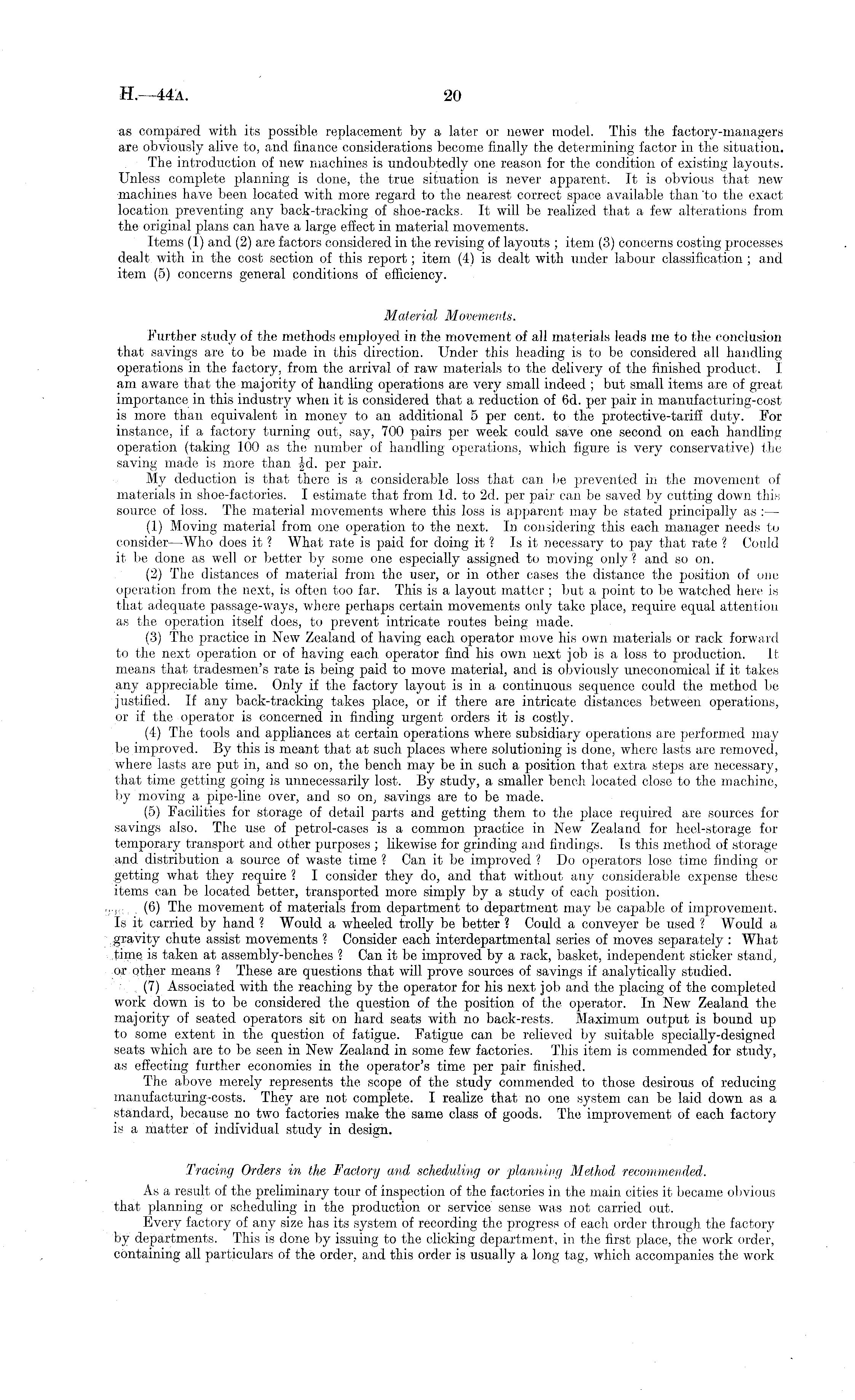 as compared with its possible replacement by a later or newer model. This the factory-managers are obviously alive to, and finance considerations become finally the determining factor in the situation. The introduction of new machines is undoubtedly one reason for the condition of existing layouts. Unless complete planning is done, the true situation is never apparent. It is obvious that new machines have been located with more regard to the nearest correct space available than 'to the exact location preventing any back-tracking of shoe-racks. It will be realized that a few alterations from the original plans can have a large effect in material movements. Items (1) and (2) are factors considered in the revising of layouts ; item (3) concerns costing processes dealt with in the cost section of this report; item (4) is dealt with under labour classification ; and item (5) concerns general conditions of efficiency. Material Movements. Further study of the methods employed in the movement of all materials leads me to the conclusion that savings are to be made in this direction. Under this heading is to be considered all handling operations in the factory, from the arrival of raw materials to the delivery of the finished product. I am aware that the majority of handling operations are very small indeed ; but small items are of great importance in this industry when it is considered that a reduction of 6d. per pair in manufacturing-cost is more than equivalent in money to an additional 5 per cent, to the protective-tariff duty. For instance, if a factory turning out, say, 700 pairs per week could save one second on each handling operation (taking 100 as the number of handling operations, which figure is very conservative) the saving made is more than -|d. per pair. My deduction is that there is a considerable loss that can be prevented in the movement of materials in shoe-factories. I estimate that from Id. to 2d. per pair can be saved by cutting down this source of loss. The material movements where this loss is apparent may be stated principally as : — (1) Moving material from one operation to the next. In considering this each manager needs to consider—Who does it ? What rate is paid for doing it ? Is it necessary to pay that rate ? Could it be done as well or better by some one especially assigned to moving only? and so on. (2) The distances of material from the user, or in other cases the distance the position of one operation from the next, is often too far. This is a layout matter ; but a point to be watched here is that adequate passage-ways, where perhaps certain movements only take place, require equal attention as the operation itself does, to prevent intricate routes being made. (3) The practice in New Zealand of having each operator move his own materials or rack forward to the next operation or of having each operator find his own next job is a loss to production. It means that tradesmen's rate is being paid to move material, and is obviously uneconomical if it takes any appreciable time. Only if the factory layout is in a continuous sequence could the method be justified. If any back-tracking takes place, or if there are intricate distances between operations, or if the operator is concerned in finding urgent orders it is costly. (4) The tools and appliances at certain operations where subsidiary operations are performed may be improved. By this is meant that at such places where solutioning is done, where lasts are removed, where lasts are put in, and so on, the bench may be in such a position that extra steps are necessary, that time getting going is unnecessarily lost. By study, a smaller bench located close to the machine, by moving a pipe-line over, and so on, savings are to be made. (5) Facilities for storage of detail parts and getting them to the place required are sources for savings also. The use of petrol-cases is a common practice in New Zealand for heel-storage for temporary transport and other purposes ; likewise for grinding and findings. Is this method of storage and distribution a source of waste time ? Can it be improved ? Do operators lose time finding or getting what they require ? I consider they do, and that without any considerable expense these items can be located better, transported more simply by a study of each position. (6) The movement of materials from department to department may be capable of improvement. Is it carried by hand ? Would a wheeled trolly be better ? Could a conveyer be used ? Would a gravity chute assist movements ? Consider each interdepartmental series of moves separately : What time is taken at assembly-benches ? Can it be improved by a rack, basket, independent sticker stand, or other means ? These are questions that will prove sources of savings if analytically studied. (7) Associated with the reaching by the operator for his next job and the placing of the completed work down is to be considered the question of the position of the operator. In New Zealand the majority of seated operators sit on hard seats with no back-rests. Maximum output is bound up to some extent in the question of fatigue. Fatigue can be relieved by suitable specially-designed seats which are to be seen in New Zealand in some few factories. This item is commended for study, as effecting further economies in the operator's time per pair finished. The above merely represents the scope of the study commended to those desirous of reducing manufacturing-costs. They are not complete. I realize that no one system can be laid down as a standard, because no two factories make the same class of goods. The improvement of each factory is a matter of individual study in design. Tracing Orders in the Factory and scheduling or planning Method recommended. As a result of the preliminary tour of inspection of the factories in the main cities it became obvious that planning or scheduling in the production or service sense was not carried out. Every factory of any size h