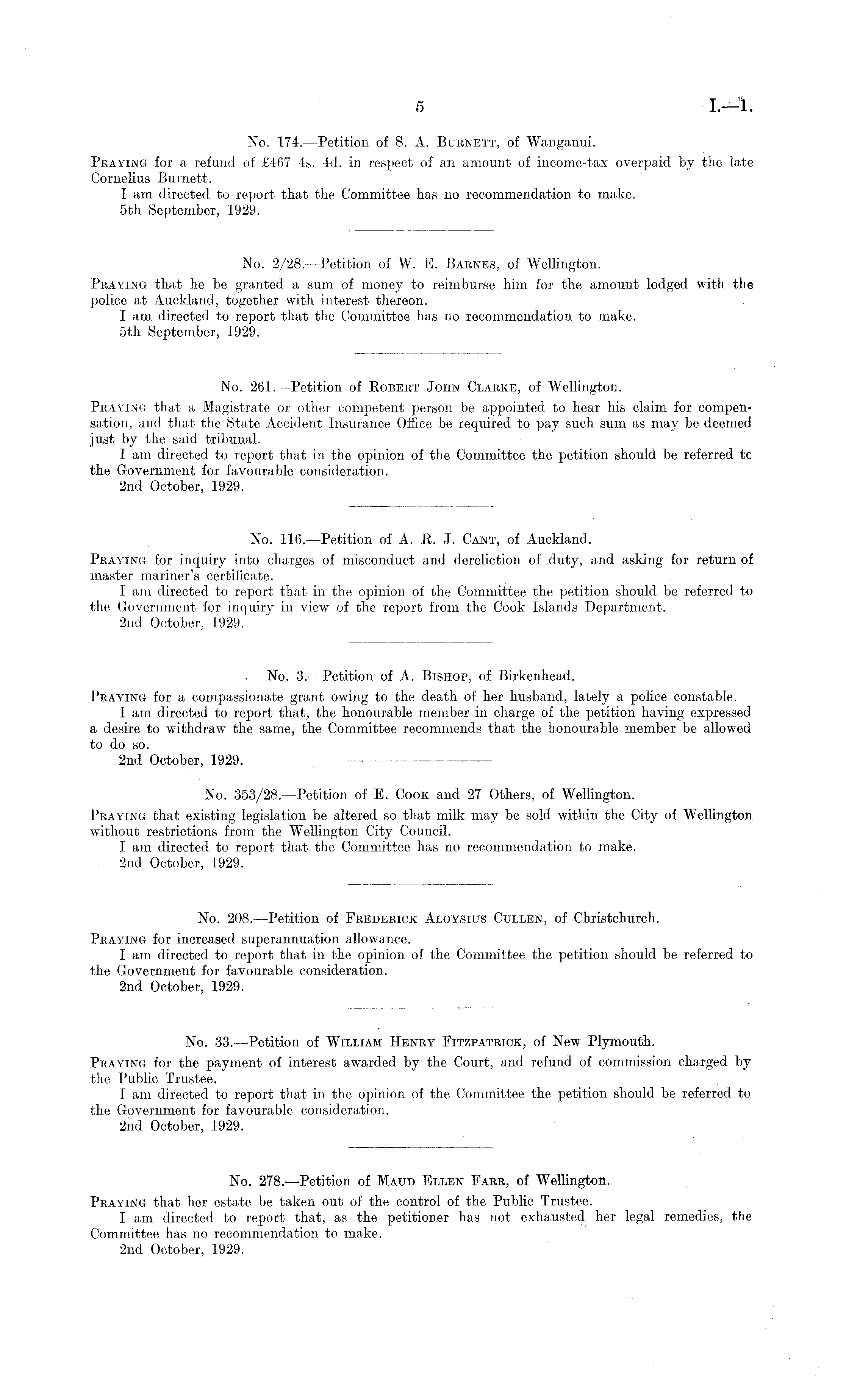 No. 174.—Petition of S. A. Burnett, of Wanganui. Praying for a refund of £467 4s. 4d. in respect of an amount of income-tax overpaid by the late Cornelius Burnett. I am directed to report that the Committee has no recommendation to make. sth September, 1929.