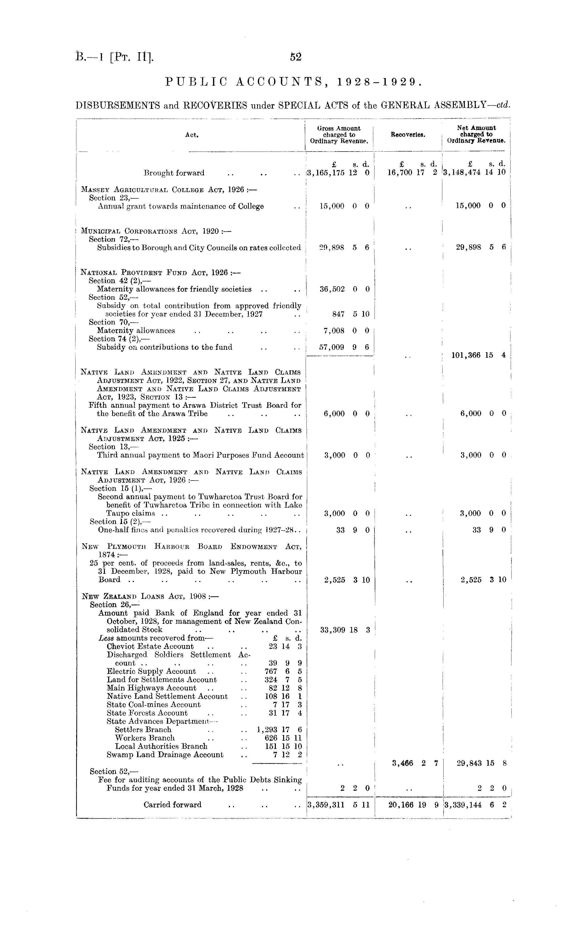 Uross Amount Net Amount Act. charged to Recoveries. charged to Ordinary Revenue. Ordinary Revenue. £ s. d. £ s. d. : £ s. d. Brought forward .. .. .. 3,165,175 12 0 16,700 17 2 '3,148,474 14 10 Massey Agricultural College Act, 1926 : — Section 23, — Annual grant towards maintenance of College . . 15,000 0 0 .. 15,000 0 0 Municipal Corporations Act, 1920 :— Section 72, — Subsidies to Borough and City Councils on rates collected j 29,898 5 6 .. 29,898 5 6 National Provident Fund Act, 1926 :— Section 42 (2),' — Maternity allowances for friendly societies .. .. 36,502 0 0 Section 52, — Subsidy on total contribution from approved friendly societies for year ended 31 December, 1927 .. ! 847 5 10 Section 70, — Maternity allowances .. .. .. .. 7,008 0 0 Section 74 (2),— Subsidy on contributions to the fund .. . . j 57,009 9 6 — .. 101,366 15 4 Native Land Amendment and Native Land Claims Adjustment Act, 1922, Section 27, and Native Land Amendment and Native Land Claims Adjustment ; Act, 1923, Section 13 : — Fifth annual payment to Arawa District Trust Board for the benefit of the Arawa Tribe .. .. .. 6,000 0 0 .. 6,000 0 0 n " Native Land Amendment and Native Land Claims Adjustment Act, 1925 : — Section 13, — Third annual payment to Maori Purposes Fund Account j 3,000 0 0 .. 3,000 0 0 I Native Land Amendment and Native Land Claims Adjustment Act, 1926 : — | Section 15 (1),- — Second annual payment to Tuwharetoa Trust Board for benefit of Tuwharetoa Tribe in connection with Lake Taupo claims .. .. .. .. .. 3,000 0 0 I .. 3,000 0 0 Section 15 (2), — One-half fines and penalties recovered during 1927-28.. , 33 9 0 .. 33 9 0 New Plymouth Harbour Board Endowment Act, 1874: — 25 per cent, of proceeds from land-sales, rents, &c., to 31 December, 1928, paid to New Plymouth Harbour Board .. .. .. .. .. .. 2,525 3 10 .. 2,525 3 10 New Zealand Loans Act, 1908 :— Section 26,— Amount paid Bank of England for year ended 31 October, 1928, for management of New Zealand Consolidated Stock .. .. .. .. 33,309 18 3 Less amounts recovered from' — £ s. d. Cheviot Estate Account .. .. 23 14 3 Discharged Soldiers Settlement Account .. .. .. .. 39 9 9 Electric Supply Account . . . . 767 6 5 Land for Settlements Account . . 324 7 5 Main Highways Account .. . . 82 12 8 Native Land Settlement Account . . 108 16 1 State Coal-mines Account . . 7 17 3 State Forests Account . . . . 31 17 4 State Advances Department— Settlers Branch .. .. 1,293 17 6 Workers Branch .. . . 626 15 11 Local Authorities Branch . . 151 15 10 Swamp Land Drainage Account .. 7 12 2 .. : 3,466 2 7 29,843 15 8 Section 52,- — Fee for auditing accounts of the Public Debts Sinking Funds for year ended 31 March, 1928 .. .. 220 .. 220 Carried forward .. .. .. 3,359,311 5 11 1 20,166 19 9 3,339,144 6 2