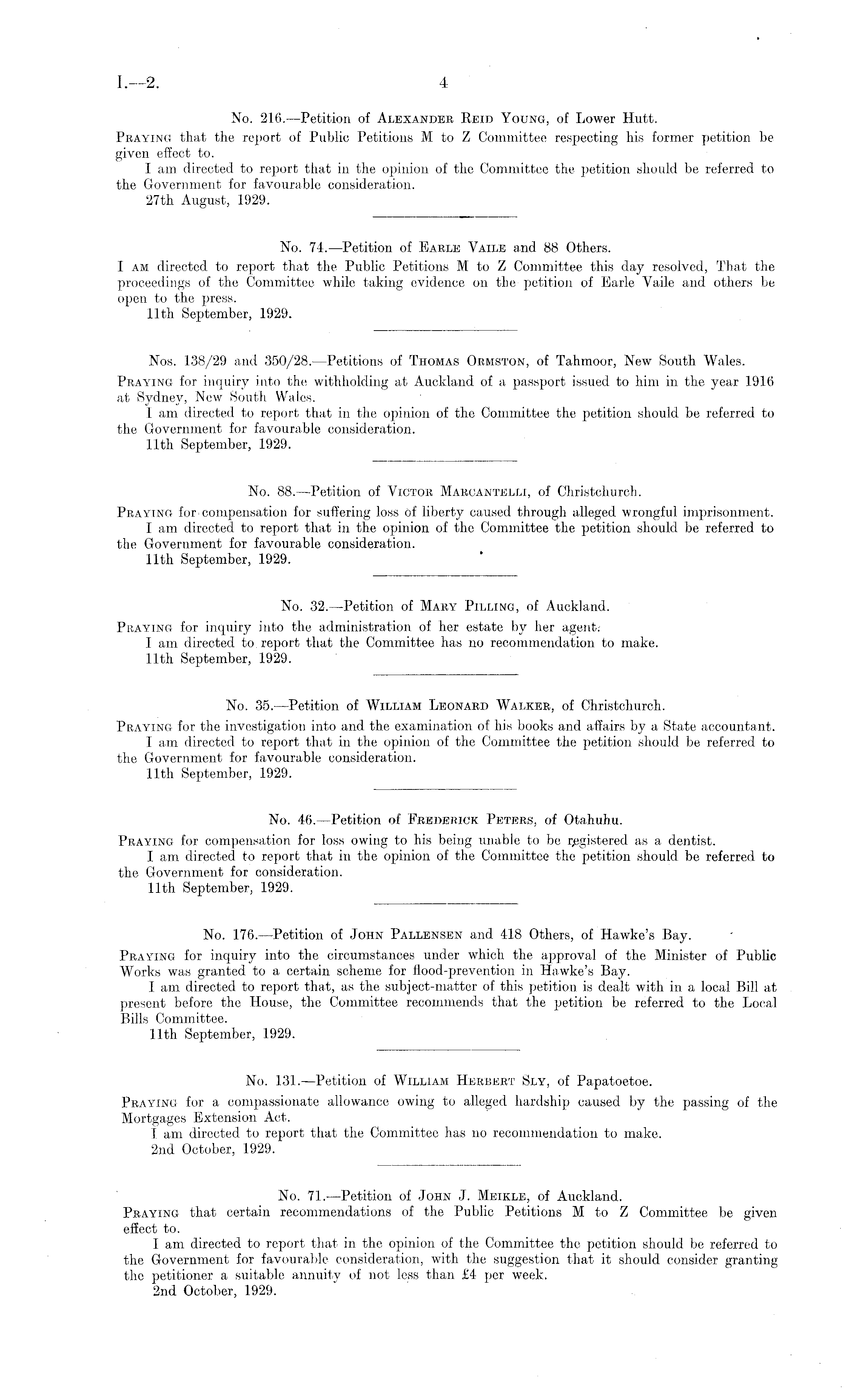 No. 216. —Petition of Alexander Reid Young, of Lower Hutt. Praying that the report of Public Petitions M to Z Committee respecting his former petition be given effect to. I am directed to report that in the opinion of the Committee the petition should be referred to the Government for favourable consideration. 27th August, 1929.