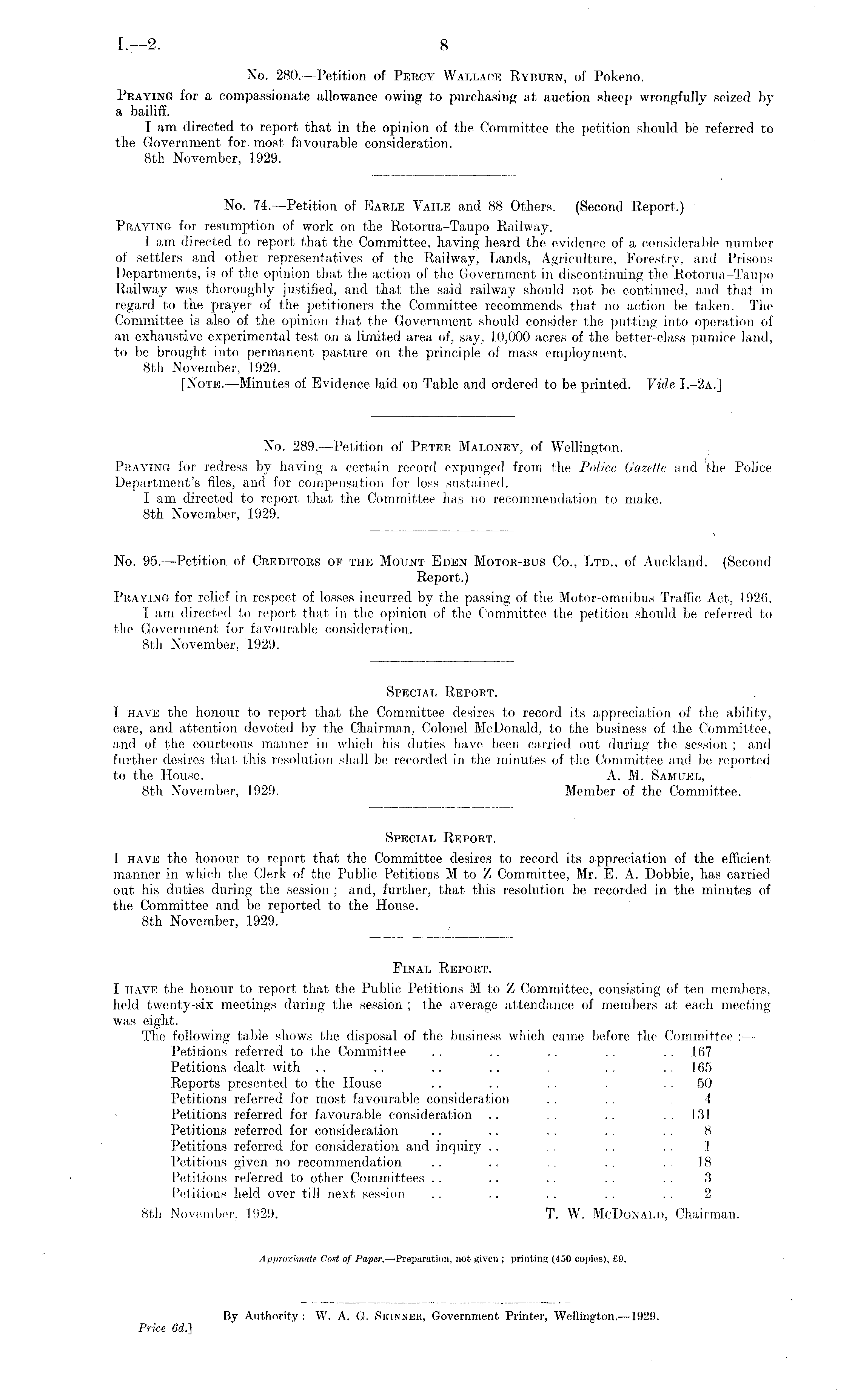 Final Report. T have the honour to report that the Public Petitions M to Z Committee, consisting of ten members, held twenty-six meetings during the session ; the average attendance of members at each meeting was eight. The following table shows the disposal of the business which came before the Committee :— Petitions referred to the Committee .. .. .. . . 167 Petitions dealt with .. .. .. .. . . 165 Reports presented to the House .. .. . 50 Petitions referred for most favourable consideration . . . . .4 Petitions referred for favourable consideration .. .. . . 131 Petitions referred for consideration .. .. . . . . . 8 Petitions referred for consideration and inquiry .. . . . . . . 1 Petitions given no recommendation .. .. . . . 18 Petitions referred to other Committees .. .. . . . . . . 3 Petitions held over till next session .. .. . . . . . . 2 Bth November, 1929. T. W. McDonald, Chairman.