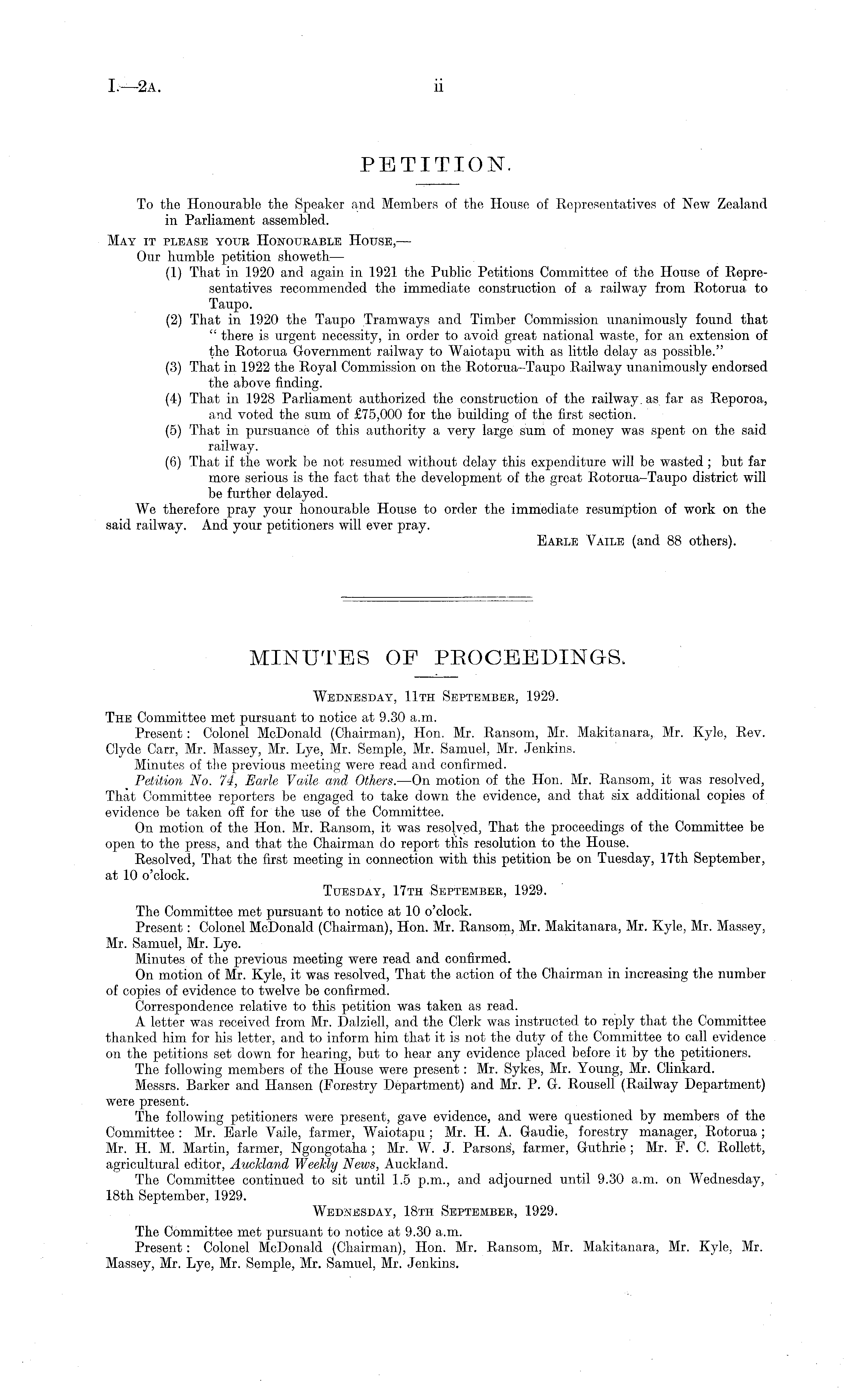 MINUTES OF PROCEEDINGS. Wednesday, 11th September, 1929. The Committee met pursuant to notice at 9.30 a.m. Present: Colonel McDonald (Chairman), Hon. Mr. Ransom, Mr. Makitanara, Mr. Kyle, Rev. Clyde Carr, Mr. Massey, Mr. Lye, Mr. Semple, Mr. Samuel, Mr. Jenkins. Minutes of the previous meeting were read and confirmed. Petition No. 74, Earle Vaile and Others. —On motion of the Hon. Mr. Ransom, it was resolved, That Committee reporters be engaged to take down the evidence, and that six additional copies of evidence be taken off for the use of the Committee. On motion of the Hon. Mr. Ransom, it was resolved, That the proceedings of the Committee be open to the press, and that the Chairman do report this resolution to the House. Resolved, That the first meeting in connection with this petition be on Tuesday, 17th September, at 10 o'clock. Tuesday, 17th September, 1929. The Committee met pursuant to notice at 10 o'clock. Present: Colonel McDonald (Chairman), Hon. Mr. Ransom, Mr. Makitanara, Mr. Kyle, Mr. Massey, Mr. Samuel, Mr. Lye. Minutes of the previous meeting were read and confirmed. On motion of Mr. Kyle, it was resolved, That the action of the Chairman in increasing the number of copies of evidence to twelve be confirmed. Correspondence relative to this petition was taken as read. A letter was received from Mr. Dalziell, and the Clerk was instructed to reply that the Committee thanked him for his letter, and to inform him that it is not the duty of the Committee to call evidence on the petitions set down for hearing, but to hear any evidence placed before it by the petitioners. The following members of the House were present: Mr. Sykes, Mr. Young, Mr. Clinkard. Messrs. Barker and Hansen (Forestry Department) and Mr. P. G. Rousell (Railway Department) were present. The following petitioners were present, gave evidence, and were questioned by members of the Committee : Mr. Earle Vaile, farmer, Waiotapu ; Mr. H. A. Gaudie, forestry manager, Rotorua ; Mr. H. M. Martin, farmer, Ngongotaha ; Mr. W. J. Parsons, farmer, Guthrie ; Mr. F. C. Rollett, agricultural editor, Auckland Weekly News, Auckland. The Committee continued to sit until 1.5 p.m., and adjourned until 9.30 a.m. on Wednesday, 18th September, 1929. Wednesday, 18th September, 1929. The Committee met pursuant to notice at 9.30 a.m. Present: Colonel McDonald (Chairman), Hon. Mr. Ransom, Mr. Makitanara, Mr. Kyle, Mr. Massey, Mr. Lye, Mr. Semple, Mr. Samuel, Mr. Jenkins.