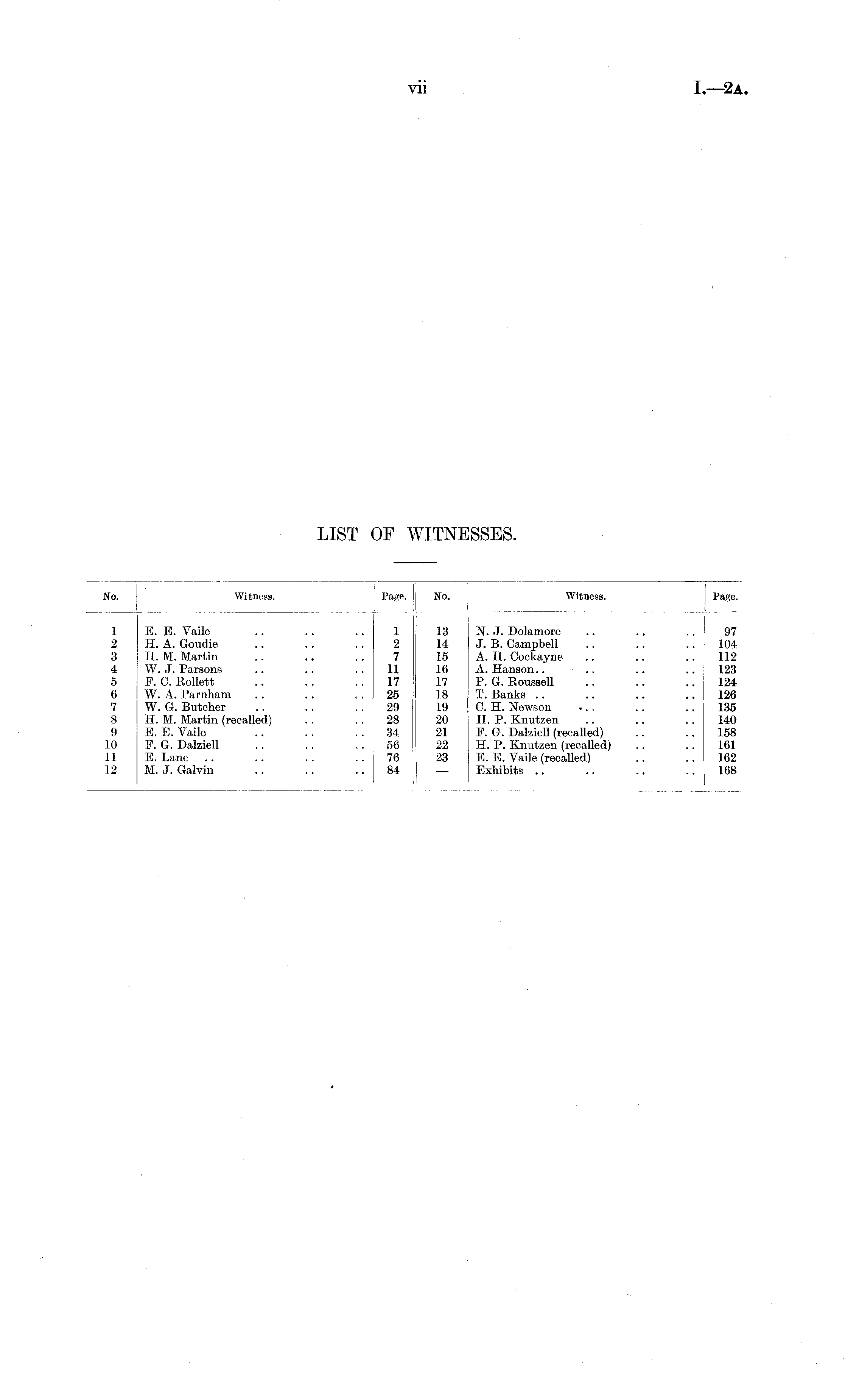 No. Witness. Page. 13 N. J. Dolamore .. .. .. 97 14 J. B. Campbell .. .. .. 10415 A.H.Cockayne .. .. .. 112 16 A.Hanson.. .. .. .. 123 17 P. G. Roussell .. .. .. 124 18 T. Banks .. .. .. .. 126 19 C. H. Newson •. . .. .. 135 20 H. P. Knutzen .. .. . . 140 21 P. G. Dalziell (recalled) .. .. 158 22 H. P. Knutzen (recalled) .. .. 161 23 E. E. Vaile (recalled) .. .. 162 — Exhibits .. .. .. .. 168