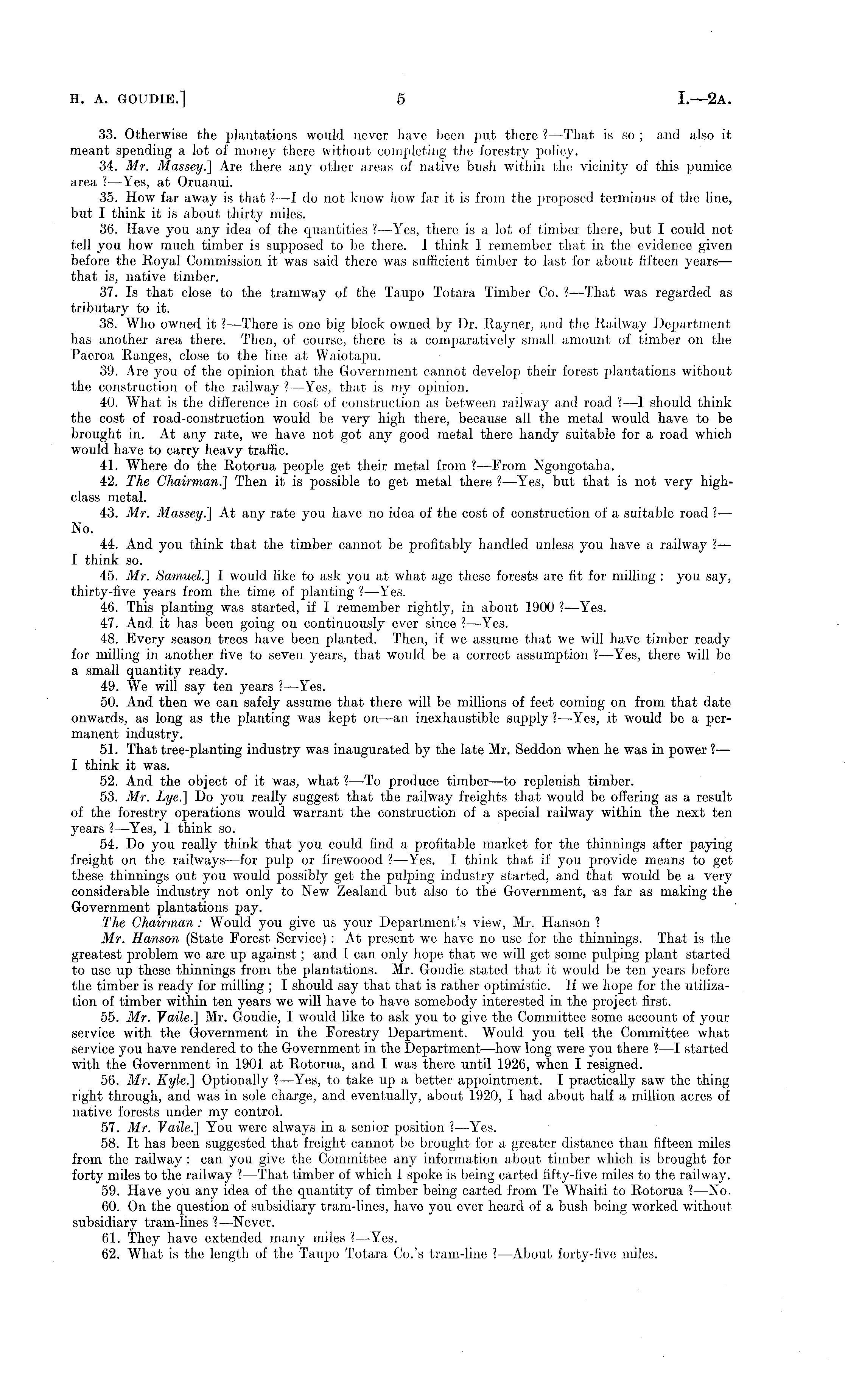 33. Otherwise the plantations would never have been put there ? —That is so ; and also it meant spending a lot of money there without completing the forestry policy. 34. Mr. Massey.] Are there any other areas of native bush within the vicinity of this pumice area ?—Yes, at Oruanui. 35. How far away is that ? —I do not know how far it is from the proposed terminus of the line, but I think it is about thirty miles. 36. Have you any idea of the quantities ? —Yes, there is a lot of timber there, but I could not tell you how much timber is supposed to be there. I think I remember that in the evidence given before the Royal Commission it was said there was sufficient timber to last for about fifteen years — that is, native timber. 37. Is that close to the tramway of the Taupo Totara Timber Co. ?—That was regarded as tributary to it. 38. Who owned it ? —There is one big block owned by Dr. Rayner, and the Railway Department has another area there. Then, of course, there is a comparatively small amount of timber on the Paeroa Ranges, close to the line at Waiotapu. 39. Are you of the opinion that the Government cannot develop their forest plantations without the construction of the railway ? —Yes, that is my opinion. 40. What is the difference in cost of construction as between railway and road ? —I should think the cost of road-construction would be very high there, because all the metal would have to be brought in. At any rate, we have not got any good metal there handy suitable for a road which would have to carry heavy traffic. 41. Where do the Rotorua people get their metal from ?—From Ngongotaha. 42. The Chairman.] Then it is possible to get metal there ? —Yes, but that is not very highclass metal. 43. Mr. Massey.] At any rate you have no idea of the cost of construction of a suitable road ? — No. 44. And you think that the timber cannot be profitably handled unless you have a railway ? — 1 think so. 45. Mr. Samuel.] I would like to ask you at what age these forests are fit for milling : you say, thirty-five years from the time of planting ? —Yes. 46. This planting was started, if I remember rightly, in about 1900 ?—Yes. 47. And it has been going on continuously ever since ?—Yes. 48. Every season trees have been planted. Then, if we assume that we will have timber ready for milling in another five to seven years, that would be a correct assumption ?—Yes, there will be a small quantity ready. 49. We will say ten years ? —Yes. 50. And then we can safely assume that there will be millions of feet coming on from that date onwards, as long as the planting was kept on —an inexhaustible supply?— Yes, it would be a permanent industry. 51. That tree-planting industry was inaugurated by the late Mr. Seddon when he was in power ?— I think it was. 52. And the object of it was, what ? —To produce timber—to replenish timber. 53. Mr. Lye.] Do you really suggest that the railway freights that would be offering as a result of the forestry operations would warrant the construction of a special railway within the next ten years ?—Yes, I think so. 54. Do you really think that you could find a profitable market for the thinnings after paying freight on the railways —for pulp or firewoood ? —Yes. I think that if you provide means to get these thinnings out you would possibly get the pulping industry started, and that would be a very considerable industry not only to New Zealand but also to the Government, -as far as making the Government plantations pay. The Chairman: Would you give us your Department's view, Mr. Hanson ? Mr. Hanson (State Forest Service) : At present we have no use for the thinnings. That is the greatest problem we are up against; and I can only hope that we will get some pulping plant started to use up these thinnings from the plantations. Mr. Goudie stated that it would be ten years before the timber is ready for milling ; I should say that that is rather optimistic. If we hope for the utilization of timber within ten years we will have to have somebody interested in the project first. 55. Mr. Vaile.] Mr. Goudie, I would like to ask you to give the Committee some account of your service with the Government in the Forestry Department. Would you tell the Committee what service you have rendered to the Government in the Department —how long were you there ? —I started with the Government in 1901 at Rotorua, and I was there until 1926, when I resigned. 56. Mr. Kyle.] Optionally ?—Yes, to take up a better appointment. I practically saw the thing right through, and was in sole charge, and eventually, about 1920, I had about half a million acres of native forests under my control. 57. Mr. Vaile.] You were always in a senior position ? —Yes. 58. It has been suggested that freight cannot be brought for a greater distance than fifteen miles from the railway : can you give the Committee any information about timber which is brought for forty miles to the railway ? —That timber of which I spoke is being carted fifty-five miles to the railway. 59. Have you any idea of the quantity of timber being carted from Te Whaiti to Rotorua ? —No. 60. On the question of subsidiary tram-lines, have you ever heard of a bush being worked without subsidiary tram-lines ?—Never. 61. They have extended many miles ?—Yes. 62. What is the length of the Taupo Totara Co.'s tram-line ?—About forty-five miles.