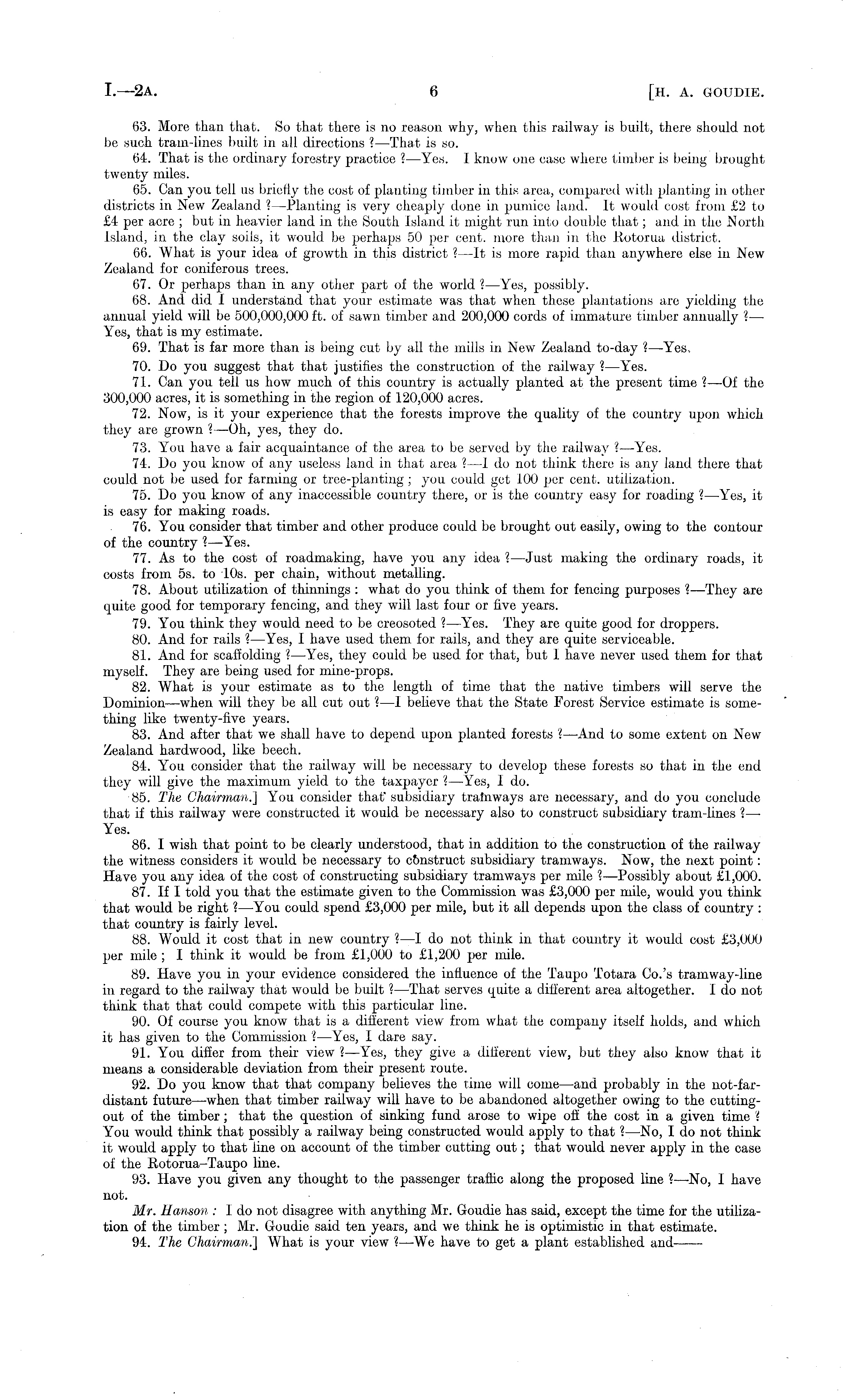63. More than. that. So that there is no reason why, when this railway is built, there should not be such tram-lines built in all directions ? —That is so. 64. That is the ordinary forestry practice ? —Yes. I know one case where timber is being brought twenty miles. 65. Can you tell us briefly the cost of planting timber in this area, compared with planting in other districts in New Zealand ?—Planting is very cheaply done in pumice land. It would cost from £2 to £4 per acre ; but in heavier land in the South Island it might run into double that; and in the North Island, in the clay soils, it would be perhaps 50 per cent, more than in the Rotorua district. 66. What is your idea of growth in this district ?—lt is more rapid than anywhere else in New Zealand for coniferous trees. 67. Or perhaps than in any other part of the world ?—Yes, possibly. 68. And did I understand that your estimate was that when these plantations are yielding the annual yield will be 500,000,000 ft. of sawn timber and 200,000 cords of immature timber annually ?■— Yes, that is my estimate. 69. That is far more than is being cut by all the mills in New Zealand to-day ?—Yes, 70. Do you suggest that that justifies the construction of the railway ?—Yes. 71. Can you tell us how much of this country is actually planted at the present time ?—Of the 300,000 acres, it is something in the region of 120,000 acres. 72. Now, is it your experience that the forests improve the quality of the country upon which they are grown ? —Oh, yes, they do. 73. You have a fair acquaintance of the area to be served by the railway ? —Yes. 74. Do you know of any useless land in that area ? —I do not think there is any land there that could not be used for farming or tree-planting ; you could get 100 per cent, utilization. 75. Do you know of any inaccessible country there, or is the country easy for roading ?—Yes, it is easy for making roads. 76. You consider that timber and other produce could be brought out easily, owing to the contour of the country ? —Yes. 77. As to the cost of roadmaking, have you any idea ? —Just making the ordinary roads, it costs from ss. to 10s. per chain, without metalling. 78. About utilization of thinnings : what do you think of them for fencing purposes ? —They are quite good for temporary fencing, and they will last four or five years. 79. You think they would need to be creosoted I —Yes. They are quite good for droppers. 80. And for rails ? —Yes, I have used them for rails, and they are quite serviceable. 81. And for scaffolding ?—Yes, they could be used for that, but I have never used them for that myself. They are being used for mine-props. 82. What is your estimate as to the length of time that the native timbers will serve the Dominion —when will they be all cut out ?—I believe that the State Forest Service estimate is something like twenty-five years. 83. And after that we shall have to depend upon planted forests ?—And to some extent on New Zealand hardwood, like beech. 84. You consider that the railway will be necessary to develop these forests so that in the end they will give the maximum yield to the taxpayer ?—Yes, I do. 85. The Chairman.] You consider that' subsidiary trafnways are necessary, and do you conclude that if this railway were constructed it would be necessary also to construct subsidiary tram-lines ? —- Yes. 86. I wish that point to be clearly understood, that in addition to the construction of the railway the witness considers it would be necessary to construct subsidiary tramways. Now, the next point: Have you any idea of the cost of constructing subsidiary tramways per mile ?—Possibly about £1,000. 87. If I told you that the estimate given to the Commission was £3,000 per mile, would you think that would be right ?—You could spend £3,000 per mile, but it all depends upon the class of country : that country is fairly level. 88. Would it cost that in new country ? —I do not think in that country it would cost £3,000 per mile ; I think it would be from £1,000 to £1,200 per mile. 89. Have you in your evidence considered the influence of the Taupo Totara Co.'s tramway-line in regard to the railway that would be built ?—That serves quite a different area altogether. Ido not think that that could compete with this particular line. 90. Of course you know that is a different view from what the company itself holds, and which it has given to the Commission ?—Yes, I dare say. 91. You differ from their view ?—Yes, they give a different view, but they also know that it means a considerable deviation from their present route. 92. Do you know that that company believes the time will come —and probably in the not-far-distant future —when that timber railway will have to be abandoned altogether owing to the cuttingout of the timber; that the question of sinking fund arose to wipe off the cost in a given time ? You would think that possibly a railway being constructed would apply to that ?—No, I do not think it would apply to that line on account of the timber cutting out; that would never apply in the case of the Rotorua-Taupo line. 93. Have you given any thought to the passenger traffic along the proposed line ?—No, I have not. Mr. Hanson : I do not disagree with anything Mr. Groudie has said, except the time for the utilization of the timber; Mr. Goudie said ten years, and we think he is optimistic in that estimate. 94. The Chairman.] What is your view ? —We have to get a plant established and