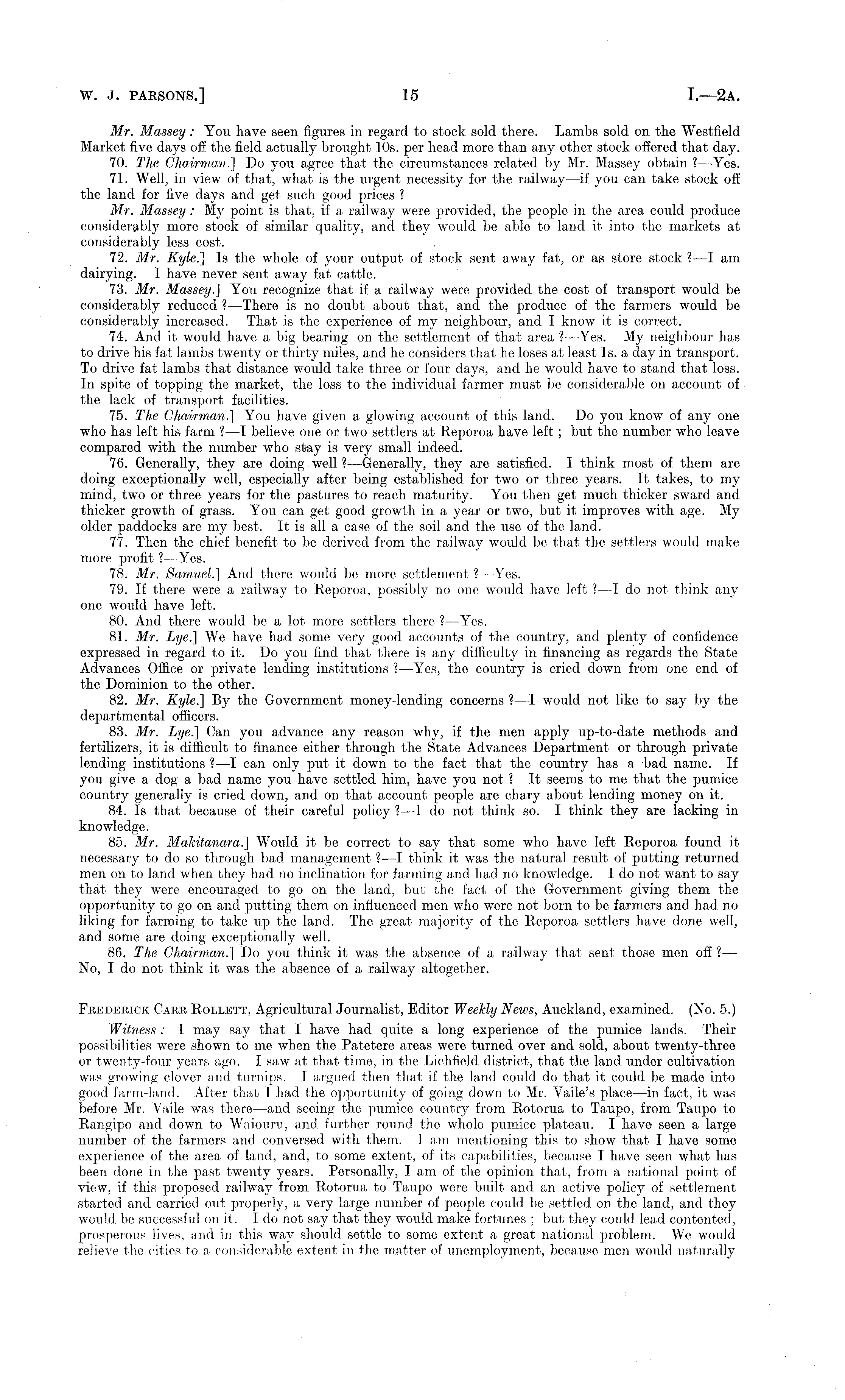 Mr. Massey : You have seen figures in regard to stock sold there. Lambs sold on the Westfield Market five days off the field actually brought 10s. per head more than any other stock offered that day. 70. The Chairman.] Do you agree that the circumstances related by Mr. Massey obtain ?—Yes. 71. Well, in view of that, what is the urgent necessity for the railway—if you can take stock off the land for five, days and get such good prices ? Mr. Massey : My point is that, if a railway were provided, the people in the area could produce considerably more stock of similar quality, and they would be able to land it into the markets at considerably less cost. 72. Mr. Kyle.] Is the whole of your output of stock sent away fat, or as store stock ?■—l am dairying. I have never sent away fat cattle. 73. Mr. Massey.] You recognize that if a railway were provided the cost of transport would be considerably reduced ? —There is no doubt about that, and the produce of the farmers would be considerably increased. That is the experience of my neighbour, and I know it is correct. 74. And it would have a big bearing on the settlement of that area ? —Yes. My neighbour has to drive his fat lambs twenty or thirty miles, and he considers that he loses at least Is. a day in transport. To drive fat lambs that distance would take three or four days, and he would have to stand that loss. In spite of topping the market, the loss to the individual farmer must be considerable oil account of the lack of transport facilities. 75. The Chairman.] You have given a glowing account of this land. Do you know of any one who has left his farm ? —I believe one or two settlers at Reporoa have left; but the number who leave compared with the number who stay is very small indeed. 76. Generally, they are doing well ? —Generally, they are satisfied. I think most of tliem are doing exceptionally well, especially after being established for two or three years. It takes, to my mind, two or three years for the pastures to reach maturity. You then get much thicker sward and thicker growth of grass. You can get good growth in a year or two, but it improves with age. My older paddocks are my best. It is all a case of the soil and the use of the land. 77. Then the chief benefit to be derived from the railway would be that the settlers would make more profit ?—Yes. 78. Mr. Samuel.] And there would be more settlement ? —Yes. 79. If there were a railway to Reporoa, possibly no one would have left ? —I do not think any one would have left. 80. And there would be a lot more settlers there ?—Yes. 81. Mr. Lye.] We have had some very good accounts of the country, and plenty of confidence expressed in regard to it. Do you find that there is any difficulty in financing as regards the State Advances Office or private lending institutions ? —Yes, the country is cried down from one end of the Dominion to the other. 82. Mr. Kyle.] By the Government money-lending concerns ?—I would not like to say by the departmental officers. 83. Mr. Lye.] Can you advance any reason why, if the men apply up-to-date methods and fertilizers, it is difficult to finance either through the State Advances Department or through private lending institutions ? —I can only put it down to the fact that the country has a bad name. If you give a dog a bad name you have settled him, have you not ? It seems to me that the pumice country generally is cried down, and on that account people are chary about lending money on it. 84. Is that because of their careful policy ? —I do not think so. I think they are lacking in knowledge. 85. Mr. Makitanara.] Would it be correct to say that some who have left Reporoa found it necessary to do so through bad management ? —I think it was the natural result of putting returned men on to land when they had no inclination for farming and had no knowledge. Ido not want to say that they were encouraged to go on the land, but the fact of the Government giving them the opportunity to go on and putting them on influenced men who were not born to be farmers and had no liking for farming to take up the land. The great majority of the Reporoa settlers have done well, and some are doing exceptionally well. 86. The Chairman.] Do you think it was the absence of a railway that sent those men off ? — No, I do not think it was the absence of a railway altogether. Frederick Carr Rollett, Agricultural Journalist, Editor Weekly News, Auckland, examined. (No. 5.) Witness : I may say that I have had quite a long experience of the pumice lands. Their possibilities were shown to me when the Patetere areas were turned over and sold, about twenty-three or twenty-four years ago. I saw at that time, in the Lichfield district, that the land under cultivation was growing clover and turnips. I argued then that if the land could do that it could be made into good farm-land. After that I had the opportunity of going down to Mr. Vaile's place —in fact, it was before Mr. Vaile was there—and seeing the pumice country from Rotorua to Taupo, from Taupo to Rangipo and down to Waiouru, and further round the whole pumice plateau. I have seen a large number of the farmers and conversed with them. I am mentioning this to show that I have some experience of the area of land, and, to some extent, of its capabilities, because I have seen what has been done in the past twenty years. Personally, lam of the opinion that, from a national point of view, if this proposed railway from Rotorua to Taupo were built and an active policy of settlement started and carried out properly, a very large number of people could be settled on the land, and they would be successful on it. Ido not say that they would make fortunes ; but they could lead contented, prosperous lives, and in this way should settle to some extent a great national problem. We would relieve the cities to a considerable extent in the matter of unemployment, because men would naturally