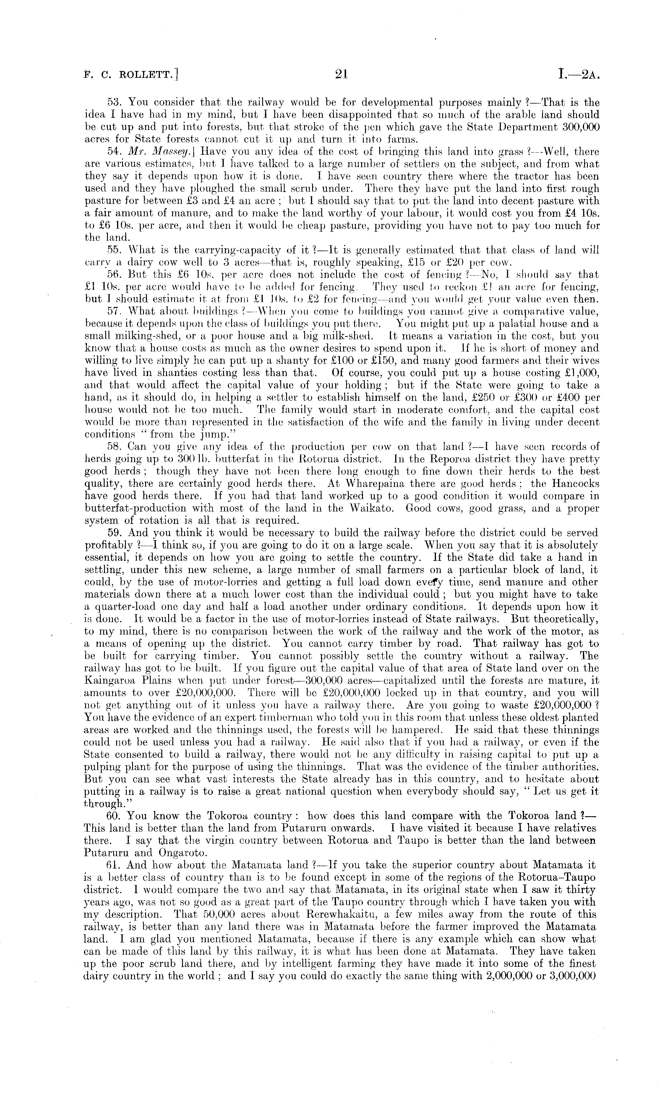 53. You consider that the railway would be for developmental purposes mainly ?—That is the idea I have had in my mind, but I have been disappointed that so much of the arable land should be cut up and put into forests, but that stroke of the pen which gave the State Department 300,000 acres for State forests cannot cut it up and turn it into farms. 54. Mr. Massey.] Have you any idea of the cost of bringing this land into grass ?—Well, there are various estimates, but I have talked to a large number of settlers on the subject, and from what they say it depends upon how it is done. I have seen country there where the tractor has been used and they have ploughed the small scrub under. There they have put the land into first rough pasture for between £3 and £4 an acre ; but I should say that to put the land into decent pasture with a fair amount of manure, and to make the land worthy of your labour, it would cost you from £4 10s. to £6 10s. per acre, and then it would be cheap pasture, providing you have not to pay too much for the land. 55. What is the carrying-capacity of it ? —lt is generally estimated that that class of land will carry a dairy cow well to 3 acres —that is, roughly speaking, £15 or £20 per cow. 56. But this £6 10s. per acre does not include the cost of fencing ? —No, I should say that £1 10s. per acre would have to be added for fencing. They used to reckon £1 an acre for fencing, but I should estimate it at from £1 10s. to £2 for fencing —and you would get your value even then. 57. What about buildings ? —When you come to buildings you cannot give a comparative value, because it depends upon the class of buildings you put there. You might put up a palatial house and a small milking-shed, or a poor house and a big milk-shed. It means a variation in the cost, but you know that a house costs as much as the owner desires to spend upon it. If he is short of money and willing to live simply he can put up a shanty for £100 or £150, and many good farmers and their wives have lived in shanties costing less than that. Of course, you could put up a house costing £1,000, and that would affect the capital value of your holding ; but if the State were going to take a hand, as it should do, in helping a settler to establish himself on the land, £250 or £300 or £400 per house would not be too much. The family would start in moderate comfort, and the capital cost would be more than represented in the satisfaction of the wife and the family in living under decent conditions " from the jump." 58. Can you give any idea of the production per cow on that land ?—I have seen records of herds going up to 300 lb. butterfat in the Rotorua district. In the Reporoa district they have pretty good herds ; though they have not been there long enough to fine down their herds to the best quality, there are certainly good herds there. At Wharepaina there are good herds ; the Hancocks have good herds there. If you had that land worked up to a good condition it would compare in butterfat-production with most of the land in the Waikato. Good cows, good grass, and a proper system of rotation is all that is required. 59. And you think it would be necessary to build the railway before the district could be served profitably ?—I think so, if you are going to do it on a large scale. When you say that it is absolutely essential, it depends on how you are going to settle the country. If the State did take a hand in settling, under this new scheme, a large number of small farmers on a particular block of land, it could, by the use of motor-lorries and getting a full load down evefy time, send manure and other materials down there at a much lower cost than the individual could ; but you might have to take a quarter-load one day and half a load another under ordinary conditions. It depends upon how it is done. It would be a factor in the use of motor-lorries instead of State railways. But theoretically, to my mind, there is no comparison between the work of the railway and the work of the motor, as a means of opening up the district. You cannot carry timber by road. That railway has got to be built for carrying timber. You cannot possibly settle the country without a railway. The railway has got to be built. If you figure out the capital value of that area of State land over on the Kaingaroa Plains when put under forest—3oo,ooo acres—capitalized until the forests are mature, it amounts to over £20,000,000. There will be £20,000,000 locked up in that country, and you will not get anything out of it unless you have a railway there. Are you going to waste £20,000,000 ? You have the evidence of an expert timberman who told you in this room that unless these oldest planted areas are worked and the thinnings used, the forests will be hampered. He said that these thinnings could not be used unless you had a railway. He said also that if you had a railway, or even if the State consented to build a railway, there would not be any difficulty in raising capital to put up a pulping plant for the purpose of using the thinnings. That was the evidence of the timber authorities. But you can see what vast interests the State already has in this country, and to hesitate about putting in a railway is to raise a great national question when everybody should say, " Let us get it through." 60. You know the Tokoroa country : how does this land compare with the Tokoroa land ?— This land is better than the land from Putaruru onwards. I have visited it because I have relatives there. I say that the virgin country between Rotorua and Taupo is better than the land between Putaruru and Ongaroto. 61. And how about the Matamata land ? —lf you take the superior country about Matamata it is a better class of country than is to be found except in some of the regions of the Rotorua-Taupo district. I would compare the two and say that Matamata, in its original state when 1 saw it thirty years ago, was not so 