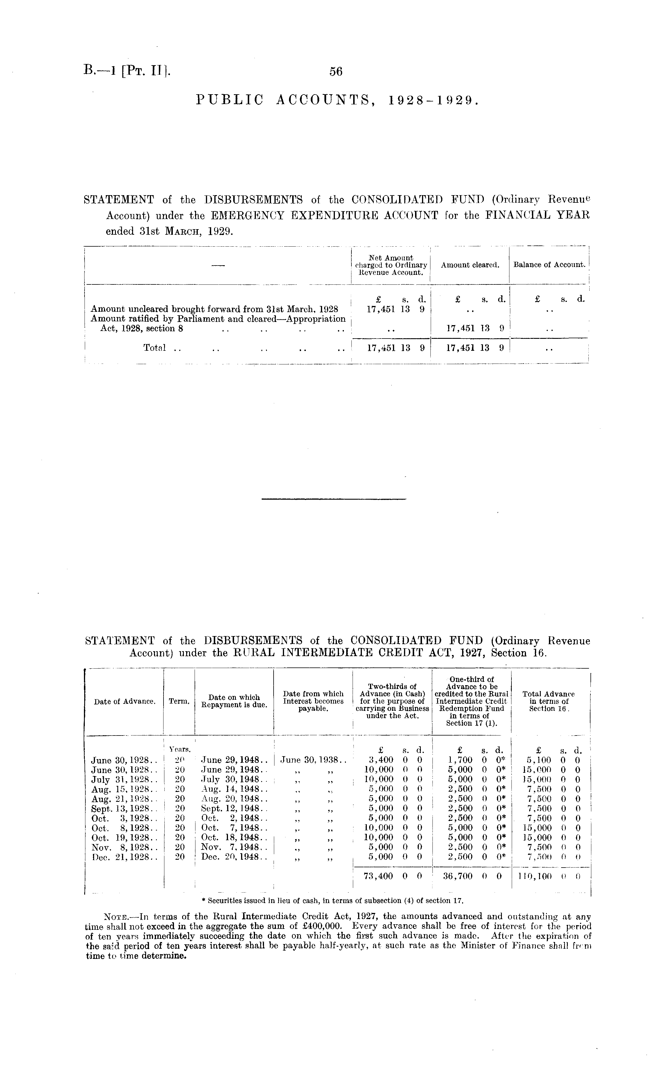 One-third of Two-thirds of Advance to be Date on which Date from which ; Advance (in Cash) credited to the Rural Total Advance Date of Advance. Term. •R 0 „ 0 , rT nor*f \ a Hue Interest becomes I for the purpose of Intermediate Credit in terms of Jiepaymenti is uue. payable. carrying on Business Redemption Fund Section 16 . under the Act. in terms of Section 17 (1). Years. £ s. d. £ s. d. £ s. d. June 30,1928. . 20 June 29,1948.. June 30.1938.. 3.400 0 0 , 1,700 0 0* 5,100 0 0 June 30,1928.. 20 June 29,1948. . „ „ 10,000 0 0 1 5,000 0 0* 15.000 0 0 July 31,1928. . 20 July 30,1948. . „ „ 10,000 0 0 , 5,000 0 0* 15,000 0 0 Aug. 15,1928. . 20 Aug. 14, 1948. . ,, 5,000 0 0 2,500 0 0* 7.500 0 0 Aug. 21,1928. - 20 Aug. 20,1948.. „ „ 5,000 0 0 i 2,500 0 0* 7,500 0 0 Sept,. 13,1928. - 20 Sept. 12, 1948. . „ „ 5,000 0 0 2,500 0 0* 7,500 0 0 Oct. 3,1928.. 20 Oct. 2,1948.. „ „ 5,000 0 0 2,500 0 0* 7,500 0 0 Oct, 8,1928.. 20 Oct. 7,1948.. ,. „ 10,000 0 0 5,000 0 0* 15,000 0 0 I Oct. 19,1928.. 20 Oct. 18,1948.. „ ,, 10,000 0 0 5,000 0 0* 15,000 0 0 Nov. 8,1928.. 20 Nov. 7,1948.. ., „ 5,000 0 0 2,500 0 0* 7.500 0 0 j Dec. 21,1928.. 20 I Dec. 20,1948. . „ „ 5,000 0 0 2,500 0 0* 7,500 0 0 73,400 0 0 36,700 0 0 110,100 0 0 * Securities issued in lieu of cash, iu terms of subsection (4) of section 17. Note. —In terms of the Rural Intermediate Credit Act, 1927, the amounts advanced and outstanding at any time shall not exceed in the aggregate the sum of £400,000. Every advance shall be free of interest for the period of ten years immediately succeeding the date on which the first such advance is made. After the expiration of the said period of ten years interest, shall be payable half-yearly, at such rate as the Minister of Finance shall firm time to time determine.
