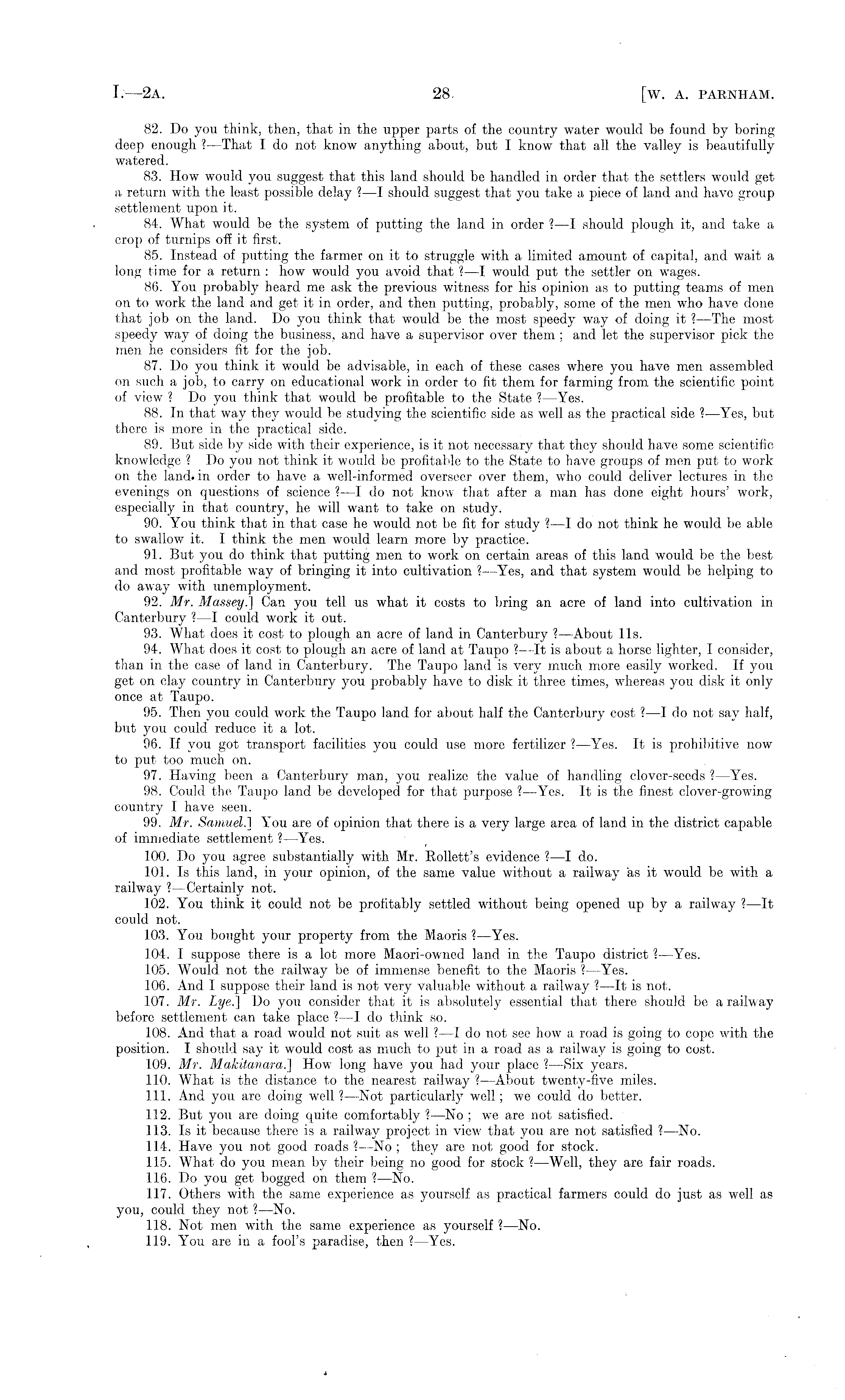 82. Do you think, then, that in the upper parts of the country water would be found by boring deep enough ?—That I do not know anything about, but I know that all the valley is beautifully watered. 83. How would you suggest that this land should be handled in order that the settlers would get a return with the least possible delay ? —I should suggest that you take a piece of land and have group settlement upon it. 84. What would be the system of putting the land in order ? —I should plough it, and take a crop of turnips off it first. 85. Instead of putting the farmer on it to struggle with a limited amount of capital, and wait a long time for a return : how would you avoid that ?—I would put the settler on wages. 86. You probably heard me ask the previous witness for his opinion as to putting teams of men on to work the land and get it in order, and then putting, probably, some of the men who have done that job on the land. Do you think that would be the most speedy way of doing it ?—The most speedy way of doing the business, and have a supervisor over them ; and let the supervisor pick the men he considers fit for the job. 87. Do you think it would be advisable, in each of these cases where you have men assembled on such a job, to carry on educational work in order to fit them for farming from the scientific point of view ? Do you think that would be profitable to the State ?—Yes. 88. In that way they would be studying the scientific side as well as the practical side ?• —Yes, but there is more in the practical side. 89. But side by side with their experience, is it not necessary that they should have some scientific knowledge ? Do you not think it would be profitable to the State to have groups of men put to work on the land, in order to have a well-informed overseer over them, who could deliver lectures in the evenings on questions of science ?—1 do not know that after a man has done eight hours' work, especially in that country, he will want to take on study. 90. You think that in that case he would not be fit for study ?—I do not think he would be able to swallow it. I think the men would learn more by practice. 91. But you do think that putting men to work on certain areas of this land would be the best and most profitable way of bringing it into cultivation ?—Yes, and that system would be helping to do away with unemployment. 92. Mr. Massey.] Can you tell us what it costs to bring an acre of land into cultivation in Canterbury ?—I could work it out. 93. What does it cost to plough an acre of land in Canterbury I—About lis. 94. What does it cost to plough an acre of land at Taupo I—lt is about a horse lighter, I consider, than in the case of land in Canterbury. The Taupo land is very much more easily worked. If you get on clay country in Canterbury you probably have to disk it three times, whereas you disk it only once at Taupo. 95. Then you could work the Taupo land for about half the Canterbury cost ? —I do not say half, but you could reduce it a lot. 96. If you got transport facilities you could use more fertilizer ? —Yes. It is prohibitive now to put too much on. 97. Having been a Canterbury man, you realize the value of handling clover-seeds I—Yes. 98. Could the Taupo land be developed for that purpose ? —Yes. It is the finest clover-growing country I have seen. 99. Mr. Samuel.] You are of ojfinion that there is a very large area of land in the district capable of immediate settlement ? —Yes. 100. Do you agree substantially with Mr. Eollett's evidence ? —I do. 101. Is this land, in your opinion, of the same value without a railway as it would be with a railway ?—Certainly not. 102. You think it could not be profitably settled without being opened up by a railway ?—lt could not. 103. You bought your property from the Maoris ? —Yes. 104. I suppose there is a lot more Maori-owned land in the Taupo district ?—Yes. 105. Would, not the railway be of immense benefit to the Maoris ?—Yes. 106. And I suppose their land is not very valuable without a railway ?—lt is not. 107. Mr. Lye.] Do you consider that it is absolutely essential that there should be a railway before settlement can take place ? —I do think so. 108. And that a road would not suit as well ? —I do not see how a road is going to cope with the position. I should say it would cost as much to put in a road as a railway is going to cost. 109. Mr. Makitanara.\ How long have you had your place ?—Six years. 110. What is the distance to the nearest railway ? —About twenty-five miles. 111. And you are doing well ? —Not particularly well; we could do better. 112. But you are doing quite comfortably ? —No ; we are not satisfied. 113. Is it because there is a railway project in view that you are not satisfied ? —No. 114. Have you not good roads ? —No ; they are not good for stock. 115. What do you mean by their being no good for stock ?—Well, they are fair roads. 116. Do you get bogged on them ?—No. 117. Others with the same experience as yourself as practical farmers could do just as well as you, could they not ? —No. 118. Not men with the same experience as yourself ? —No. 119. You are in a fool's paradise, then ? —Yes.