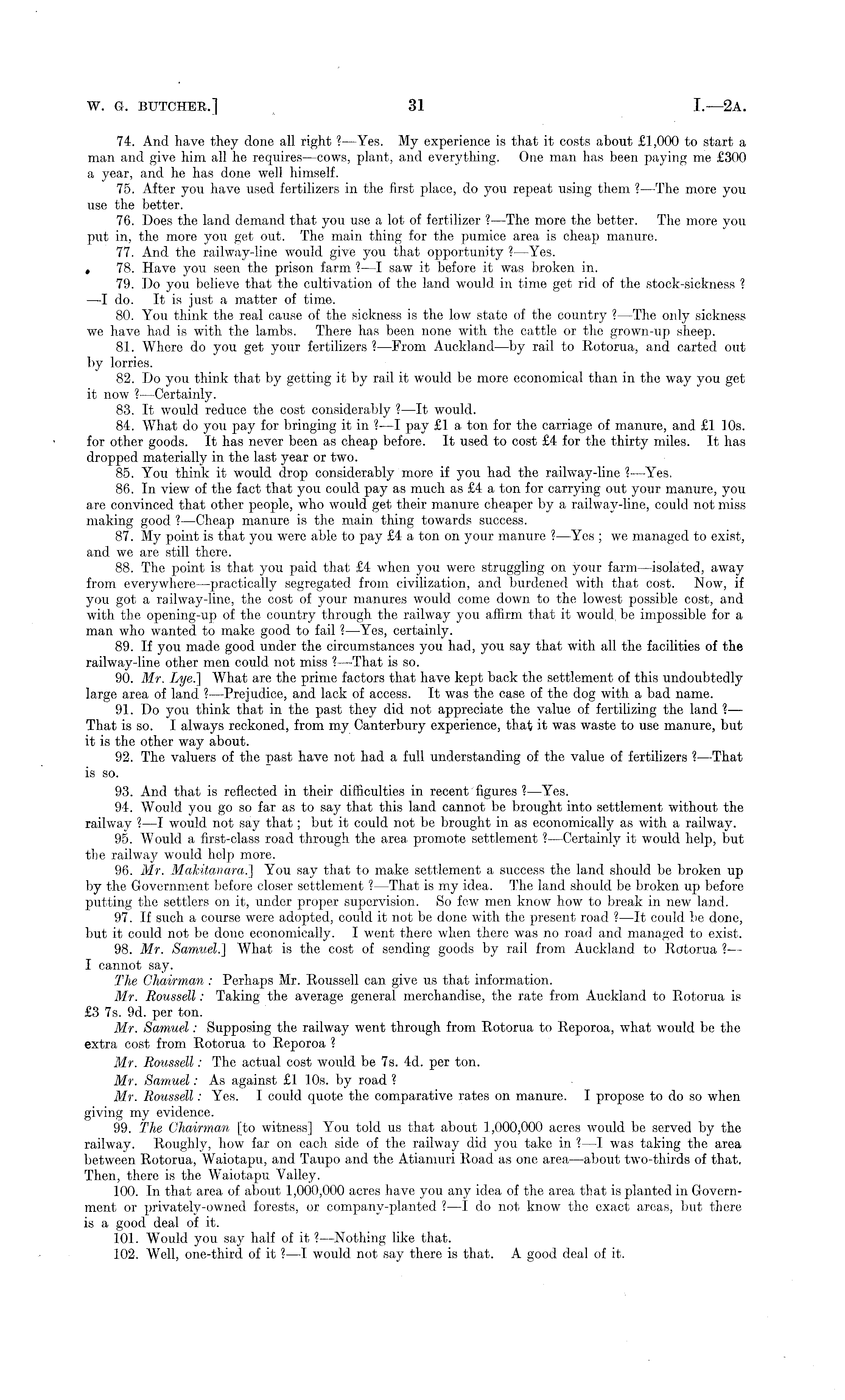 74. And have they clone all right ?—Yes. My experience is that it costs about £1,000 to start a man and give him all he requires—cows, plant, and everything. One man has been paying me £300 a year, and he has done well himself. 75. After you have used fertilizers in the first place, do you repeat using them ? —The more you use the better. 76. Does the land demand that you use a lot of fertilizer ?—The more the better. The more you put in, the more you get out. The main thing for the pumice area is cheap manure. 77. And the railway-line would give you that opportunity ? —Yes. , 78. Have you seen the prison farm ? —I saw it before it was broken in. 79. Do you believe that the cultivation of the land would in time get rid of the stock-sickness ? —I do. It is just a matter of time. 80. You think the real cause of the sickness is the low state of the country ? —The only sickness we have had is with the lambs. There has been none with the cattle or the grown-up sheep. 81. Where do you get your fertilizers ?—From Auckland —by rail to Rotorua, and carted out by lorries. 82. Do you think that by getting it by rail it would be more economical than in the way you get it now ? —Certainly. 83. It would reduce the cost considerably ? —lt would. 84. What do you pay for bringing it in ? —I pay £1 a ton for the carriage of manure, and £1 10s. for other goods. It has never been as cheap before. It used to cost £4 for the thirty miles. It has dropped materially in the last year or two. 85. You think it would drop considerably more if you had the railway-line ?—Yes. 86. In view of the fact that you could pay as much as £4 a ton for carrying out your manure, you are convinced that other people, who would get their manure cheaper by a railway-line, could not miss making good ? —Cheap manure is the main thing towards success. 87. My point is that you were able to pay £4 a ton on your manure ?—Yes ; we managed to exist, and we are still there. 88. The point is that you paid that £4 when you were struggling on your farm—isolated, away from everywhere—practically segregated from civilization, and burdened with that cost. Now, if you got a railway-line, the cost of your manures would come down to the lowest possible cost, and with the opening-up of the country through the railway you affirm that it would, be impossible for a man who wanted to make good to fail ? —Yes, certainly. 89. If yoii made good under the circumstances you had, you say that with all the facilities of the railway-line other men could not miss ?—That is so. 90. Mr. Lye.] What are the prime factors that have kept back the settlement of this undoubtedly large area of land ?—Prejudice, and lack of access. It was the case of the dog with a bad name. 91. Do you think that in the past they did not appreciate the value of fertilizing the land ? — That is so. I always reckoned, from my Canterbury experience, that it was waste to use manure, but it is the other way about. 92. The valuers of the past have not had a full understanding of the value of fertilizers ?—That is so. 93. And that is reflected in their difficulties in recent figures ?—Yes. 94. Would you go so far as to say that this land cannot be brought into settlement without the railway ?—I would not say that; but it could not be brought in as economically as with a railway. 95. Would a first-class road through the area promote settlement '?—Certainly it would help, but the railwa)'' would help more. 96. Mr. Makitanara.\ You say that to make settlement a success the land should be broken up by the Government before closer settlement ?—That is my idea. The land should be broken up before putting the settlers on it, under proper supervision. So few men know how to break in new land. 97. If such a course were adopted, could it not be done with the present road ? —lt could be done, but it could not be done economically. I went there when there was no road and managed to exist. 98. Mr. Samuel.] What is the cost of sending goods by rail from Auckland to Rotorua ? — I cannot say. The Chairman : Perhaps Mr. Roussell can give us that information. Mr. Roussell: Taking the average general merchandise, the rate from Auckland to Rotorua is £3 7s. 9d. per ton. Mr. Samuel: Supposing the railway went through from Rotorua to Reporoa, what would be the extra cost from Rotorua to Reporoa ? Mr. Roussell: The actual cost would be 7s. 4d. per ton. Mr. Samuel: As against £1 10s. by road? Mr. Roussell: Yes. I could quote the comparative rates on manure. I propose to do so when giving my evidence. 99. The Chairman [to witness] You told us that about 1,000,000 acres would be served by the railway. Roughly, how far on each side of the railway did you take in ?—I was taking the area between Rotorua, Waiotapu, and Taupo and the Atiamuri Road as one area —about two-thirds of that. Then, there is the Waiotapu Valley. 100. In that area of about 1,000,000 acres have you any idea of the area that is planted in Government or privately-owned forests, or company-planted ? —I do not know the exact areas, but there is a good deal of it. 101. Would you say half of it ? —Nothing like that. 102. Well, one-third of it ? —I would not say there is that. A good deal of it.