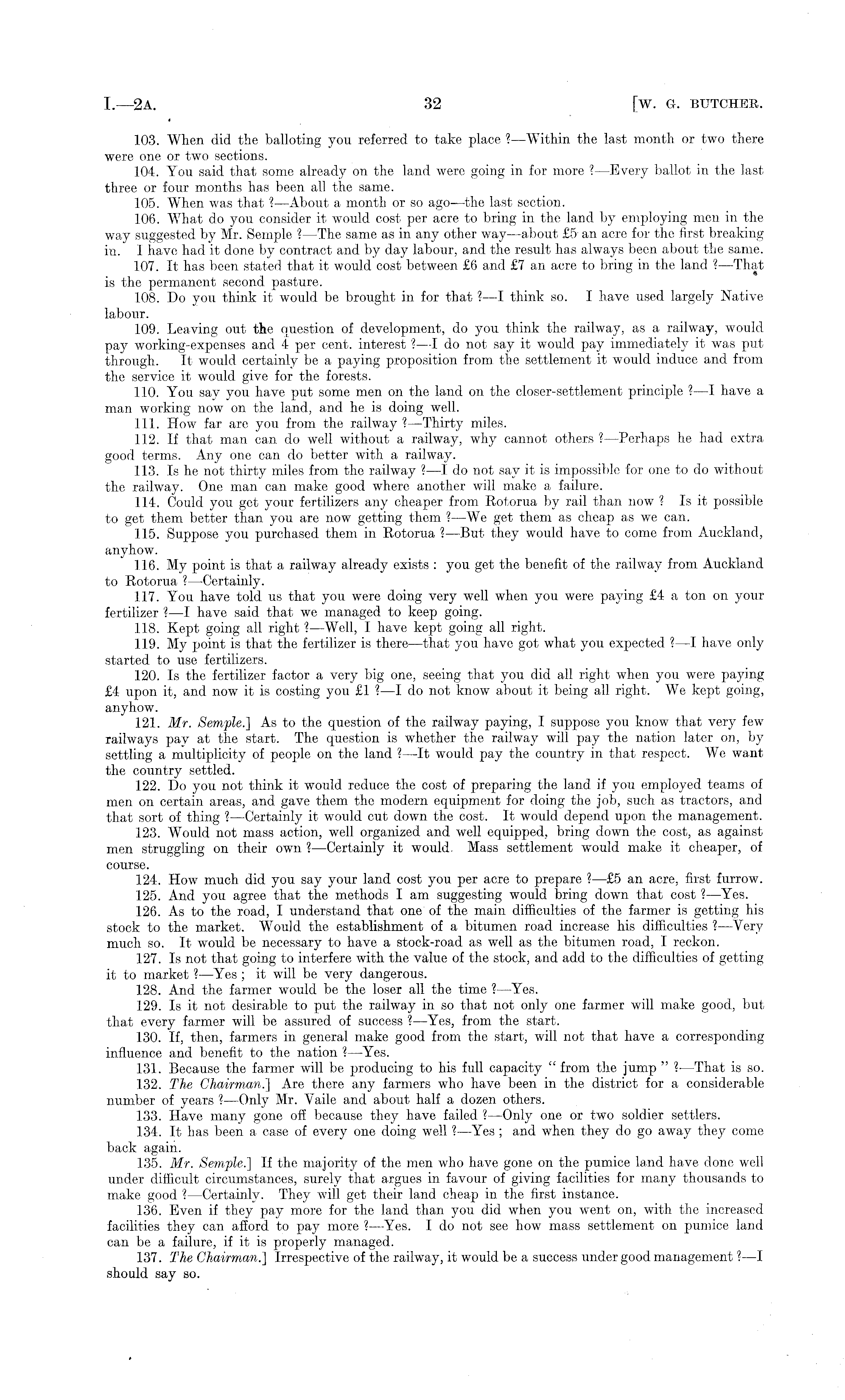 103. When did the balloting you referred to take place I—Within1 —Within the last month or two there were one or two sections. 104. You said that some already on the land were going in for more ? —Every ballot in the last three or four months has been all the same. 105. When was that ?—About a month or so ago—the last section. 106. What do you consider it would cost per acre to bring in the land by employing men in the way suggested by Mr. Semple ? —The same as in any other way —about £5- an acre for the first breaking in. I have had it done by contract and by day labour, and the result has always been about the same. 107. It has been stated that it would cost between £6 and £7 an acre to bring in the land ?—That is the permanent second pasture. 108. Do you think it would be brought in for that ?—I think so. I have used largely Native labour. 109. Leaving out the question of development, do you think the railway, as a railway, would pay working-expenses and 4 per cent, interest ? —I do not say it would pay immediately it was put through. It would certainly be a paying proposition from the settlement it would induce and from the service it would give for the forests. 110. You say you have put some men on the land on the closer-settlement principle ?—I have a man working now on the land, and he is doing well. 111. How far are you from the railway ?—Thirty miles. 112. If that man can do well without a railway, why cannot others ? —Perhaps he had extra good terms. Any one can do better with a railway. 113. Is he not thirty miles from the railway ? —I do not say it is impossible for one to do without the railway. One man can make good where another will make a failure. 114. Could you get your fertilizers any cheaper from Rotorua by rail than now ? Is it possible to get them better than you are now getting them ?—We get them as cheap as we can. 115. Suppose you purchased them in Rotorua ? —But they would have to come from Auckland, anyhow. 116. My point is that a railway already exists : you get the benefit of the railway from Auckland to Rotorua ? —Certainly. 117. You have told us that you were doing very well when you were paying £4 a ton on your fertilizer ?—I have said that we managed to keep going. 118. Kept going all right ?—Well, I have kept going all right. 119. My point is that the fertilizer is there —that you have got what you expected ? —I have only started to use fertilizers. 120. Is the fertilizer factor a very big one, seeing that you did all right when you were paying £4 upon it, and now it is costing you £1 ? —I do not know about it being all right. We kept going, anyhow. 121. Mr. Semple.] As to the question of the railway paying, I suppose you know that very few railways pay at the start. The question is whether the railway will pay the nation later on, by settling a multiplicity of people on the land ?—lt would pay the country in that respect. We want the country settled. 122. Do you not think it would reduce the cost of preparing the land if you employed teams of men on certain areas, and gave them the modern equipment for doing the job, such as tractors, and that sort of thing ? —Certainly it would cut down the cost. It would depend upon the management. 123. Would not mass action, well organized and well equipped, bring down the cost, as against men struggling on their own ? —Certainly it would. Mass settlement would make it cheaper, of course. 124. How much did you say your land cost you per acre to prepare ? —£s an acre, first furrow. 125. And you agree that the methods I am suggesting would bring down that cost ?—Yes. 126. As to the road, I understand that one of the main difficulties of the farmer is getting his stock to the market. Would the establishment of a bitumen road increase his difficulties ?—Very much so. It would be necessary to have a stock-road as well as the bitumen road, I reckon. 127. Is not that going to interfere with the value of the stock, and add to the difficulties of getting it to market ? —Yes ; it will be very dangerous. 128. And the farmer would be the loser all the time ? —Yes. 129. Is it not desirable to put the railway in so that not only one farmer will make good, but that every farmer will be assured of success ? —Yes, from the start. 130. If, then, farmers in general make good from the start, will not that have a corresponding influence and benefit to the nation ?—Yes. 131. Because the farmer will be producing to his full capacity " from the jump " ? —That is so. 132. The Chairman.] Are there any farmers who have been in the district for a considerable number of years ? —Only Mr. Vaile and about half a dozen others. 133. Have many gone off because they have failed ?—Only one or two soldier settlers. 134. It has been a case of every one doing well ?—Yes ; and when they do go away they come back again. 135. Mr. Semple.] If the majority of the men who have gone on the pumice land have done well under difficult circumstances, surely that argues in favour of giving facilities for many thousands to make good ? —Certainly. They will get their land cheap in the first instance. 136. Even if they pay more for the land than you did when you went on, with the increased facilities they can afford to pay more ?—Yes. I do not see how mass settlement on pumice land can be a failure, if it is properly managed. 137. The Chairman.] Irrespective of the railway, it would be a success under good management ? —I should say so.