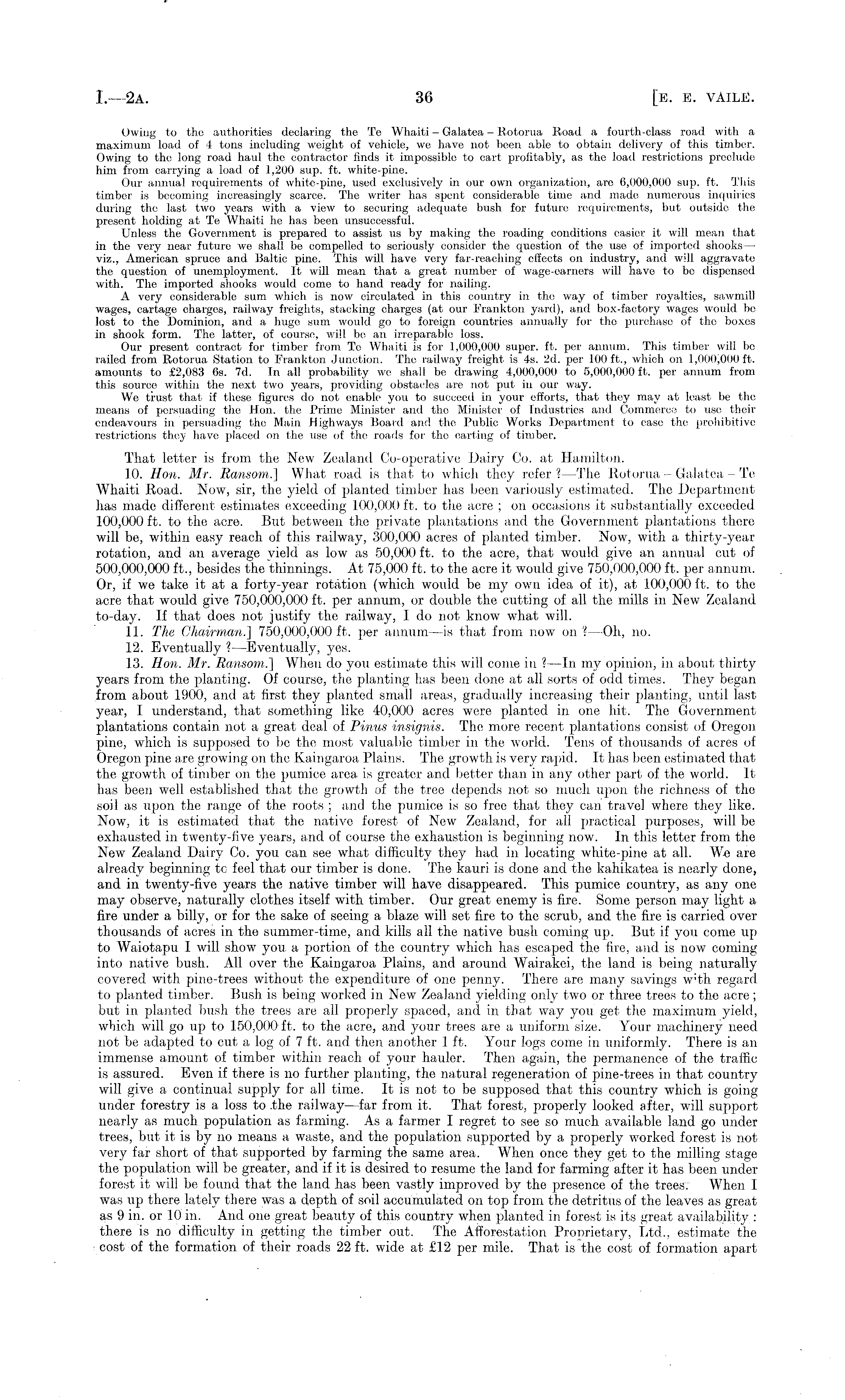 Owing to the authorities declaring the Te Whaiti - Galatea - Rotorua Road a fourth-class road with a maximum load of 4 tons including weight of vehicle, we have not been able to obtain delivery of this timber. Owing to the long road haul the contractor finds it impossible to cart profitably, as the load restrictions preclude him from carrying a load of 1,200 sup. ft. white-pine. Our annual requirements of white-pine, used exclusively in our own organization, are 6,000,000 sup. ft. This timber is becoming increasingly scarce. The writer has spent considerable time and made numerous inquiries during the last two years with a view to securing adequate bush for future requirements, but outside the present holding at Te Whaiti he has been unsuccessful. Unless the Government is prepared to assist us by making the roading conditions easier it will mean that in the very near future we shall be compelled to seriously consider the question of the use of imported shooks — viz., American spruce and Baltic pine. This will have very far-reaching effects on industry, and will aggravate the question of unemployment. It will mean that a great number of wage-earners will have to be dispensed with. The imported shooks would come to hand ready for nailing. A very considerable sum which is now circulated in this country in the way of timber royalties, sawmill wages, cartage charges, railway freights, stacking charges (at our Frankton yard), and box-factory wages would be lost to the Dominion, and a huge sum would go to foreign countries annually for the purchase of the boxes in shook form. The latter, of course, will be an irreparable loss. Our present contract for timber from Te Whaiti is for 1,000,000 super, ft. per annum. This timber will be railed from Rotorua Station to Frankton Junction. The railway freight is 4s. 2d. per 100 ft., which on 1,000,000 ft. amounts to £2,083 6s. 7d. In all probability we shall be drawing 4,000,000 to 5,000,000 ft. per annum from this source within the next two years, providing obstacles are not put in our way. We trust that if these figures do not enable you to succeed in your efforts, that they may at least be the means of persuading the Hon. the Prime Minister and the Minister of Industries and Commerce to use their endeavours in persuading the Main Highways Board and the Public Works Department to ease the prohibitive restrictions they have placed on the use of the roads for the carting of timber. That letter is from the New Zealand Co-operative Dairy Co. at Hamilton. 10. Hon. Mr. Ransom,.] What road is that to which they refer ? —The Rotorua - Galatea - Te. Whaiti Road. Now, sir, the yield of planted timber has been variously estimated. The Department has made different estimates exceeding 100,000 ft. to the acre ; on occasions it substantially exceeded 100,000 ft. to the acre. But between the private plantations and the Government plantations there will be, within easy reach of this railway, 300,000 acres of planted timber. Now, with a thirty-year rotation, and an average yield as low as 50,000 ft. to the acre, that would give an annual cut of 500,000,000 ft., besides the thinnings. At 75,000 ft. to the acre it would give 750,000,000 ft. per annum. Or, if we take it at a forty-year rotation (which would be my own idea of it), at 100,000 ft. to the acre that would give 750,000,000 ft. per annum, or double the cutting of all the mills in New Zealand to-day. If that does not justify the railway, Ido not know what will. 11. The Chairman.] 750,000,000 ft. per annum —is that from now on ?—Oh, no. 12. Eventually ? —Eventually, yes. 13. Hon. Mr. Ransom.] When do you estimate this will come in ?—ln my opinion, in about thirty years from the planting. Of course, the planting has been done at all sorts of odd times. They began from about 1900, and at first they planted small areas, gradually increasing their planting, until last year, I understand, that something like 40,000 acres were planted in one hit. The Government plantations contain not a great deal of Pinus insignis. The more recent plantations consist of Oregon pine, which is supposed to be the most valuable timber in the world. Tens of thousands of acres of Oregon pine are growing on the Kaingaroa Plains. The growth is very rapid. It has been estimated that the growth of timber on the pumice area is greater and better than in any other part of the world. It has been well established that the growth of the tree depends not so much upon the richness of the soil as upon the range of the roots ; and the pumice is so free that they can travel where they like. Now, it is estimated that the native forest of New Zealand, for all practical purposes, will be exhausted in twenty-five years, and of course the exhaustion is beginning now. In this letter from the New Zealand Dairy Co. you can see what difficulty they had in locating white-pine at all. We are already beginning to feel that our timber is done. The kauri is done and the kahikatea is nearly done, and in twenty-five years the native timber will have disappeared. This pumice country, as any one may observe, naturally clothes itself with timber. Our great enemy is fire. Some person may light a fire under a billy, or for the sake of seeing a blaze will set fire to the scrub, and the fire is carried over thousands of acres in the summer-time, and kills all the native bush coming up. But if you come up to Waiotapu I will show you a portion of the country which has escaped the fire, and is now coming into native bush. All over the Kaingaroa Plains, and around Wairakei, the land is being naturally covered with pine-trees without the expenditure of one penny. There are many savings with regard to planted timber. Bush is being worked in New Zealand yielding only two or three trees to the acre ; but in planted bush the trees are all properly spaced, and in that way you get the maximum yield, which will go up to 150,000-ft. to the acre, and your trees are a uniform siz