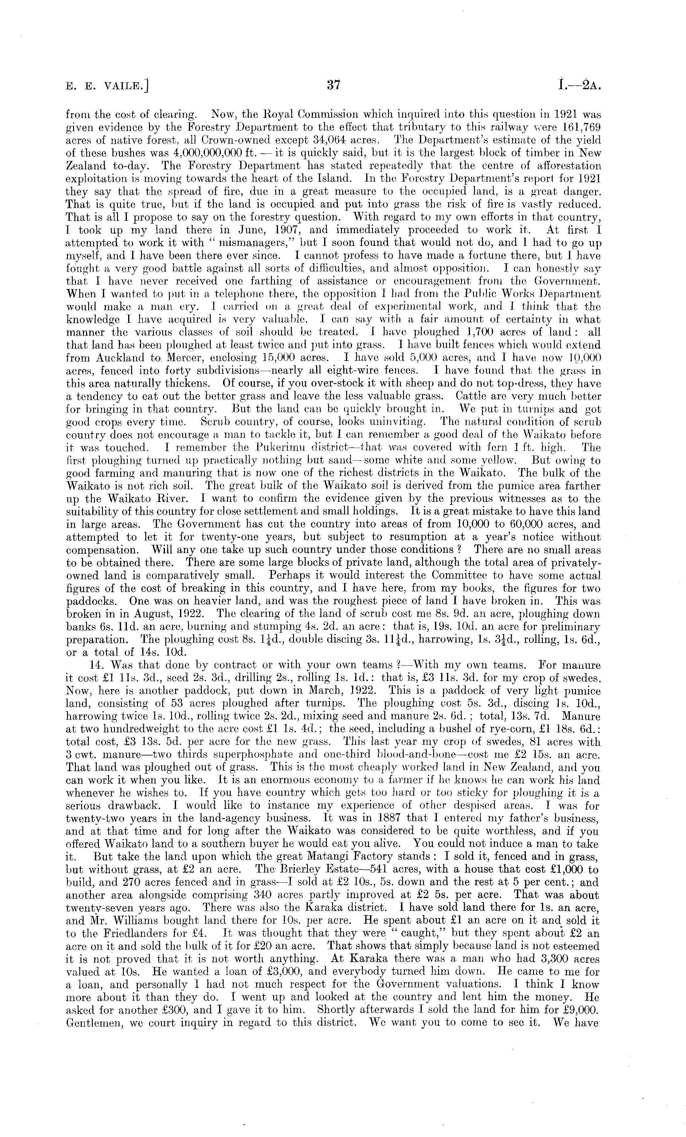 from the cost of clearing. Now, the lloyal Commission which inquired into this question in 1921 was given evidence by the Forestry Department to the effect that tributary to this railway were 161,769 acres of native forest, all Crown-owned except 34,064 acres. The Department's estimate of the yield of these bushes was 4,000,000,000 ft. — it is quickly said, but it is the largest block of timber in New Zealand to-day. The Forestry Department has stated repeatedly that the centre of afforestation exploitation is moving towards the heart of the Island. In the Forestry Department's report for 1921 they say that the spread of fire, due in a great measure to the occupied land, is a great danger. That is quite true, but if the land is occupied and put into grass the risk of fire is vastly reduced. That is all I propose to say on the forestry question. With regard to my own efforts in that country, I took up my land there in June, 1907, and immediately proceeded to work it. At first I attempted to work it with " mismanagers," but I soon found that would not do, and I had to go up myself, and 1 have been there ever since. I cannot profess to have made a fortune there, but 1 have fought a very good battle against all sorts of difficulties, and almost opposition. I can honestly say that I have never received one farthing of assistance or encouragement from the Government. When I wanted to put in a telephone there, the opposition I had from the Public Works Department would make a man cry. I carried on a great deal of experimental work, and 1 think that the knowledge I have acquired is very valuable. I can say with a fair amount of certainty in what manner the various classes of soil should be treated. I have ploughed 1,700 acres of land: all that land has been ploughed at least twice and put into grass. I have built fences which would extend from Auckland to Mercer, enclosing 15,000 acres. I have sold 5,000 acres, and I have now 10,000 acres, fenced into forty subdivisions —nearly all eight-wire fences. I have found that the grass in this area naturally thickens. Of course, if you over-stock it with sheep and do not top-dress, they have a tendency to eat out the better grass and leave the less valuable grass. Cattle are very much better for bringing in that country. But the land can be quickly brought in. We put in turnips and got good crops every time. Scrub country, of course, looks uninviting. The natural condition of scrub country does not encourage a man to tackle it, but I can remember a good deal of the Waikato before it was touched. I remember the Pukerimu district —that was covered with fern 1 ft. high. The first ploughing turned up practically nothing but sand —some white and some yellow. But owing to good farming and manuring that is now one of the richest districts in the Waikato. The bulk of the Waikato is not rich soil. The great bulk of the Waikato soil is derived from the pumice area farther up the Waikato River. I want to confirm the evidence given by the previous witnesses as to the suitability of this country for close settlement and small holdings. It is a great mistake to have this land in large areas. The Government has cut the country into areas of from 10,000 to 60,000 acres, and attempted to let it for twenty-one years, but subject to resumption at a year's notice without compensation. Will any one take up such country under those conditions ? There are no small areas to be obtained there. There are some large blocks of private land, although the total area of privatelyowned land is comparatively small. Perhaps it would interest the Committee to have some actual figures of the cost of breaking in this country, and I have here, from my books, the figures for two paddocks. One was on heavier land, and was the roughest piece of land I have broken in. This was broken in in August, 1922. The clearing of the land of scrub cost me Bs. 9d. an acre, ploughing down banks 6s. 11 d. an acre, burning and stumping 4s. 2d. an acre: that is, 19s. lOd. an acre for preliminary preparation. The ploughing cost Bs. l|d., double discing 3s. lljd., harrowing, Is. 3jd., rolling, Is. 6d., or a total of 14s. lOd. 14. Was that done by contract or with your own teams ? —With my own teams. For manure it cost £1 lis. 3d., seed 2s. 3d., drilling 25., rolling Is. Id.: that is, £3 1 Is. 3d. for my crop of swedes. Now, here is another paddock, put down in March, 1922. This is a paddock of very light pumice land, consisting of 53 acres ploughed after turnips. The ploughing cost ss. 3d., discing Is. 10d., harrowing twice Is. 10d., rolling twice 2s. 2d., mixing seed and manure 2s. 6d. ; total, 13s. 7d. Manure at two hundredweight to the acre cost £1 Is. 4d.; the seed, including a bushel of rye-corn, £1 18s. 6d.: total cost, £3 13s. sd. per acre for the new grass. This last year my crop of swedes, 81 acres with 3 cwt. manure —two thirds superphosphate and one-third blood-and-bone —cost me £2 15s. an acre. That land was ploughed out of grass. This is the most cheaply worked land in New Zealand, and you can work it when you like. It is an enormous economy to a farmer if he knows he can work his land whenever he wishes to. If you have country which gets too hard or too sticky for ploughing it is a serious drawback. 1 would like to instance my experience of other despised areas. I was for twenty-two years in the land-agency business. It was in 1887 that I entered my father's business, and at that time and for long after the Waikato was considered to be quite worthless, and if you offered Waikato land to a southern buyer he would eat you alive. You could not induce a man to take it. But take the land upon which the great Matangi Factory stands : I sold it, fenced and in grass, but without grass, at £2 an acre. The-Brierley Estate —541 acres, with a house that cost £1,000 to build, and 270 acres fenced and in grass—l sold at £2 10s., ss. down and the rest at 5 per cent.; and another area al