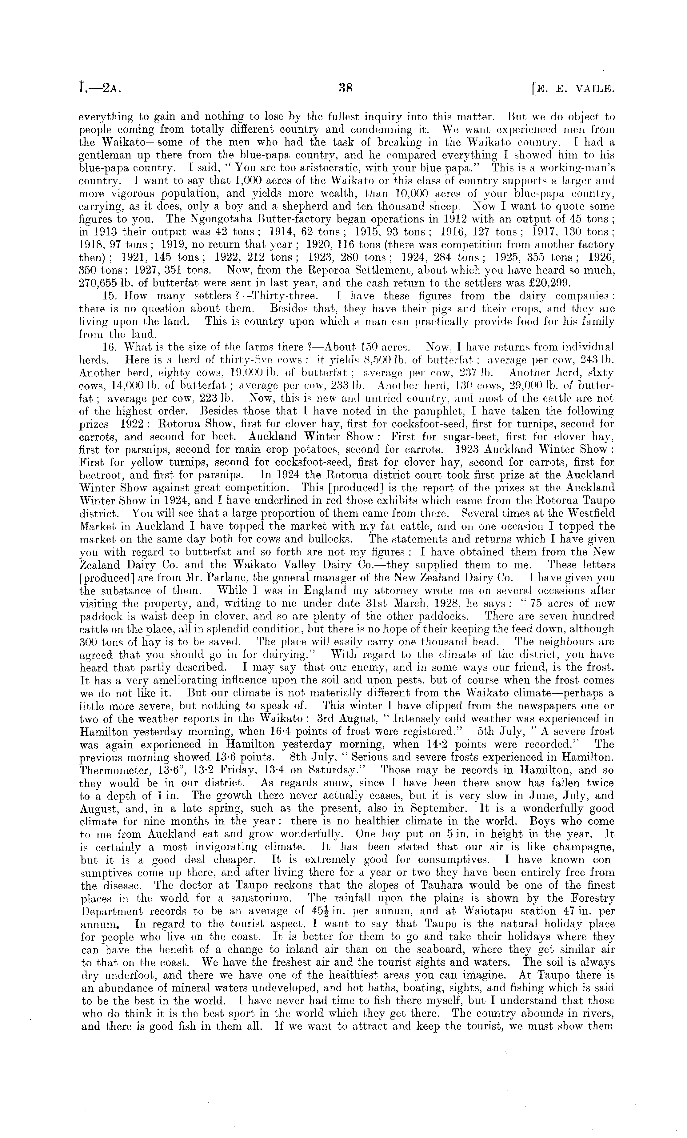 everything to gain and nothing to lose by the fullest inquiry into this matter. But we do object to people coming from totally different country and condemning it. Wo want experienced men from the Waikato—some of the men who had the task of breaking in the Waikat.o country. I had a gentleman up there from the blue-papa country, and he compared everything I showed him to his blue-papa country. I said, " You are too aristocratic, with your blue papa." This is a working-man's country. I want to say that 1,000 acres of the Waikato or this class of country supports a larger and more vigorous population, and yields more wealth, than 10,000 acres of your blue-papa country, carrying, as it does, only a boy and a shepherd and ten thousand sheep. Now I want to quote some figures to you. The Ngongotaha Butter-factory began operations in 1912 with an output of 45 tons ; in 1913 their output was 42 tons ; 1914, 62 tons ; 1915, 93 tons ; 1916, 127 tons ; 1917, 130 tons ; 1918, 97 tons ; 1919, no return that year ; 1920, 116 tons (there was competition from another factory then); 1921, 145 tons; 1922, 212 tons; 1923, 280 tons; 1924, 284 tons; 1925, 355 tons; 1926, 350 tons; 1927, 351 tons. Now, from the Reporoa Settlement, about which you have heard so much, 270,655 lb. of butterfat were sent in last year, and the cash return to the settlers was £20,299. 15. How many settlers ? —Thirty-three. I have these figures from the dairy companies: there is no question about them. Besides that, they have their pigs and tlxeir crops, and they are living upon the land. This is country upon which a man can practically provide food for his family from the land. 16. What is the size of the farms there ? —About 150 acres. Now, I have returns from individual herds. Here is a herd of thirty-five cows : it yields 8,500 lb. of butterfat; average per cow, 243 lb. Another herd, eighty cows, 19,000 lb. of butterfat ; average per cow, 237 lb. Another herd, stxty cows, 14,0001b. of butterfat; average per cow, 2331b. Another herd, 130 cows, 29,0001b. of butterfat ; average per cow, 223 lb. Now, this is new and untried country, and most of the cattle are not of the highest order. Besides those that 1 have noted in the pamphlet, I have taken the following prizes—l 922 : Rotorua Show, first for clover hay, first for cocksfoot-seed, first for turnips, second for carrots, and second for beet. Auckland Winter Show : First for sugar-beet, first for clover hay, first for parsnips, second for main crop potatoes, second for carrots. 1923 Auckland Winter Show : First for yellow turnips, second for cocksfoot-seed, first for clover hay, second for carrots, first for beetroot, and first for parsnips. In 1924 the Rotorua district court took first prize at the Auckland Winter Show against great competition. This [produced] is the report of the prizes at the Auckland Winter Show in 1924, and I have underlined in red those exhibits which came from the Rotorua-Taupo district. You will see that a large proportion of them came from there. Several times at the Westfield Market in Auckland I have topped the market with my fat cattle, and on one occasion I topped the market on the same day both for cows and bullocks. The statements and returns which I have given you with regard to butterfat and so forth are not my figures : I have obtained them from the New Zealand Dairy Co. and the Waikato Valley Dairy Co. —they supplied them to me. These letters [produced] are from Mr. Parlane, the general manager of the New Zealand Dairy Co. I have given you the substance of them. While I was in England my attorney wrote me on several occasions after visiting the property, and, writing to me under date 31st March, 1928, he says : "75 acres of new paddock is waist-deep in clover, and so are plenty of the other paddocks. There are seven hundred cattle on the place, all in splendid condition, but there is no hope of their keeping the feed down, although 300 tons of hay is to be saved. The place will easily carry one thousand head. The neighbours are agreed that you should go in for dairying." With regard to the climate of the district, you have heard that partly described. I may say that our enemy, and in some ways our friend, is the frost. It has a very ameliorating influence upon the soil and upon pests, but of course when the frost comes we do not like it. But our climate is not materially different from the Waikato climate —perhaps a little more severe, but nothing to speak of. This winter I have clipped from the newspapers one or two of the weather reports in the Waikato : 3rd August, " Intensely cold weather was experienced in Hamilton yesterday morning, when 16-4 points of frost were registered." sth July, " A severe frost was again experienced in Hamilton yesterday morning, when 14-2 points were recorded." The previous morning showed 13-6 points. Bth July, " Serious and severe frosts experienced in Hamilton. Thermometer, 13-6°, 13-2 Friday, 13-4 on Saturday." Those may be records in Hamilton, and so they would be in our district. As regards snow, since I have been there snow has fallen twice to a depth of 1 in. The growth there never actually ceases, but it is very slow in June, July, and August, and, in a late spring, such as the present, also in September. It is a wonderfully good climate for nine months in the year : there is no healthier climate in the world. Boys who come to me from Auckland eat and grow wonderfully. One boy put on 5 in. in height in the year. It is certainly a most invigorating climate. It has been stated that our air is like champagne, but it is a good deal cheaper. It is extremely good for consumptives. I have known con sumptives come up there, and after living there for a year or two they have been entirely free from the disease. The doctor at Taupo reckons that the slopes of Tauhara would be one of the finest places in the world for a sanatorium. The rainfall upon the plains is shown by the Forestry Department records t