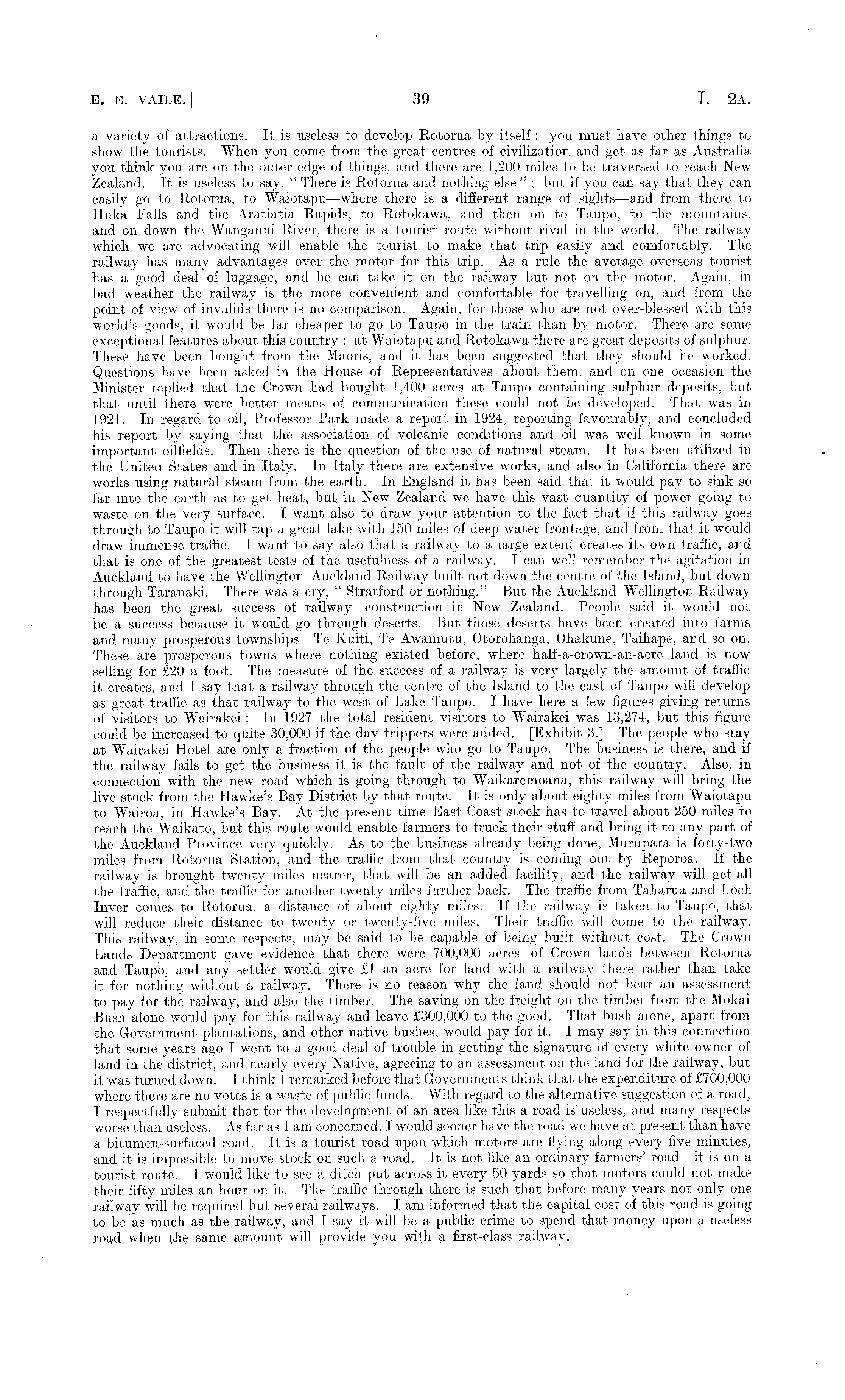a variety of attractions. It is useless to develop Rotorua by itself : you must have other things to show the tourists. When you come from the great centres of civilization and get as far as Australia you think you are on the outer edge of things, and there are 1,200 miles to be traversed to reach New Zealand. It is useless to say, " There is Rotorua and nothing else " ; but if you can say that they can easily go to Rotorua, to Waiotapu-—where there is a different range of sights—and from there to Huka Falls and the Aratiatia Rapids, to Rotokawa, and then on to Taupo, to the mountains, and on down the Wanganui River, there is a tourist route without rival in the world. The railway which we are advocating will enable the tourist to make that trip easily and comfortably. The railway has many advantages over the motor for this trip. As a rule the average overseas tourist has a good deal of luggage, and he can take it on the railway but not on the motor. Again, in bad weather the railway is the more convenient and comfortable for travelling on, and from the point of view of invalids there is no comparison. Again, for those who are not over-blessed with this world's goods, it would be far cheaper to go to Taupo in the train than by motor. There are some exceptional features about this country : at Waiotapu and Rotokawa there are great deposits of sulphur. These have been bought from the Maoris, and it has been suggested that they should be worked. Questions have been asked in the House of Representatives about them, and on one occasion the Minister replied that the Crown had bought 1,400 acres at Taupo containing sulphur deposits, but that until there were better means of communication these could not be developed. That was in 1921. In regard to oil, Professor Park made a report in 1924, reporting favourably, and concluded his report by saying that the association of volcanic conditions and oil was well known in some important oilfields. Then there is the question of the use of natural steam. It has been utilized in the United States and in Italy. In Italy there are extensive works, and also in California there are works using natural steam from the earth. In England it has been said that it would pay to sink so far into the earth as to get heat, but in New Zealand we have this vast quantity of power going to waste on the very surface. I want also to draw your attention to the fact that if this railway goes through to Taupo it will tap a great lake with 150 miles of deep water frontage, and from that it would draw immense traffic. I want to say also that a railway to a large extent creates its own traffic, and that is one of the greatest tests of the usefulness of a railway. I can well remember the agitation in Auckland to have the Wellington-Auckland Railway built not down the centre of the Island, but down through Taranaki. There was a cry, " Stratford or nothing." But the Auckland-Wellington Railway has been the great success of railway - construction in New Zealand. People said it would not be a success because it would go through deserts. But those deserts have been created into farms and many prosperous townships—Te Kuiti, Te Awamutu, Otorohanga, Ohakune, Taihape, and so on. These are prosperous towns where nothing existed before, where half-a-crown-an-acre land is now selling for £20 a foot. The measure of the success of a railway is very largely the amount of traffic it creates, and I say that a railway through the centre of the Island to the east of Taupo will develop as great traffic as that railway to the west of Lake Taupo. I have here a few figures giving returns of visitors to Wairakei : In 1927 the total resident visitors to Wairakei was 13,274, but this figure could be increased to quite 30,000 if the day trippers were added. [Exhibit 3.] The people who stay at Wairakei Hotel are only a fraction of the people who go to Taupo. The business is there, and if the railway fails to get the business it is the fault of the railway and not of the country. Also, in connection with the new road which is going through to Waikaremoana, this railway will bring the live-stock from the Hawke's Bay District by that route. It is only about eighty miles from Waiotapu to Wairoa, in Hawke's Bay. At the present time East Coast stock has to travel about 250 miles to reach the Waikato, but this route would enable farmers to truck their stuff and bring it to any part of the Auckland Province very quickly. As to the business already being done, Murupara is forty-two miles from Rotorua Station, and the traffic from that country is coming out by Reporoa. If the railway is brought twenty miles nearer, that will be an added facility, and the railway will get all the traffic, and the traffic for another twenty miles further back. The traffic from Taharua and Loch Inver comes to Rotorua, a distance of about eighty miles. If the railway is taken to Taupo, that will reduce their distance to twenty or twenty-five miles. Their traffic will come to the railway. This railway, in some respects, may be said to be capable of being built without cost. The Crown Lands Department gave evidence that there were 700,000 acres of Crown lands between Rotorua and Taupo, and any settler would give £1 an acre for land with a railway there rather than take it for nothing without a railway. There is no reason why the land should not bear an assessment to pay for the railway, and also the timber. The saving on the freight on the timber from the Mokai Bush alone would pay for this railway and leave £300,000 to the good. That bush alone, apart from the Government plantations, and other native bushes, would pay for it. 1 may say in this connection that some years ago I went to a good deal of trouble in getting the signature of every white owner of land in the district, and nearly every Native, agreeing to an assessment on the land for the railway, but it was turned down. I think I remarked before that Governments think that 
