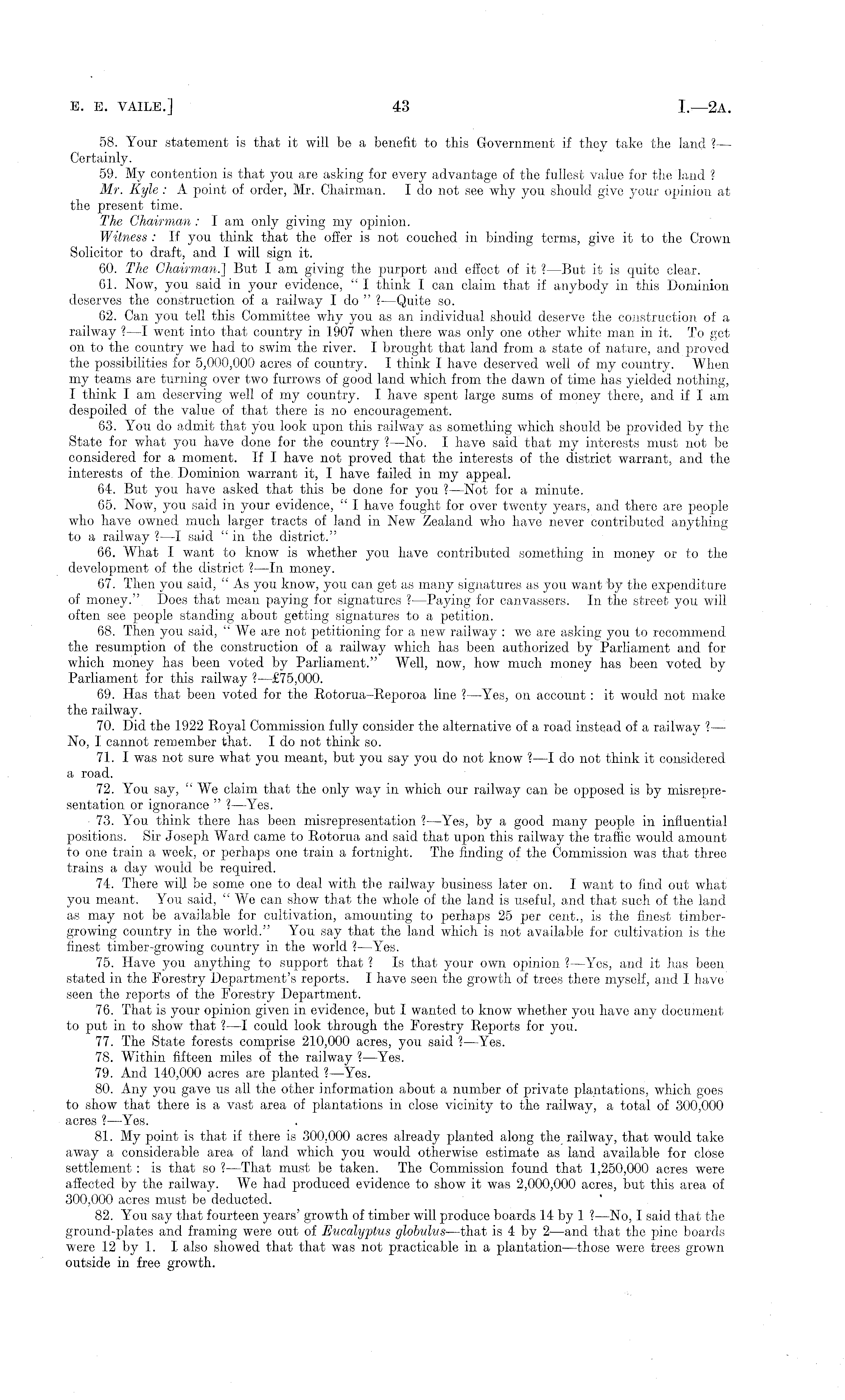 58. Your statement is that it will be a benefit to this Government if they take the land ?— Certainly. 59. My contention is that you are asking for every advantage of the fullest value for the land ? Mr. Kyle: A point of order, Mr. Chairman. Ido not see why you should give your opinion at the present time. The Chairman : I am only giving my opinion. Witness : If you think that the offer is not couched in binding terms, give it to the Crown Solicitor to draft, and I will sign it. 60. The Chairman.] But lam giving the purport and effect of it ? —But it is quite clear. 61. Now, you said in your evidence, " I think I can claim that if anybody in this Dominion deserves the construction of a railway I do " ? —Quite so. 62. Can you tell this Committee why you as an individual should deserve the construction of a railway ? —I went into that country in 1907 when there was only one other white man in it. To get on to the country we had to swim the river. I brought that land from a state of nature, and proved the possibilities for 5,000,000 acres of country. I think I have deserved well of my country. When my teams are turning over two furrows of good land which from the dawn of time has yielded nothing, I think I am deserving well of my country. I have spent large sums of money there, and if 1 am despoiled of the value of that there is no encouragement. 63. You do admit that you look upon this railway as something which should be provided by the State for what you have done for the country ? —No. I have said that my interests must not be considered for a moment. If I have not proved that the interests of the district warrant, and the interests of the Dominion warrant it, I have failed in my appeal. 64. But you have asked that this be done for you ?—Not for a minute. 65. Now, you said in your evidence, " I have fought for over twenty years, and there are people who have owned much larger tracts of land in New Zealand who have never contributed anything to a railway ?—I said " in the district." 66. What I want to know is whether you have contributed something in money or to the development of the district ? —ln money. 67. Then you said, " As you know, you can get as many signatures as you want by the expenditure of money." Does that mean paying for signatures ? —Paying for canvassers. In the street you will often see people standing about getting signatures to a petition. 68. Then you said, " We are not petitioning for a new railway : we are asking you to recommend the resumption of the construction of a railway which has been authorized by Parliament and for which money has been voted by Parliament." Well, now, how much money has been voted by Parliament for this railway ? —£75,000. 69. Has that been voted for the Rotorua-Reporoa line ? —Yes, on account : it would not make the railway. 70. Did the 1922 Royal Commission fully consider the alternative of a road instead of a railway ?— No, I cannot remember that. Ido not think so. 71. I was not sure what you meant, but you say you do not know ? —I do not think it considered a road. 72. You say, " We claim that the only way in which our railway can be opposed is by misrepresentation or ignorance " ? —Yes. 73. You think there has been misrepresentation ? —Yes, by a good many people in influential positions. Sir Joseph Ward came to Rotorua and said that upon this railway the traffic would amount to one train a week, or perhaps one train a fortnight. The finding of the Commission was that three trains a day would be required. 74. There will be some one to deal with the railway business later on. I want to find out what you meant. You said, "We can show that the whole of the land is useful, and that such of the land as may not be available for cultivation, amounting to perhaps 25 per cent., is the finest timbergrowing country in the world." You say that the land which is not available for cultivation is the finest timber-growing country in the world ?—Yes. 75. Have you anything to support that ? Is that your own opinion ? —Yes, and it has been stated in the Forestry Department's reports. I have seen the growth of trees there myself, and I have seen the reports of the Forestry Department. 76. That is your opinion given in evidence, but I wanted to know whether you have any document to put in to show that ?—I could look through the Forestry Reports for you. 77. The State forests comprise 210,000 acres, you said?— Yes. 78. Within fifteen miles of the railway ? —Yes. 79. And 140,000 acres are planted ?—Yes. 80. Any you gave us all the other information about a number of private plantations, which goes to show that there is a vast area of plantations in close vicinity to the railway, a total of 300,000 acres ? —Yes. 81. My point is that if there is 300,000 acres already planted along the railway, that would take away a considerable area of land which you would otherwise estimate as land available for close settlement : is that so ? —That must be taken. The Commission found that 1,250,000 acres were affected by the railway. We had produced evidence to show it was 2,000,000 acres, but this area of 300,000 acres must be deducted. 82. You say that fourteen years' growth of timber will produce boards 14 by 1 ? —No, I said that the ground-plates and framing were out of Eucalyptus globulus—that is 4 by 2—and that the pine boards were 12 by 1. I also showed that that was not practicable in a plantation-—those were trees grown outside in free growth.