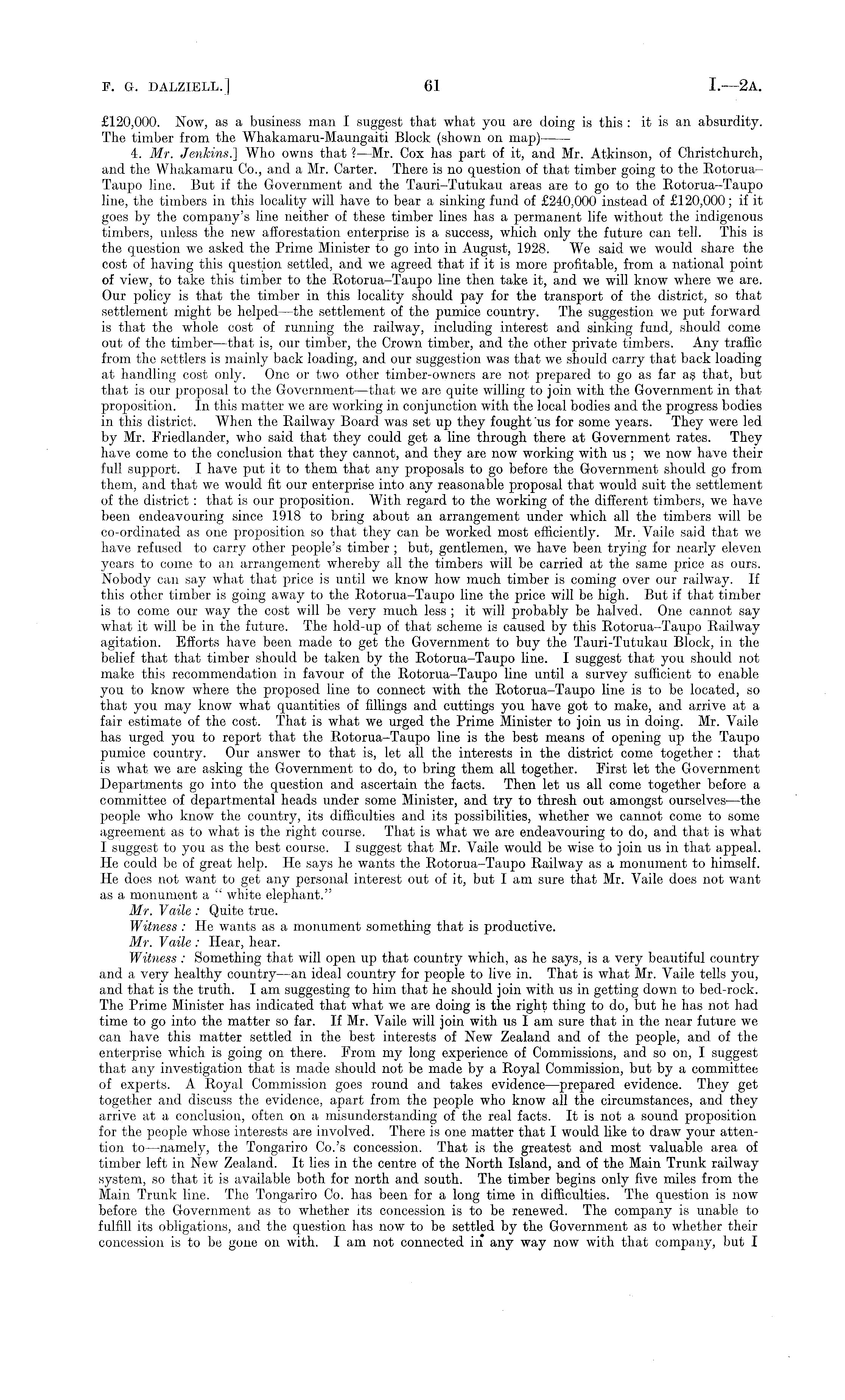£120,000. Now, as a business man I suggest that what you are doing is this : it is an absurdity. The timber from the Whakamaru-Maungaiti Block (shown on map) 4. Mr. Jenkins.'] Who owns that ?—Mr. Cox has part of it, and Mr. Atkinson, of Christchurch, and the Whakamaru Co., and a Mr. Carter. There is no question of that timber going to the RotoruaTaupo line. But if the Government and the Tauri-Tutukau areas are to go to the Rotorua-Taupo line, the timbers in this locality will have to bear a sinking fund of £240,000 instead of £120,000; if it goes by the company's line neither of these timber lines has a permanent life without the indigenous timbers, unless the new afforestation enterprise is a success, which only the future can tell. This is the question we asked the Prime Minister to go into in August, 1928. We said we would share the cost of having this question settled, and we agreed that if it is more profitable, from a national point of view, to take this timber to the Rotorua-Taupo line then take it, and we will know where we are. Our policy is that the timber in this locality should pay for the transport of the district, so that settlement might be helped —the settlement of the pumice country. The suggestion we put forward is that the whole cost of running the railway, including interest and sinking fund, should come out of the timber —that is, our timber, the Crown timber, and the other private timbers. Any traffic from the settlers is mainly back loading, and our suggestion was that we should carry that back loading at handling cost only. One or two other timber-owners are not prepared to go as far a§ that, but that is our proposal to the Government —that we are quite willing to join with the Government in that proposition. In this matter we are working in conjunction with the local bodies and the progress bodies in this district. When the Railway Board was set up they fought us for some years. They were led by Mr. Friedlander, who said that they could get a line through there at Government rates. They have come to the conclusion that they cannot, and they are now working with us ; we now have their full support. I have put it to them that any proposals to go before the Government should go from them, and that we would fit our enterprise into any reasonable proposal that would suit the settlement of the district: that is our proposition. With regard to the working of the different timbers, we have been endeavouring since 1918 to bring about an arrangement under which all the timbers will be co-ordinated as one proposition so that they can be worked most efficiently. Mr. Vaile said that we have refused to carry other people's timber ; but, gentlemen, we have been trying for nearly eleven years to come to an arrangement whereby all the timbers will be carried at the same price as ours. Nobody can say what that price is until we know how much timber is coming over our railway. If this other timber is going away to the Rotorua-Taupo line the price will be high. But if that timber is to come our way the cost will be very much less ; it will probably be halved. One cannot say what it will be in the future. The hold-up of that scheme is caused by this Rotorua-Taupo Railway agitation. Efforts have been made to get the Government to buy the Tauri-Tutukau Block, in the belief that that timber should be taken by the Rotorua-Taupo line. I suggest that you should not make this recommendation in favour of the Rotorua-Taupo line until a survey sufficient to enable you to know where the proposed line to connect with the Rotorua-Taupo line is to be located, so that you may know what quantities of fillings and cuttings you have got to make, and arrive at a fair estimate of the cost. That is what we urged the Prime Minister to join us in doing. Mr. Yaile has urged you to report that the Rotorua-Taupo line is the best means of opening up the Taupo pumice country. Our answer to that is, let all the interests in the district come together : that is what we are asking the Government to do, to bring them all together. First let the Government Departments go into the question and ascertain the facts. Then let us all come together before a committee of departmental heads under some Minister, and try to thresh out amongst ourselves-—the people who know the country, its difficulties and its possibilities, whether we cannot come to some agreement as to what is the right course. That is what we are endeavouring to do, and that is what I suggest to you as the best course. I suggest that Mr. Vaile would be wise to join us in that appeal. He could be of great help. He says he wants the Rotorua-Taupo Railway as a monument to himself. He does not want to get any personal interest out of it, but I am sure that Mr. Yaile does not want as a monument a " white elephant." Mr. Vaile : Quite true. Witness : He wants as a monument something that is productive. Mr. Vaile : Hear, hear. Witness : Something that will open up that country which, as he says, is a very beautiful country and a very healthy country —an ideal country for people to live in. That is what Mr. Yaile tells you, and that is the truth. lam suggesting to him that he should join with us in getting down to bed-rock. The Prime Minister has indicated that what we are doing is the right thing to do, but he has not had time to go into the matter so far. If Mr. Vaile will join with us lam sure that in the near future we can have this matter settled in the best interests of New Zealand and of the people, and of the enterprise which is going on there. From my long experience of Commissions, and so on, I suggest that any investigation that is made should not be made by a Royal Commission, but by a committee of experts. A Royal Commission goes round and takes evidence —prepared evidence. They get together and discuss the evidence, apart from the people who know all the circumstances, and they arrive at a conclusion, often on a misunderstanding of t