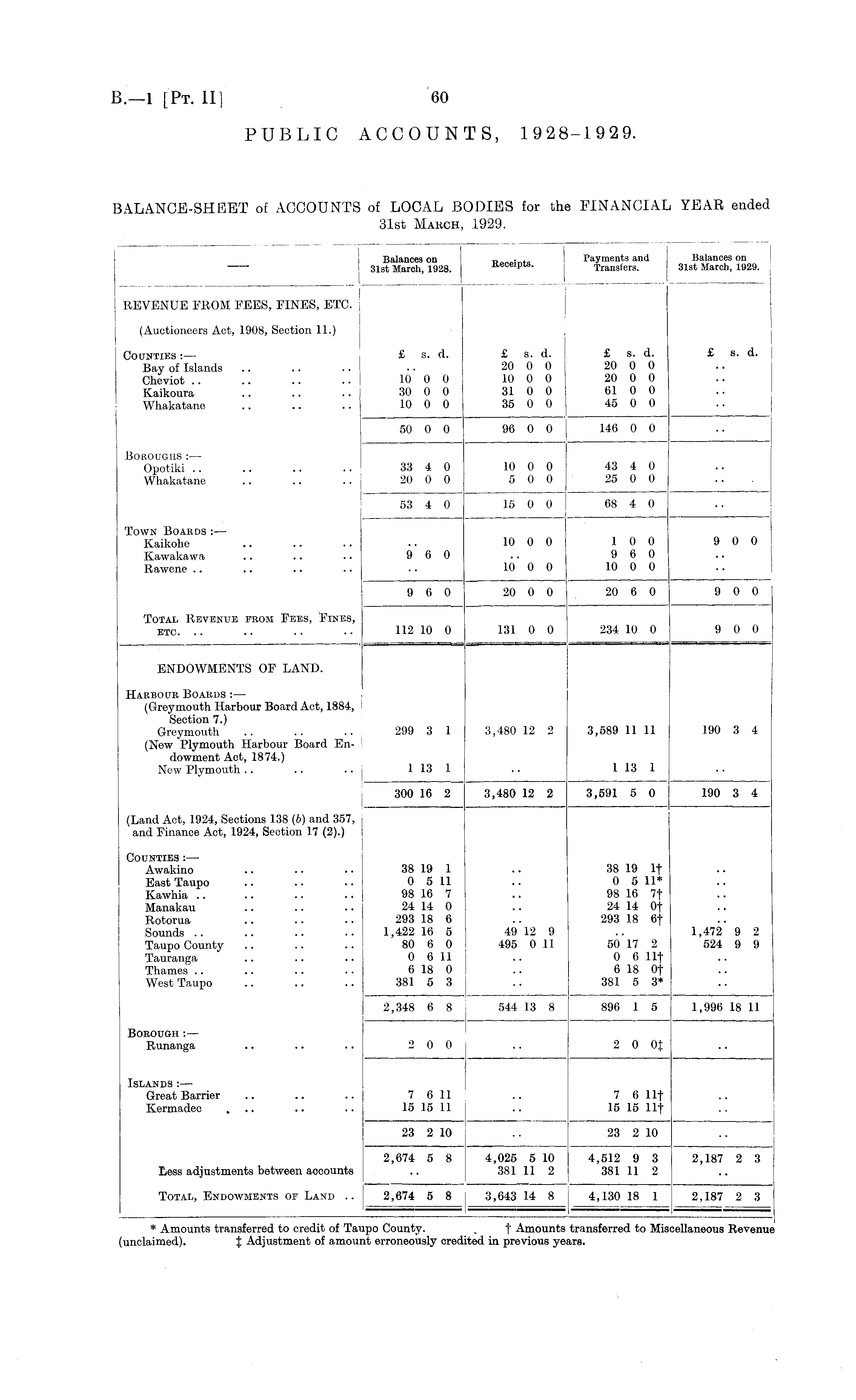 Balances on Payments and Balances on 31st March, 1928. • Transfers. 31st March, 1929. REVENUE FROM FEES, FINES, ETC. (Auctioneers Act, 1908, Section 11.) Counties :— £ s. d. £ s. d. £ s. d. £ s. d. Bay of Islands .. .. ■ • • • 20 0 0 20 0 0 Cheviot .. .. .. . • 10 0 0 10 0 0 20 0 0 Kaikoura .. .. .. 30 0 0 31 0 0 61 0 0 Whakatane .. .. .. 10 0 0 35 0 0 45 0 0 50 0 0 96 0 0 146 0 0 Boroughs : — Opotiki .. .. .. .. 33 4 0 10 0 0 43 4 0 Whakatane .. .. .. 20 00 500 25 00 53 4 0 15 0 0 68 4 0 Town Boards : — Kaikohe .. 10 00 100 900 Kawakawa .. .. .. 960 .. 960 Rawene .. .. .. .. .. 10 0 0 10 0 0 9 6 0 20 0 0 20 6 0 9 0 0 Total Revenue mom Fees, Fines, ETC. .. .. .. .. 112 10 0 131 0 0 234 10 0 9 0 0 ENDOWMENTS OF LAND. Harbour Boards :—• (Greymouth Harbour Board Act, 1884, Section 7.) Greymouth .. .. .. 299 3 1 3,480 12 2 3,589 11 11 190 3 4 (New Plymouth Harbour Board Endowment Act, 1874.) New Plymouth.. .. .. 1 13 1 .. 1 13 1 300 16 2 3,480 12 2 3,591 5 0 190 3 4 (Land Act, 1924, Sections 138 (6) and 357, and Finance Act, 1924, Section 17 (2).) Counties :— Awakino .. .. • • 38 19 1 .. 38 19 If East Taupo .. .. .. 0 5 11 .. 0 5 11* Kawhia .. .. .. .. 98 16 7 .. 98 16 7f Manakau .. .. ■. 24 14 0 .. 24 14 0j" Rotorua .. .. .. 293 18 6 .. 293 18 6f Sounds .. .. .. .. 1,422 16 5 49 12 9 .. 1,472 9 2 Taupo County .. .. .. 80 6 0 495 0 11 50 17 2 524 9 9 Tauranga .. .. .. 0611 .. 061If Thames .. .. .. .. 6 18 0 .. 6 18 Of West Taupo .. .. .. 381 5 3 .. 381 5 3* 2,348 6 8 544 13 8 896 1 5 1,996 18 11 Borough:— Runanga .. .. .. 200 .. 2 0 0{ Islands :— Great Barrier .. .. .. 7611 .. 761 If Kermadec ... .. .. 15 15 11 .. 15 15 1 If 23 2 10 . . 23 2 10 2,674 5 8 4,025 5 10 4,512 9 3 2,187 2 3 Less adjustments between aocounts .. 381 11 2 381 11 2 Total, Endowments oe Land .. 2,674 5 8 ; 3,643 14 8 4,130 18 1 2,187 2 3 * Amounts transferred to credit of Taupo County. _ f Amounts transferred to Miscellaneous Revenue (unclaimed). t Adjustment of amount erroneously credited in previous years.