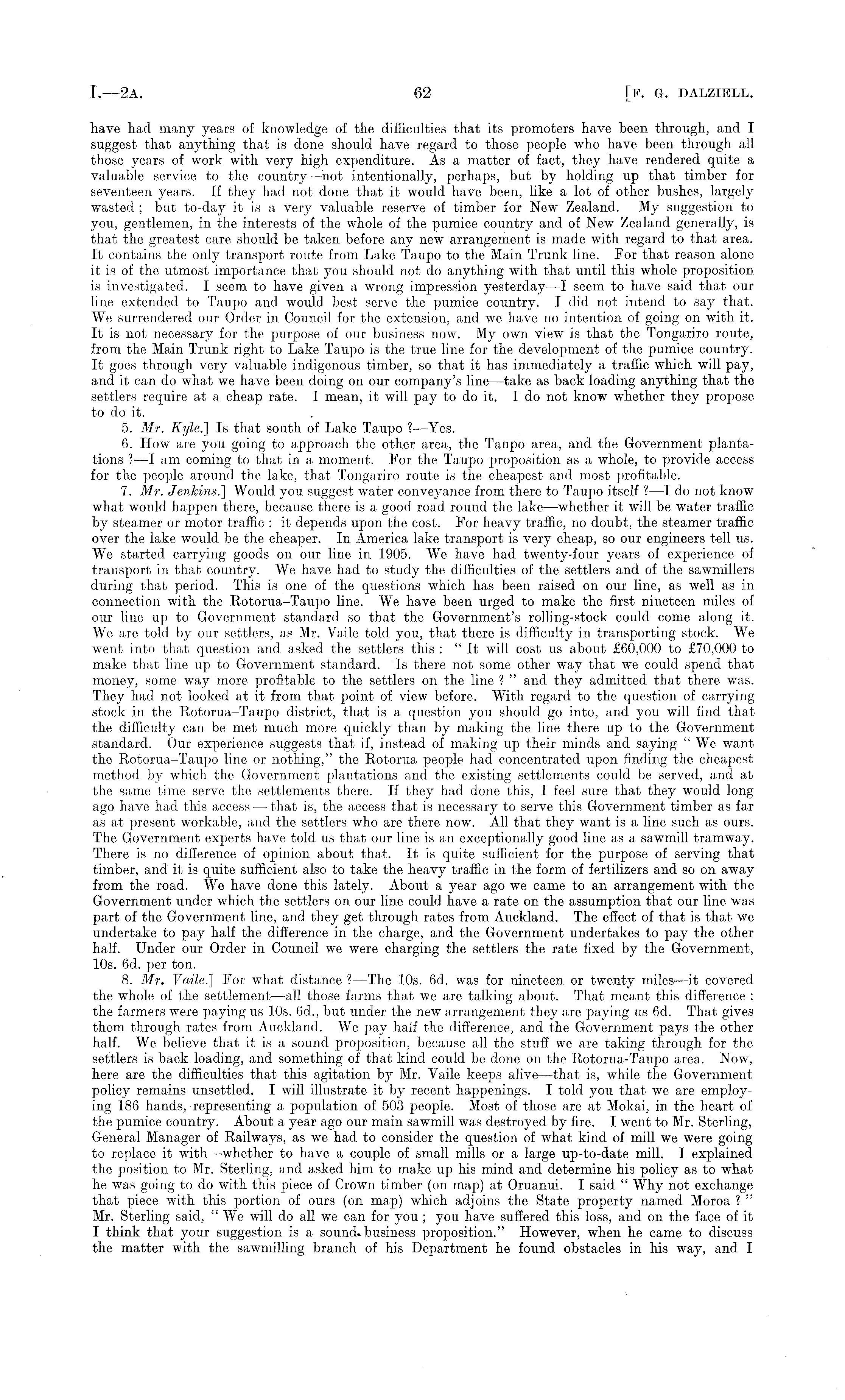 have had many years of knowledge of the difficulties that its promoters have been through, and I suggest that anything that is done should have regard to those people who have been through all those years of work with very high expenditure. As a matter of fact, they have rendered quite a valuable service to the country —not intentionally, perhaps, but by holding up that timber for seventeen years. If they had not done that it would have been, like a lot of other bushes, largely wasted ; but to-day it is a very valuable reserve of timber for New Zealand. My suggestion to you, gentlemen, in the interests of the whole of the pumice country and of New Zealand generally, is that the greatest care should be taken before any new arrangement is made with regard to that area. It contains the only transport route from Lake Taupo to the Main Trunk line. For that reason alone it is of the utmost importance that you should not do anything with that until this whole proposition is investigated. I seem to have given a wrong impression yesterday —I seem to have said that our line extended to Taupo and would best serve the pumice country. I did not intend to say that. We surrendered our Order in Council for the extension, and we have no intention of going 011 with it. It is not necessary for the purpose of our business now. My own view is that the Tongariro route, from the Main Trunk right to Lake Taupo is the true line for the development of the pumice country. It goes through very valuable indigenous timber, so that it has immediately a traffic which will pay, and it can do what we have been doing on our company's line —take as back loading anything that the settlers require at a cheap rate. I mean, it will pay to do it. Ido not know whether they propose to do it. 5. Mr. Kyle.] Is that south of Lake Taupo ? —Yes. 6. How are you going to approach the other area, the Taupo area, and the Government plantations ? —I am coming to that in a moment. For the Taupo proposition as a whole, to provide access for the people around the lake, that Tongariro route is the cheapest and most profitable. 7. Mr. Jenkins.] Would you suggest water conveyance from there to Taupo itself ?—I do not know what would happen there, because there is a good road round the lake —whether it will be water traffic by steamer or motor traffic : it depends upon the cost. For heavy traffic, no doubt, the steamer traffic over the lake would be the cheaper. In America lake transport is very cheap, so our engineers tell us. We started carrying goods 011 our line in 1905. We have had twenty-four years of experience of transport in that country. We have had to study the difficulties of the settlers and of the sawmillers during that period. This is one of the questions which has been raised on our line, as well as in connection with the Rotorua-Taupo line. We have been urged to make the first nineteen miles of our line up to Government standard so that the Government's rolling-stock could come along it. We are told by our settlers, as Mr. Vaile told you, that there is difficulty in transporting stock. We went into that question and asked the settlers this : "It will cost us about £60,000 to £70,000 to make that line up to Government standard. Is there not some other way that we could spend that money, some way more profitable to the settlers on the line ? " and they admitted that there was. They had not looked at it from that point of view before. With regard to the question of carrying stock in the Rotorua-Taupo district, that is a question you should go into, and you will find that the difficulty can be met much more quickly than by making the line there up to the Government standard. Our experience suggests that if, instead of making up their minds and saying "We want the Rotorua-Taupo line or nothing," the Rotorua people had concentrated ujion finding the cheapest method by which the Government plantations and the existing settlements could be served, and at the same time serve the settlements there. If they had done this, I feel sure that they would long ago have had this access — that is, the access that is necessary to serve this Government timber as far as at present workable, and the settlers who are there now. All that they want is a line such as ours. The Government experts have told us that our line is an exceptionally good line as a sawmill tramway. There is no difference of opinion about that. It is quite sufficient for the purpose of serving that timber, and it is quite sufficient also to take the heavy traffic in the form of fertilizers and so on away from the road. We have done this lately. About a year ago we came to an arrangement with the Government under which the settlers on our line could have a rate on the assumption that our line was part of the Government line, and they get through rates from Auckland. The effect of that is that we undertake to pay half the difference in the charge, and the Government undertakes to pay the other half. Under our Order in Council we were charging the settlers the rate fixed by the Government, 10s. 6d. per ton. 8. Mr. Vaile.] For what distance ?—The 10s. 6d. was for nineteen or twenty miles —it covered the whole of the settlement—all those farms that we are talking about. That meant this difference : the farmers were paying us 10s. 6d., but under the new arrangement they are paying us 6d. That gives them through rates from Auckland. We pay haif the difference, and the Government pays the other half. We believe that it is a sound proposition, because all the stuff we are taking through for the settlers is back loading, and something of that kind could be done on the Rotorua-Taupo area. Now, here are the difficulties that this agitation by Mr. Vaile keeps alive —that is, while the Government policy remains unsettled. I will illustrate it by recent happenings. I told you that we are employing 186 hands, representing a population of 503 people. Most of those are at Mo