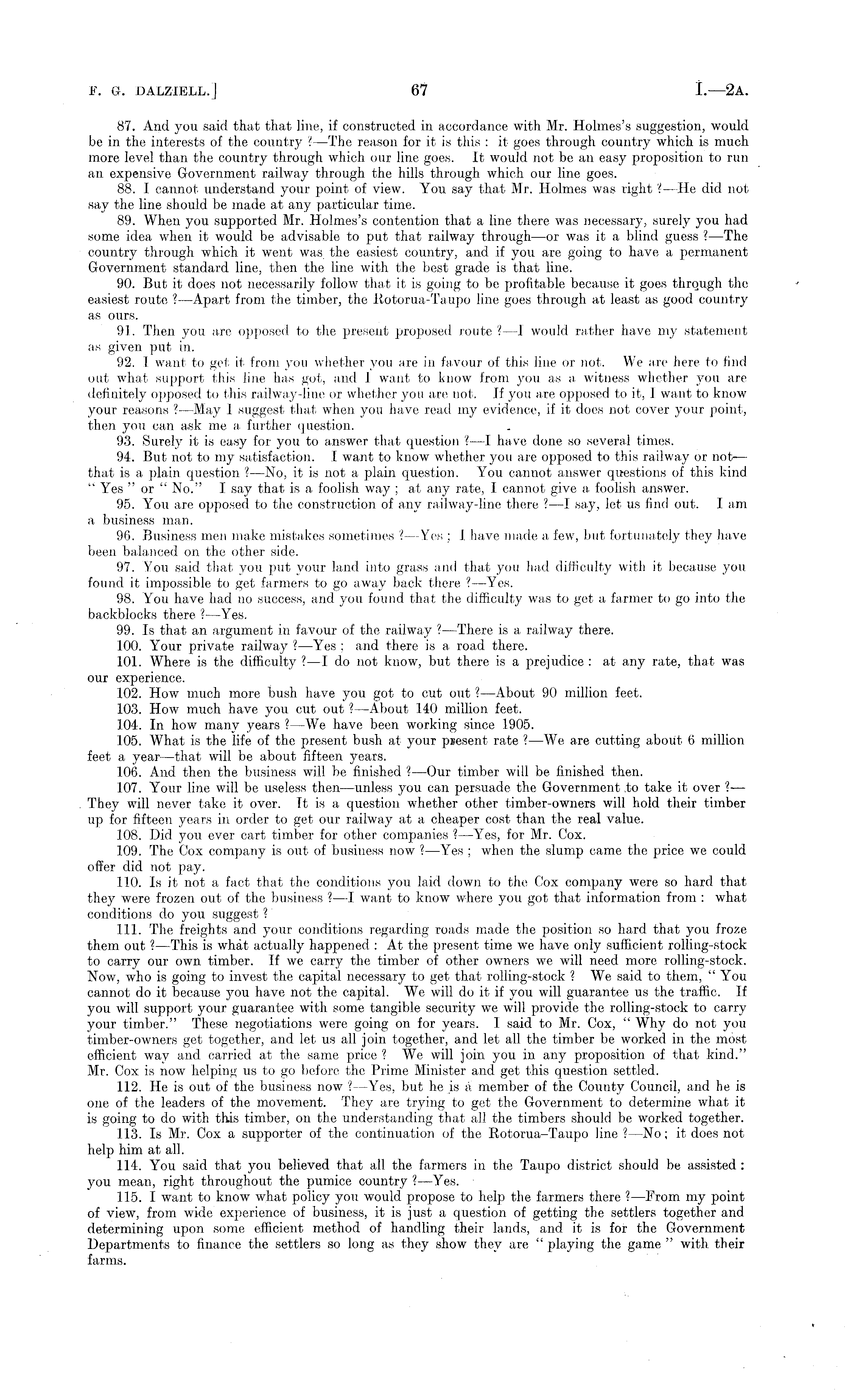 87. And you said that that line, if constructed in accordance with Mr. Holmes's suggestion, would be in the interests of the country ? —The reason for it is this : it goes through country which is much more level than the country through which our line goes. It would not be an easy proposition to run an expensive Government railway through the hills through which our line goes. 88. I cannot understand your point of view. You say that Mr. Holmes was right ? —He did not say the line should be made at any particular time. 89. When you supported Mr. Holmes's contention that a line there was necessary, surely you had some idea when it would be advisable to put that railway through —or was it a blind guess ? —The country through which it went was the easiest country, and if you are going to have a permanent Government standard line, then the line with the best grade is that line. 90. But it does not necessarily follow that it is going to be profitable because it goes through the easiest route ? —Apart from the timber, the Rotorua-Taupo line goes through at least as good country as ours. 91. Then you are opposed to the present proposed route ?—I would rather have my statement as given put in. 92. I want to get it from you whether you are in favour of this line or not. We are here to find out what support this line has got, and I want to know from you as a witness whether you are definitely opposed to this railway-line or whether you are not. If you are opposed to it, I want to know your reasons ? —May I suggest that when you have read my evidence, if it does not cover your point, then you can ask me a further question. 93. Surely it is easy for you to answer that question ?—I have done so several times. 94. But not to my satisfaction. I want to know whether you are opposed to this railway or not— that is a plain question ?—No, it is not a plain question. You cannot answer questions of this kind " Yes "or " No." I say that is a foolish way ; at any rate, I cannot give a foolish answer. 95. You are opposed to the construction of any railway-line there ?—I say, let us find out. lam a business man. 96. Business men make mistakes sometimes ? —Yes ; I have made a few, but fortunately they have been balanced on the other side. 97. You said that you put your land into grass and that you had difficulty with it because you found it impossible to get farmers to go away back there ?—Yes, 98. You have had no success, and you found that the difficulty was to get a farmer to go into the backblocks there ? —Yes. 99. Is that an argument in favour of the railway ?—There is a railway there. 100. Your private railway ? —Yes ; and there is a road there. 101. Where is the difficulty ? —I do not know, but there is a prejudice : at any rate, that was our experience. 102. How much more bush have you got to cut out ? —About 90 million feet. 103. How much have you cut out ?—About 140 million feet. 104. In how many years ? —We have been working since 1905. 105. What is the life of the present bush at your psesent rate ? —We are cutting about. 6 million feet a year —that will be about fifteen years. 106. And then the business will be finished ?—Our timber will be finished then. 107. Your line will be useless then —unless you can persuade the Government to take it over ?-— They will never take it over. Tt is a question whether other timber-owners will hold their timber up for fifteen years in order to get our railway at a cheaper cost than the real value. 108. Did you ever cart timber for other companies ?—Yes, for Mr. Cox. 109. The Cox company is out of business now ? —Yes ; when the slump came the price we could offer did not pay. 110. Is it not a fact that the conditions you laid down to the Cox company were so hard that they were frozen out of the business ? —I want to know where you got that information from : what conditions do you suggest ? 111. The freights and your conditions regarding roads made the position so hard that you froze them out ?—This is what actually happened : At the present time we have only sufficient rolling-stock to carry our own timber. If we carry the timber of other owners we will need more rolling-stock. Now, who is going to invest the capital necessary to get that rolling-stock ? We said to them, "You cannot do it because you have not the capital. We will do it if you will guarantee us the traffic. If you will support your guarantee with some tangible security w T e will provide the rolling-stock to carry your timber." These negotiations were going on for years. I said to Mr. Cox, " Why do not you timber-owners get together, and let us all join together, and let all the timber be worked in the most efficient way and carried at the same price ? We will join you in any proposition of that kind." Mr. Cox is now helping us to go before the Prime Minister and get this question settled. 112. He is out of the business now ?—Yes, but he is a member of the County Council, and he is one of the leaders of the movement. They are trying to get the Government to determine what it is going to do with this timber, on the understanding that all the timbers should be worked together. 113. Is Mr. Cox a supporter of the continuation of the Rotorua-Taupo line ?—No; it does not help him at all. 114. You said that you believed that all the farmers in the Taupo district should be assisted: you mean, right throughout the pumice country ?—Yes. 115. I want to know what policy you would propose to help the farmers there ?—From my point of view, from wide experience of business, it is just a question of getting the settlers together and determining upon some efficient method of handling their lands, and it is for the Government Departments to finance the settlers so long as they show they are " playing the game " with their farms.