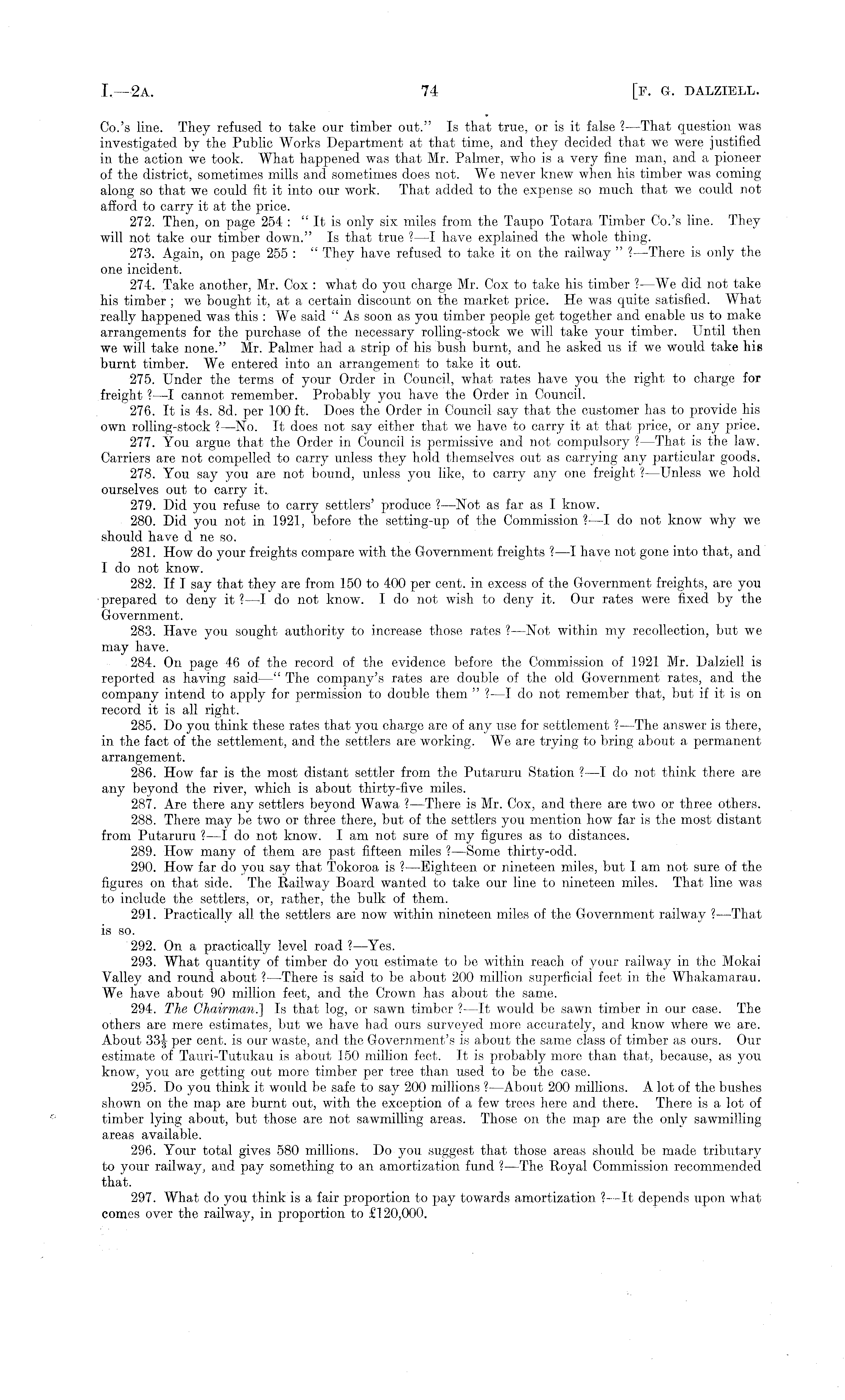 Co.'s line. They refused to take our timber out." Is that true, or is it false ?—That question was investigated by the Public Works Department at that time, and they decided that we were justified in the action we took. What happened was that Mr. Palmer, who is a very fine man, and a pioneer of the district, sometimes mills and sometimes does not. We never knew when his timber was coming along so that we could fit it into our work. That added to the expense so much that we could not afford to carry it at the price. 272. Then, on page 254 : "It is only six miles from the Taupo Totara Timber Co.'s line. They will not take our timber down." Is that true ?—I have explained the whole thing. 27-3. Again, on page 255 : " They have refused to take it on the railway " ? —There is only the one incident. 274. Take another, Mr. Cox : what do you charge Mr. Cox to take his timber ?—We did not take his timber ; we bought it, at a certain discount on the market price. He was quite satisfied. What really happened was this : We said " As soon as you timber people get together and enable us to make arrangements for the purchase of the necessary rolling-stock we will take your timber. Until then we will take none." Mr. Palmer had a strip of his bush burnt, and he asked us if we would take his burnt timber. We entered into an arrangement to take it out. 275. Under the terms of your Order in Council, what rates have you the right to charge for freight ?—-I cannot remember. Probably you have the Order in Council. 276. It is 4s. Bd. per 100 ft. Does the Order in Council say that the customer has to provide his own rolling-stock ? —No. It does not say either that we have to carry it at that price, or any price. 277. You argue that the Order in Council is permissive and not compulsory ? —That is the law. Carriers are not compelled to carry unless they hold themselves out as carrying any particular goods. 278. You say you are not bound, unless you like, to carry any one freight ? —Unless we hold ourselves out to carry it. 279. Did you refuse to carry settlers' produce ?—Not as far as I know. 280. Did you not in 1921, before the setting-up of the Commission ?—I do not know why we should have d ne so. 281. How do your freights compare with the Government freights ?—I have not gone into that, and I do not know. 282. If I say that they are from 150 to 400 per cent, in excess of the Government freights, are you prepared to deny it ? —I do not know. Ido not wish to deny it. Our rates were fixed by the Government. 283. Have you sought authority to increase those rates ? —Not within my recollection, but we may have. 284. On page 46 of the record of the evidence before the Commission of 1921 Mr. Dalziell is reported as having said—" The company's rates are double of the old Government rates, and the company intend to apply for permission to double them " ?—I do not remember that, but if it is on record it is all right. 285. Do you think these rates that you charge are of any use for settlement ? —The answer is there, in the fact of the settlement, and the settlers are working. We are trying to bring about a permanent arrangement. 286. How far is the most distant settler from the Putaruru Station ?—I do not think there are any beyond the river, which is about thirty-five miles. 287. Are there any settlers beyond Wawa ? —There is Mr. Cox, and there are two or three others. 288. There may be two or three there, but of the settlers you mention how far is the most distant from Putaruru ? —I do not know. I am not sure of my figures as to distances. 289. How many of them are past fifteen miles ? —Some thirty-odd. 290. How far do you say that Tokoroa is ?—Eighteen or nineteen miles, but I am not sure of the figures on that side. The Railway Board wanted to take our line to nineteen miles. That line was to include the settlers, or, rather, the bulk of them. 291. Practically all the settlers are now within nineteen miles of the Government railway ? —That is so. 292. On a practically level road ?—Yes. 293. What quantity of timber do you estimate to be within reach of your railway in the Mokai Valley and round about ? —There is said to be about 200 million superficial feet in the Whakamarau. We have about 90 million feet, and the Crown has about the same. 294. The Chairman.] Is that log, or sawn timber ?—lt would be sawn timber in our case. The others are mere estimates, but we have had ours surveyed more accurately, and know where we are. About 33 j per cent, is our waste, and the Government's is about the same class of timber as ours. Our estimate of Tauri-Tutukau is about 150 million feet. It is pirobably more than that, because, as you know, you are getting out more timber per tree than used to be the case. 295. Do you think it would be safe to say 200 millions ? —About 200 millions. A lot of the bushes shown on the map are burnt out, with the exception of a few trees here and there. There is a lot of timber lying about, but those are not sawmilling areas. Those on the map are the only sawmilling areas available. 296. Your total gives 580 millions. Do you suggest that those areas should be made tributary to your railway, and pay something to an amortization fund ? —The Poyal Commission recommended that. 297. What do you think is a fair proportion to pay towards amortization ?—lt depends upon what comes over the railway, in proportion to £120,000.