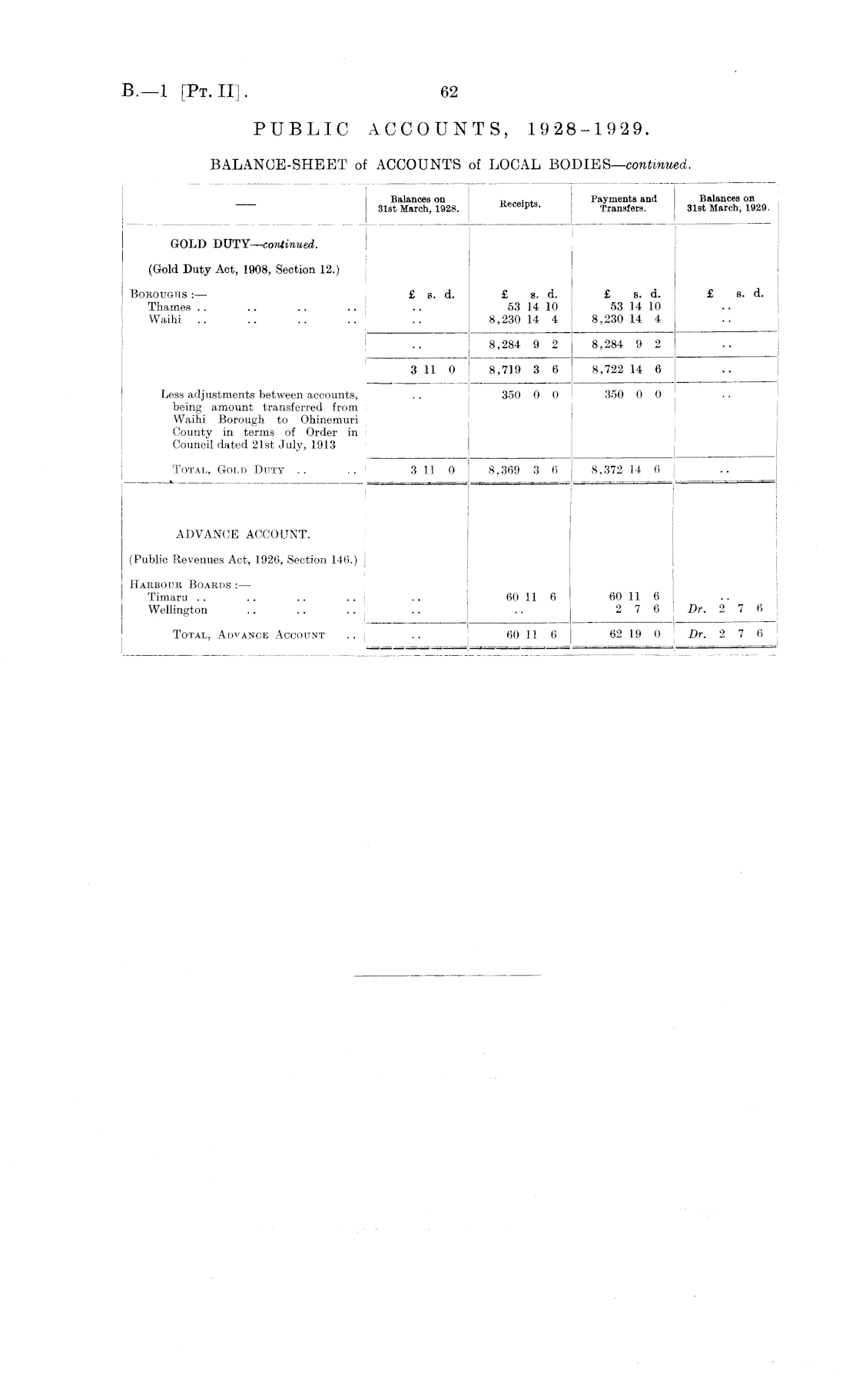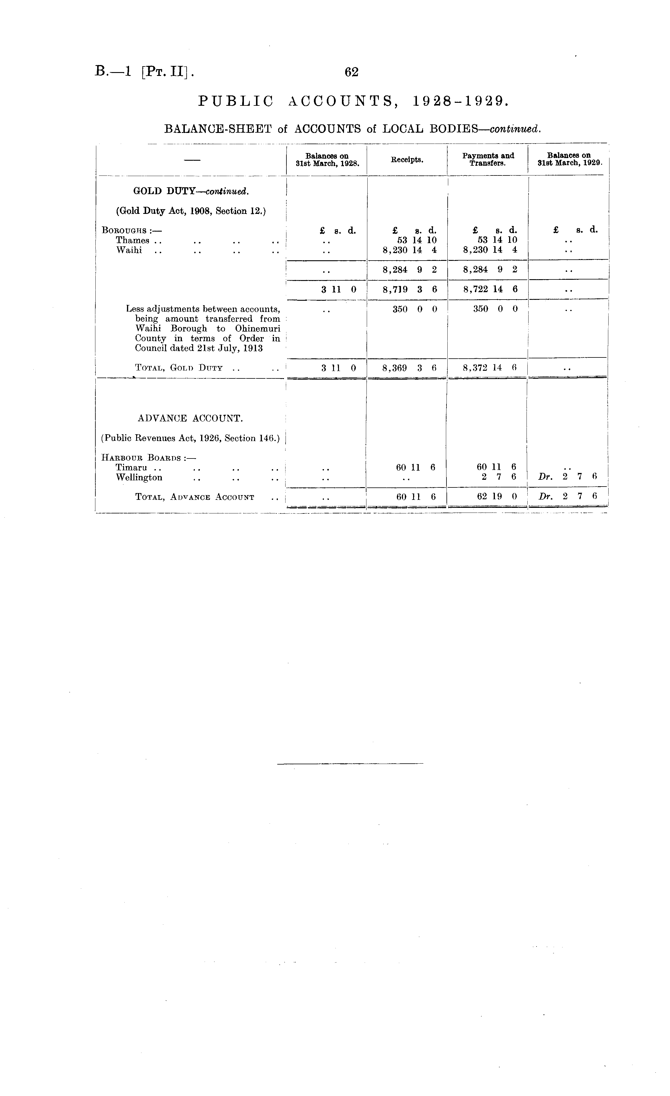 Balances on ■ , . Payments and Balances on 31st March, 1928. | receipts. Transfers. 31st March, 1929. GOLD DUTY—continued. (Gold Duty Act, 1908, Section 12.) Boroughs :— £ s. d. £ s. d. £ s. d. £ s. d. Thames .. .. .. .. .. 53 14 10 53 14 10 Waihi .. .. .. .. .. 8,230 14 4 8,230 14 4 8,284 9 2 8,284 9 2 3 11 0 8,719 3 6 8,722 14 6 Less adjustments between accounts, .. 350 0 0 350 0 0 being amount transferred from Waihi Borough to Ohinemuri County in terms of Order in Council dated 21st July, 1913 Total, GOLD DUTY .. .. 3 11 0 8,369 3 6 8,372 14 6 ADVANCE ACCOUNT. (Public Revenues Act, 1926, Section 146.) j Harbour Boards :— ■ Timaru .. .. .. .. .. 60 11 6 60 11 6 Wellington .. .. .. .. .. 276 Dr. 2 7 6 Total, Advance Account .. .. 1 60 11 6 62 19 0 Dr. 2 7 6 ..J '